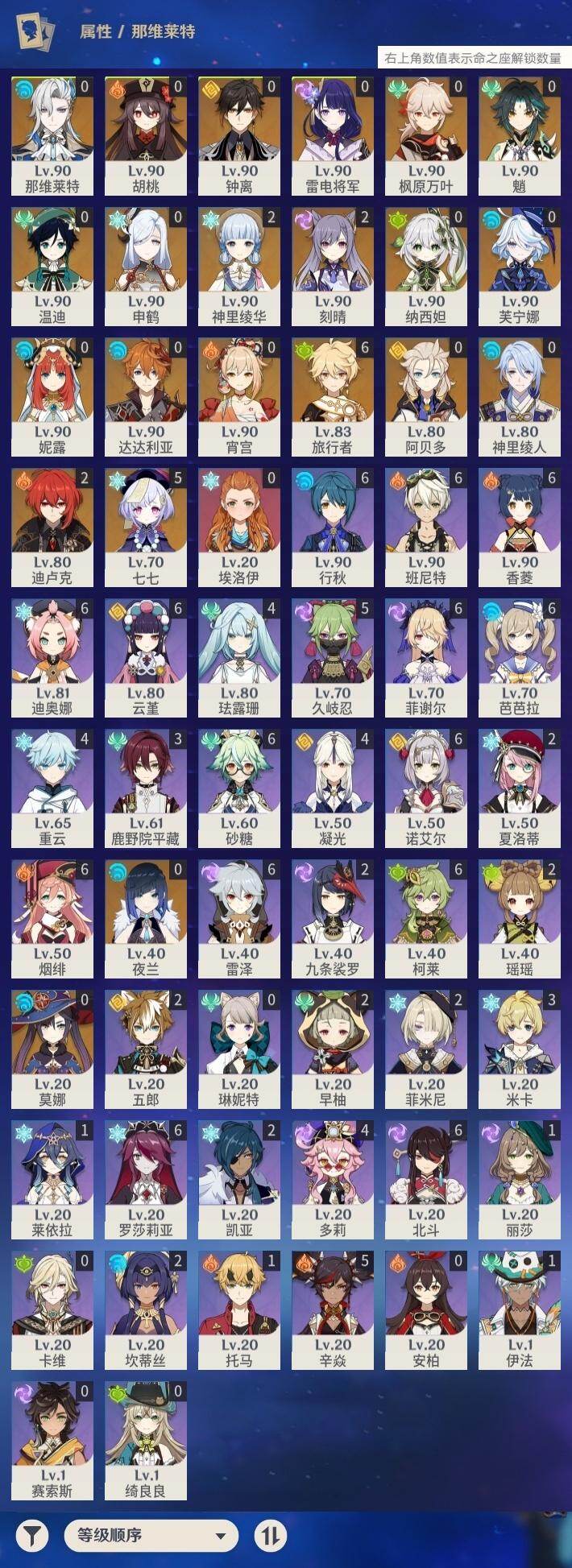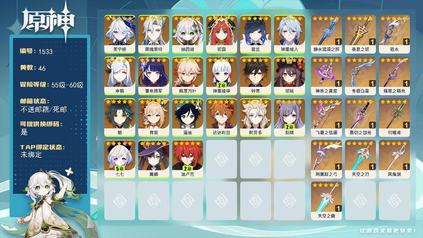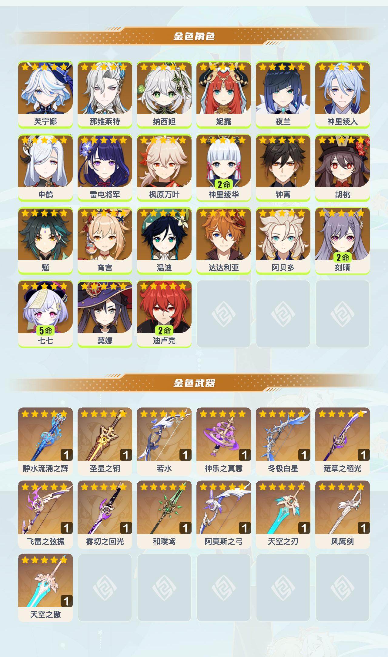 [15719731]60级/46黄/男主/21个五星角色/14个五星武器 0命芙宁娜0命那维莱特0命纳西妲0命妮露0命夜兰0命神里绫人0命申鹤0命雷电将军0命枫原万叶2命神里绫华0命钟离0命胡桃0命魈0命宵宫0命温迪0命达达利亚0命阿贝多2命刻晴5命七七0命莫娜2命迪卢克精1静水流涌之辉精1圣显之钥精1若水精1神乐之真意精1冬极白星精1薙草之稻光精1飞雷之弦振精1雾切之回光精1和璞鸢精1阿莫斯之弓精1天空之刃精1风鹰剑精1天空之傲