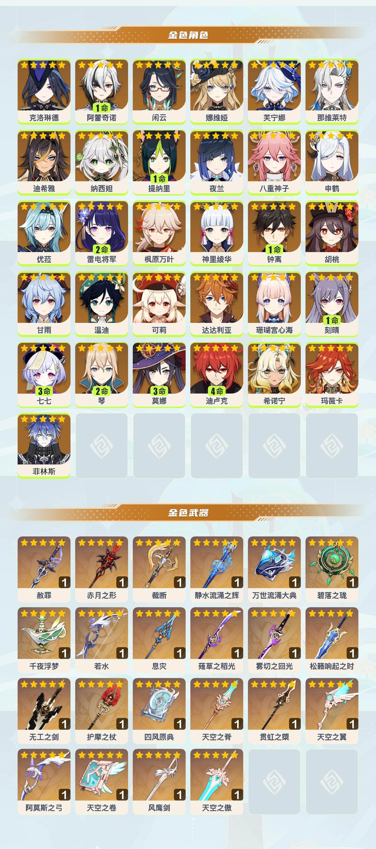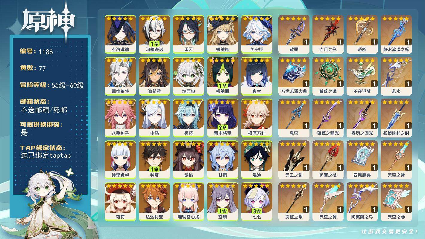 [15070825]60级/77黄/女主/31个五星角色/28个五星武器 0命克洛琳德1命阿蕾奇诺0命闲云0命娜维娅0命芙宁娜0命那维莱特0命迪希雅0命纳西妲1命提纳里0命夜兰0命八重神子0命申鹤0命优菈2命雷电将军0命枫原万叶0命神里绫华1命钟离0命胡桃0命甘雨0命温迪0命可莉0命达达利亚0命珊瑚宫心海1命刻晴3命七七2命琴3命莫娜4命迪卢克0命希诺宁0命玛薇卡0命菲林斯精1赦罪精1赤月之形精1裁断精1静水流涌之辉精1万世流涌大典精1碧落之珑精1千夜浮梦精1若水精1息灾精1薙草之稻光精1雾切之回光精1松籁响起之时精1无工之剑精1护摩之杖精1四风原典精1天空之脊精1贯虹之槊精1天空之翼精1阿莫斯之弓精1天空之卷精1风鹰剑精1天空之傲