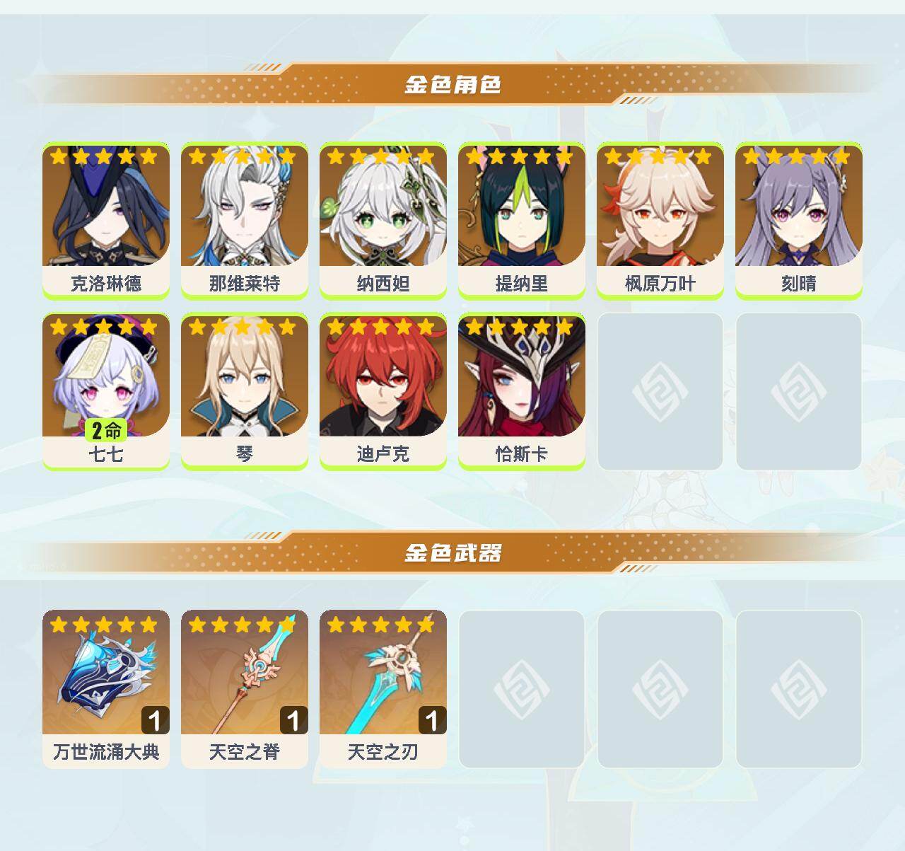【ysn2334】56级/15黄/女主/10个五星角色/3个五星武器/0命枫原万叶/0命克洛琳德/0命恰斯卡/0命纳西妲/2命七七/0命迪卢克/0命琴/0命刻晴/0命提纳里/0命那维莱特/精1万世流涌大典/精1天空之刃/精1天空之脊