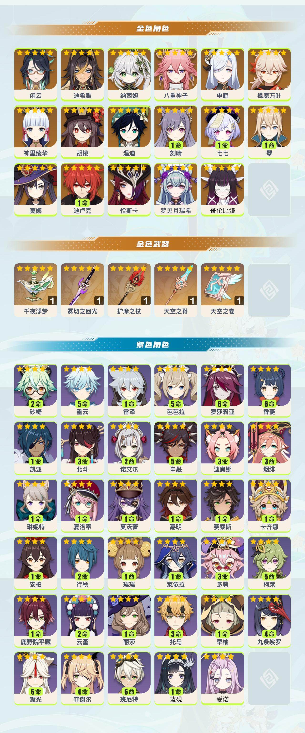 【ysz3120】57级/男主/20个五星角色/0命哥伦比娅/0命梦见月瑞希/0命恰斯卡/0命闲云/0命迪希雅/0命纳西妲/0命八重神子/0命申鹤/0命神里绫华/0命枫原万叶/0命胡桃/0命温迪/1命琴/1命刻晴/1命迪卢克/0命莫娜/1命七七/精1千夜浮梦/精1雾切之回光/精1护摩之杖/精1天空之卷/精1天空之脊/0命爱诺/1命蓝砚/0命卡齐娜/0命赛索斯/1命嘉明/0命夏沃蕾/0命夏洛蒂/0命琳妮特/1命瑶瑶/0命莱依拉/3命多莉/5命柯莱/1命鹿野院平藏/2命云堇/3命托马/4命九条裟罗/1命早柚/3命烟绯/满命罗莎莉亚/5命辛焱/3命迪奥娜/2命砂糖/1命雷泽/4命菲谢尔/1命丽莎/3命北斗/满命香菱/1命安柏/满命班尼特/2命行秋/5命芭芭拉/满命凝光/2命诺艾尔/0命凯亚/5命重云