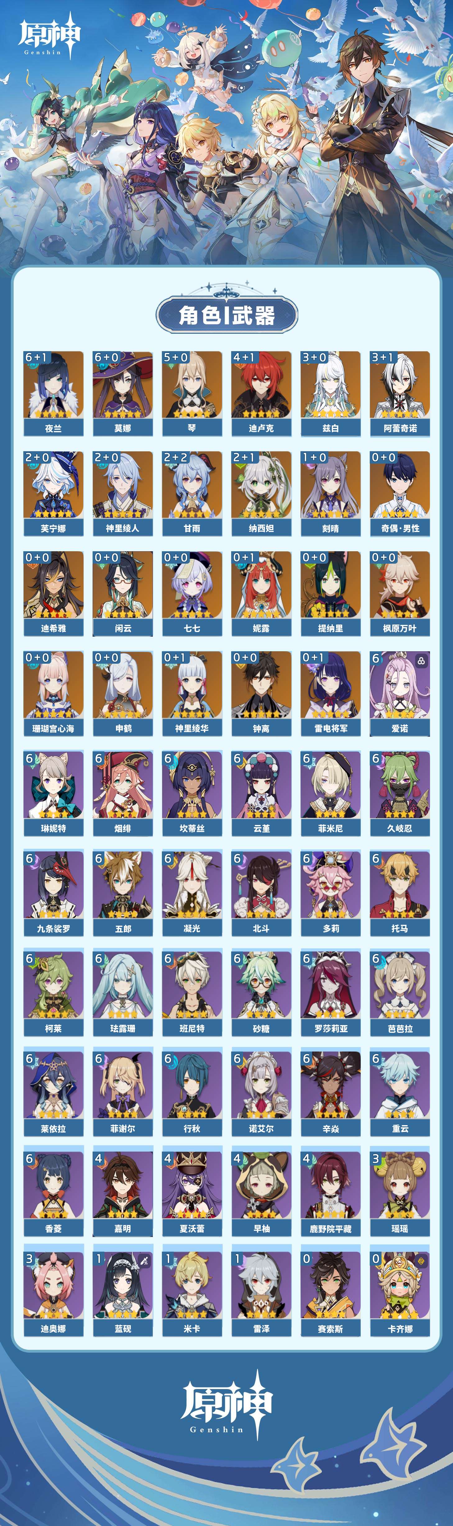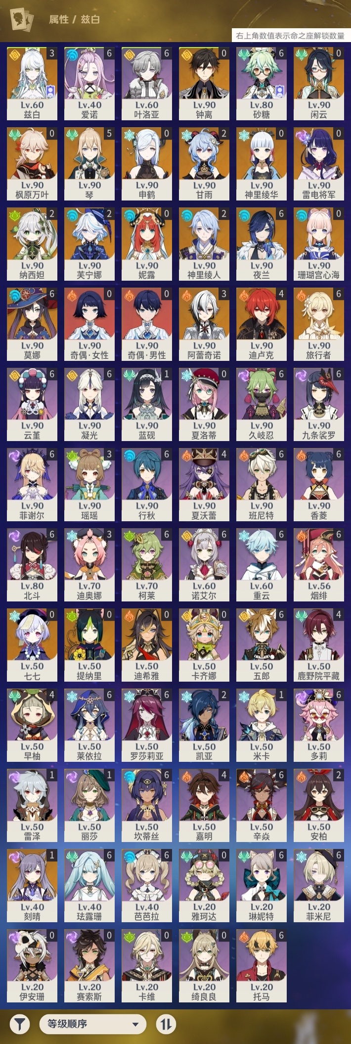 【原神】【lyys11451】冒险等级:60,五星数量:41,五星角色:莫娜 6命夜兰 6命琴 5命迪卢克 4命阿蕾奇诺 3命兹白 3命芙宁娜 2命甘雨 2命神里绫人 2命纳西妲 2命刻晴 1命七七珊瑚宫心海神里绫华迪希雅钟离申鹤提纳里闲云妮露枫原万叶雷电将军__五星武器:阿莫斯之弓 2精万世流涌大典赤月之形风鹰剑护摩之杖狼的末路磐岩结绿天空之脊天空之卷天空之刃雾切之回光薙草之稻光终末嗟叹之诗若水圣显之钥千夜浮梦白雨心弦__四星角色:班尼特 6命行秋 6命九条裟罗 6命香菱 6命久岐忍 6命珐露珊 6命凝光 6命砂糖 6命莱依拉 6命坎蒂丝 6命多莉 6命柯莱 6命芭芭拉 6命云堇 6命托马 6命五郎 6命烟绯 6命重云 6命辛焱 6命诺艾尔 6命罗莎莉亚 6命菲谢尔 6命北斗 6命菲米尼 6命琳妮特 6命爱诺 6命鹿野院平藏 4命早柚 4命夏沃蕾 4命嘉明 4命迪奥娜 3命瑶瑶 3命米卡 1命蓝砚 1命雷泽 1命奇偶·女性奇偶·男性卡齐娜绮良良卡维夏洛蒂伊安珊赛索斯
