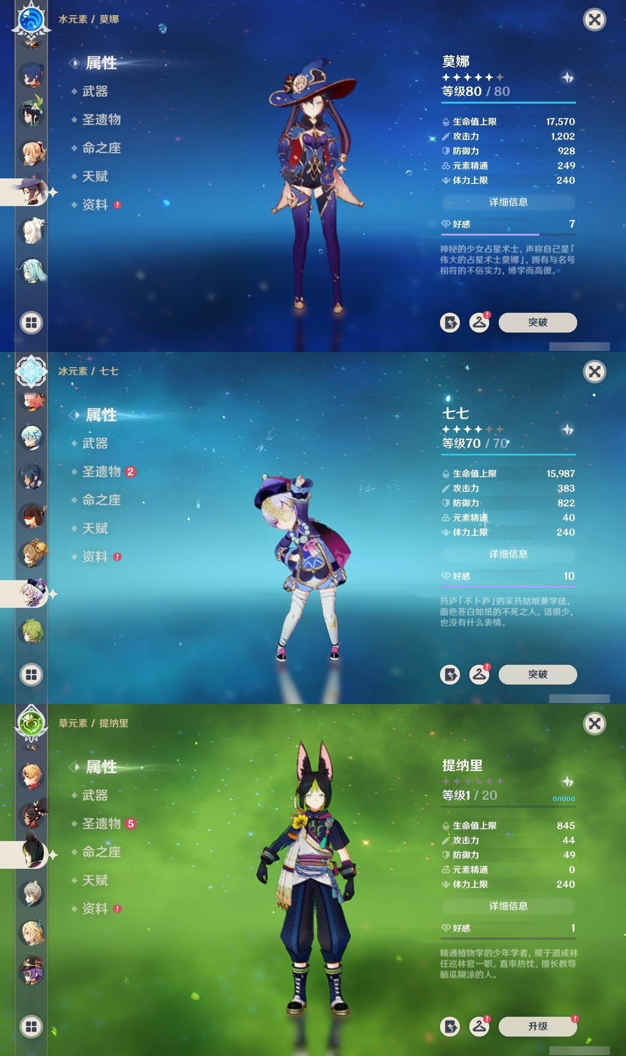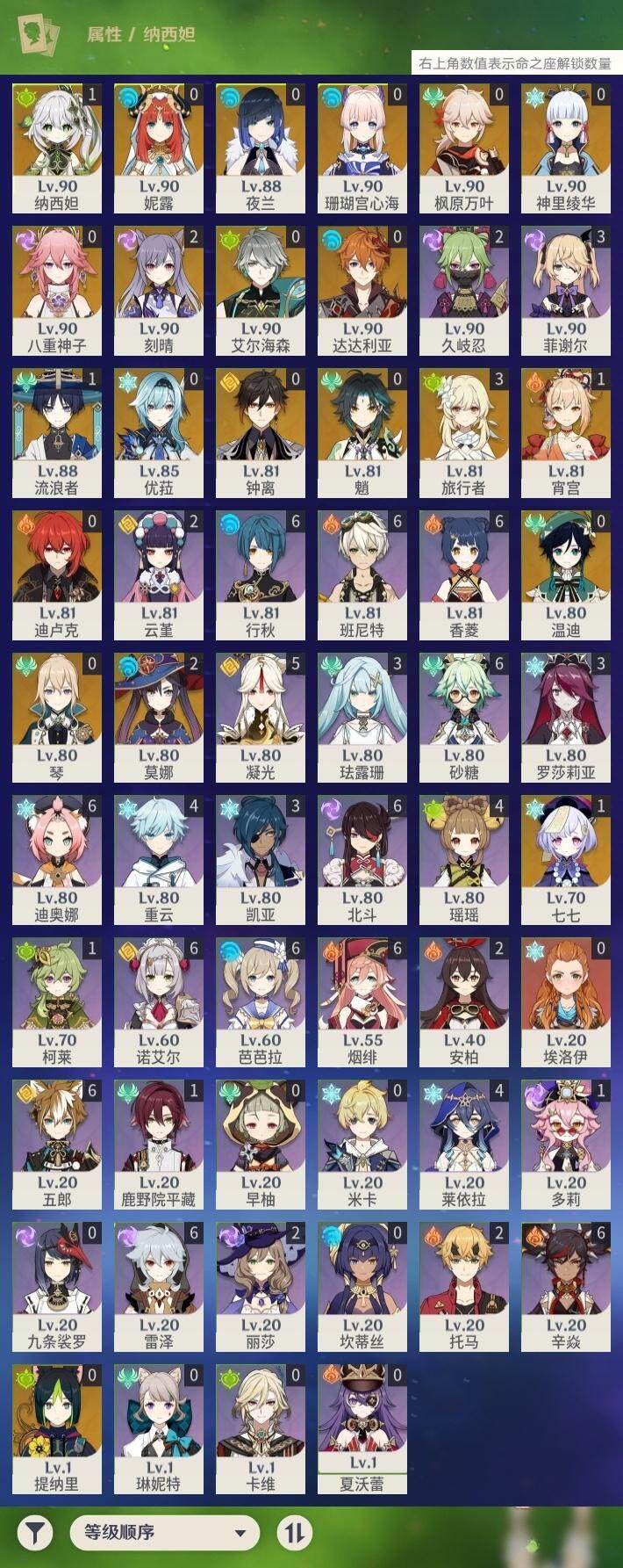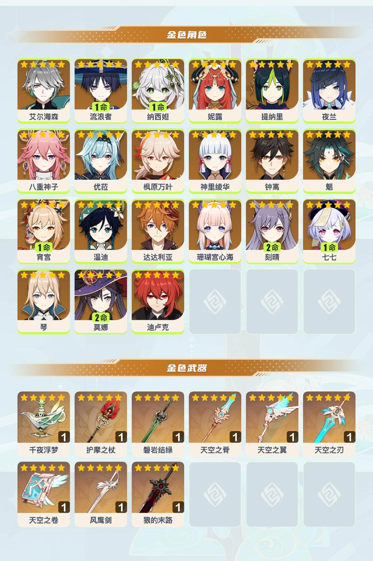 60级/39黄/女主/21个五星角色/10个五星武器 0命艾尔海森1命流浪者1命纳西妲0命妮露0命提纳里0命夜兰0命八重神子0命优菈0命枫原万叶0命神里绫华0命钟离0命魈1命宵宫0命温迪0命达达利亚0命珊瑚宫心海2命刻晴1命七七0命琴2命莫娜0命迪卢克精1千夜浮梦精1护摩之杖精1磐岩结绿精1天空之脊精1天空之翼精1天空之刃精1天空之卷精1风鹰剑精1狼的末路