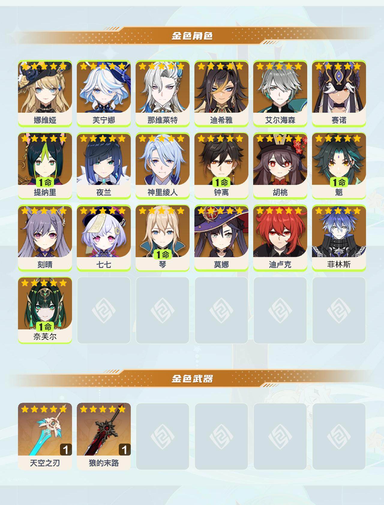 【ysx1646】58级/27黄/女主/19个五星角色/3个五星武器/0命菲林斯/1命钟离/0命芙宁娜/1命魈/0命神里绫人/0命那维莱特/0命迪卢克/0命胡桃/0命赛诺/1命提纳里/0命娜维娅/1命琴/0命艾尔海森/0命莫娜/0命刻晴/0命七七/0命夜兰/1命奈芙尔/0命迪希雅/精1狼的末路/精1天空之刃
