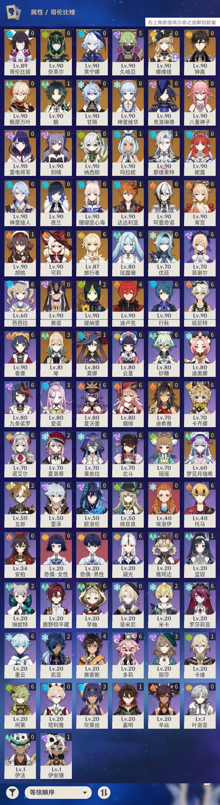 【原神】【lyys11519】冒险等级:60,五星数量:59,五星角色:迪卢克 4命琴 3命提纳里 2命玛拉妮 1命那维莱特 1命达达利亚 1命魈 1命胡桃 1命莫娜 1命珊瑚宫心海神里绫华宵宫优菈迪希雅钟离梦见月瑞希八重神子神里绫人夜兰芙宁娜娜维娅赛诺阿蕾奇诺妮露纳西妲奈芙尔哥伦比娅枫原万叶甘雨克洛琳德可莉刻晴雷电将军__五星武器:天空之脊 3精柔灯挽歌冲浪时光万世流涌大典静水流涌之辉裁断赤月之形支离轮光阿莫斯之弓飞雷之弦振和璞鸢护摩之杖狼的末路四风原典天空之傲天空之刃天空之翼雾切之回光薙草之稻光赤角石溃杵息灾赤沙之杖千夜浮梦__四星角色:卡齐娜 6命班尼特 6命行秋 6命九条裟罗 6命香菱 6命鹿野院平藏 6命珐露珊 6命凝光 6命迪奥娜 6命砂糖 6命瑶瑶 6命莱依拉 6命多莉 6命柯莱 6命芭芭拉 6命云堇 6命早柚 6命托马 6命烟绯 6命重云 6命辛焱 6命诺艾尔 6命罗莎莉亚 6命雷泽 6命菲谢尔 6命北斗 6命夏沃蕾 6命久岐忍 5命赛索斯 4命绮良良 3命坎蒂丝 3命爱诺 3命米卡 2命五郎 2命琳妮特 2命夏洛蒂 2命卡维 1命蓝砚 1命嘉明 1命伊安珊 1命埃洛伊奇偶·女性奇偶·男性欧洛伦菲米尼伊法塔利雅