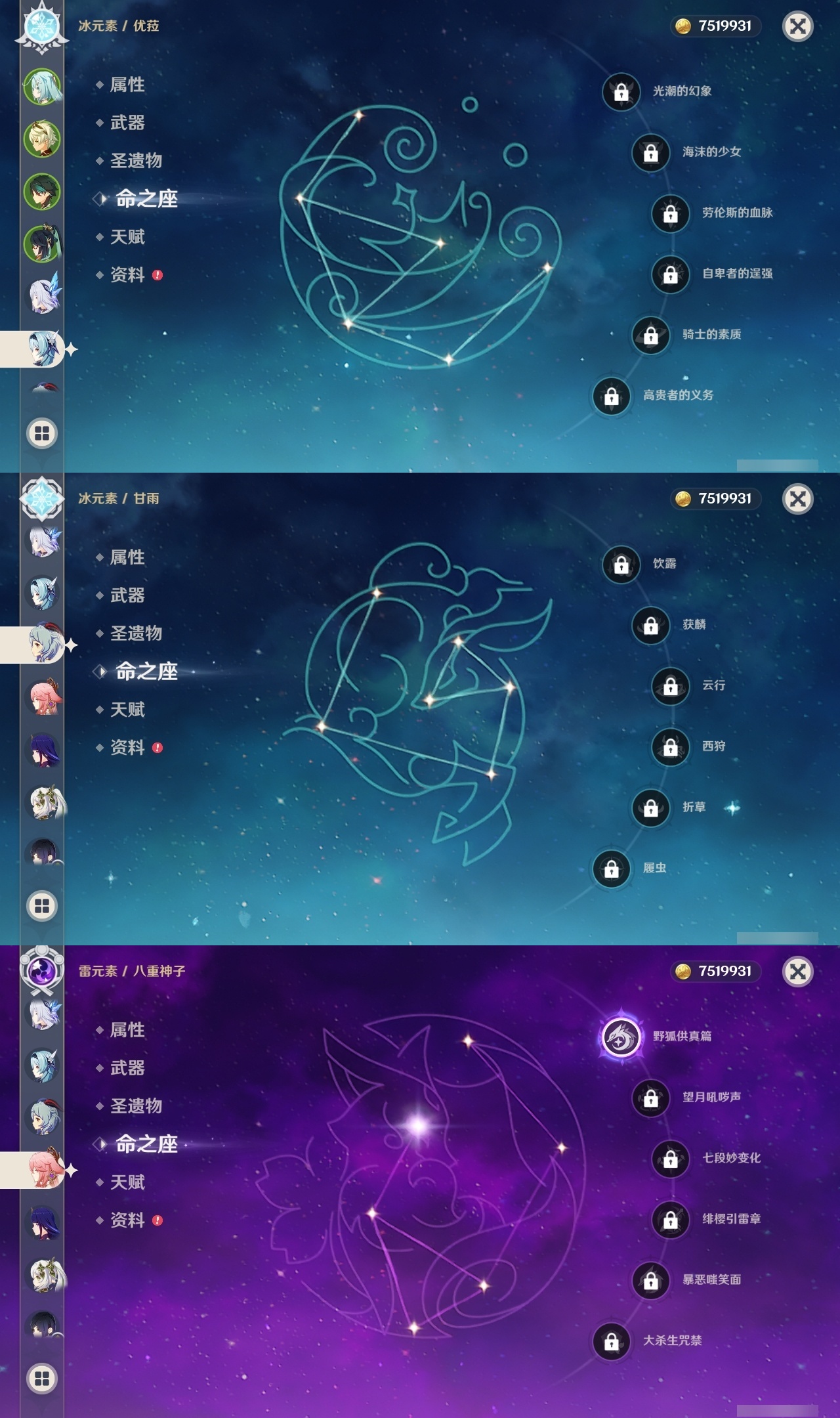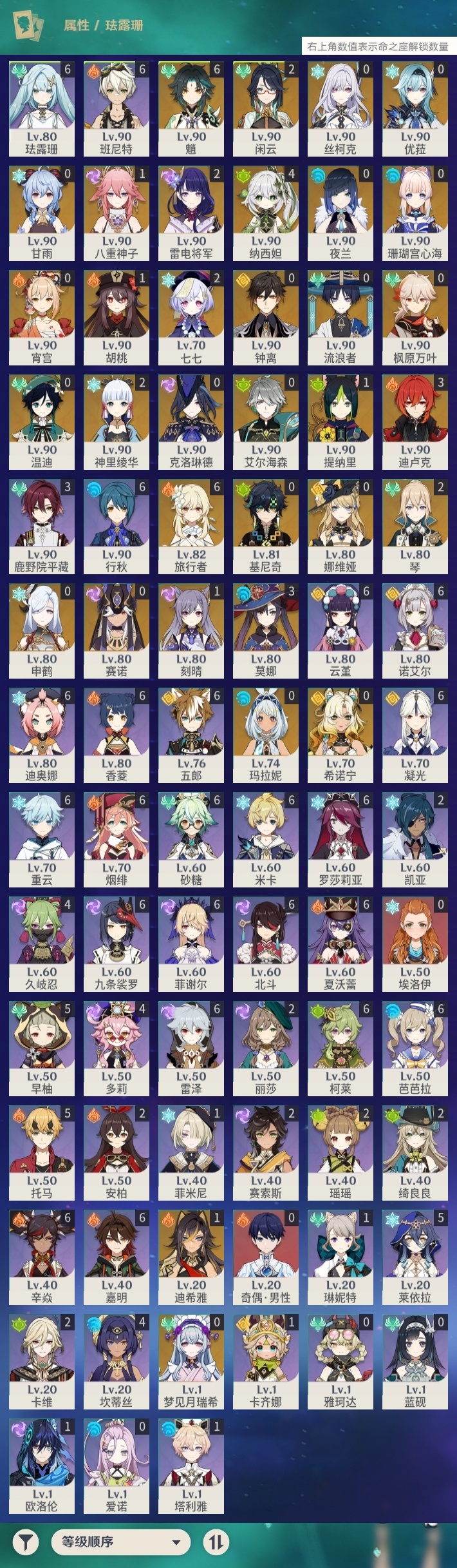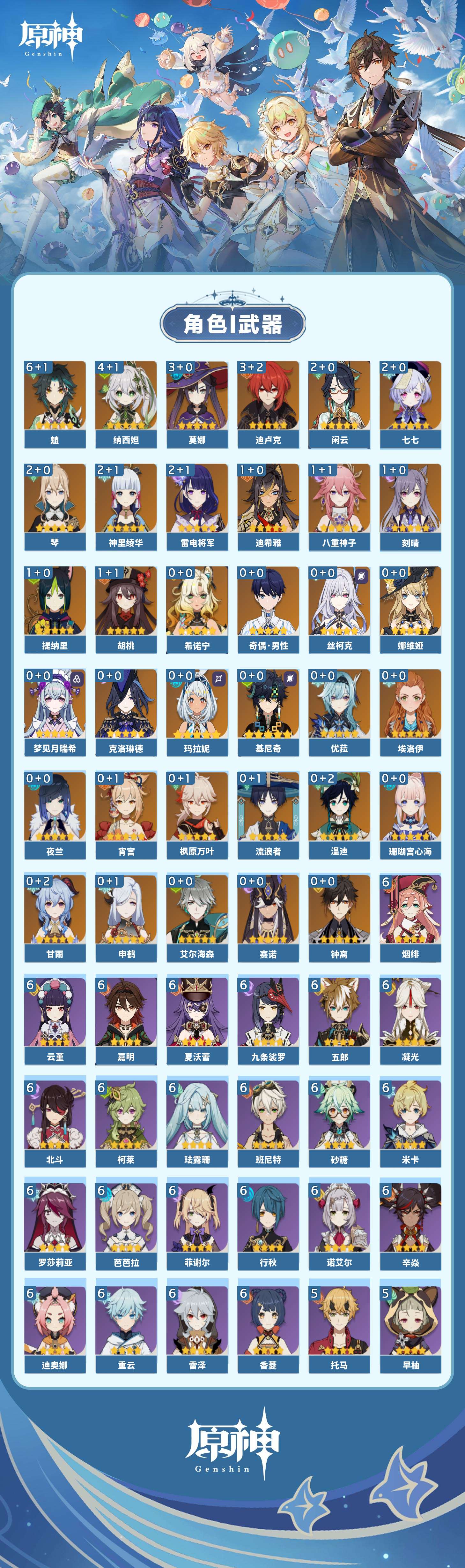 【原神】【lyys11516】冒险等级:60,五星数量:54,五星角色:魈 6命纳西妲 4命迪卢克 3命莫娜 3命闲云 2命雷电将军 2命七七 2命琴 2命神里绫华 2命迪希雅 1命胡桃 1命刻晴 1命八重神子 1命提纳里 1命玛拉妮基尼奇珊瑚宫心海希诺宁温迪宵宫优菈钟离梦见月瑞希申鹤夜兰娜维娅赛诺丝柯克艾尔海森流浪者枫原万叶甘雨克洛琳德__五星武器:阿莫斯之弓 2精狼的末路 2精无工之剑 2精终末嗟叹之诗 2精图莱杜拉的回忆苍古自由之誓飞雷之弦振风鹰剑和璞鸢护摩之杖四风原典天空之傲天空之脊天空之翼雾切之回光薙草之稻光息灾神乐之真意千夜浮梦__四星角色:班尼特 6命行秋 6命九条裟罗 6命香菱 6命珐露珊 6命凝光 6命迪奥娜 6命砂糖 6命米卡 6命柯莱 6命芭芭拉 6命云堇 6命五郎 6命烟绯 6命重云 6命辛焱 6命诺艾尔 6命罗莎莉亚 6命雷泽 6命菲谢尔 6命北斗 6命夏沃蕾 6命嘉明 6命莱依拉 5命早柚 5命托马 5命久岐忍 4命坎蒂丝 4命多莉 4命鹿野院平藏 3命绮良良 2命瑶瑶 2命卡维 2命赛索斯 2命卡齐娜 1命欧洛伦 1命菲米尼 1命琳妮特 1命塔利雅 1命埃洛伊奇偶·男性蓝砚爱诺
