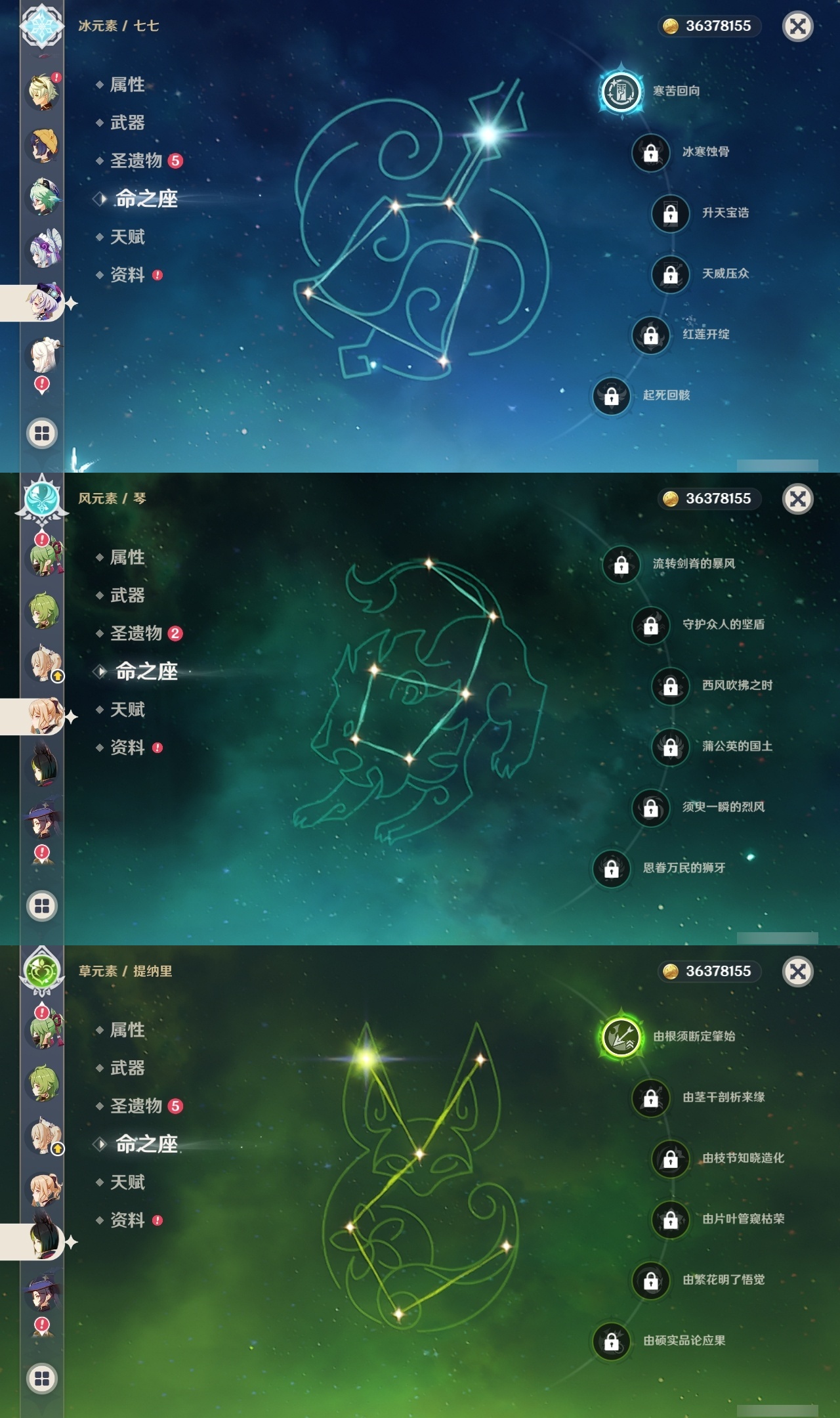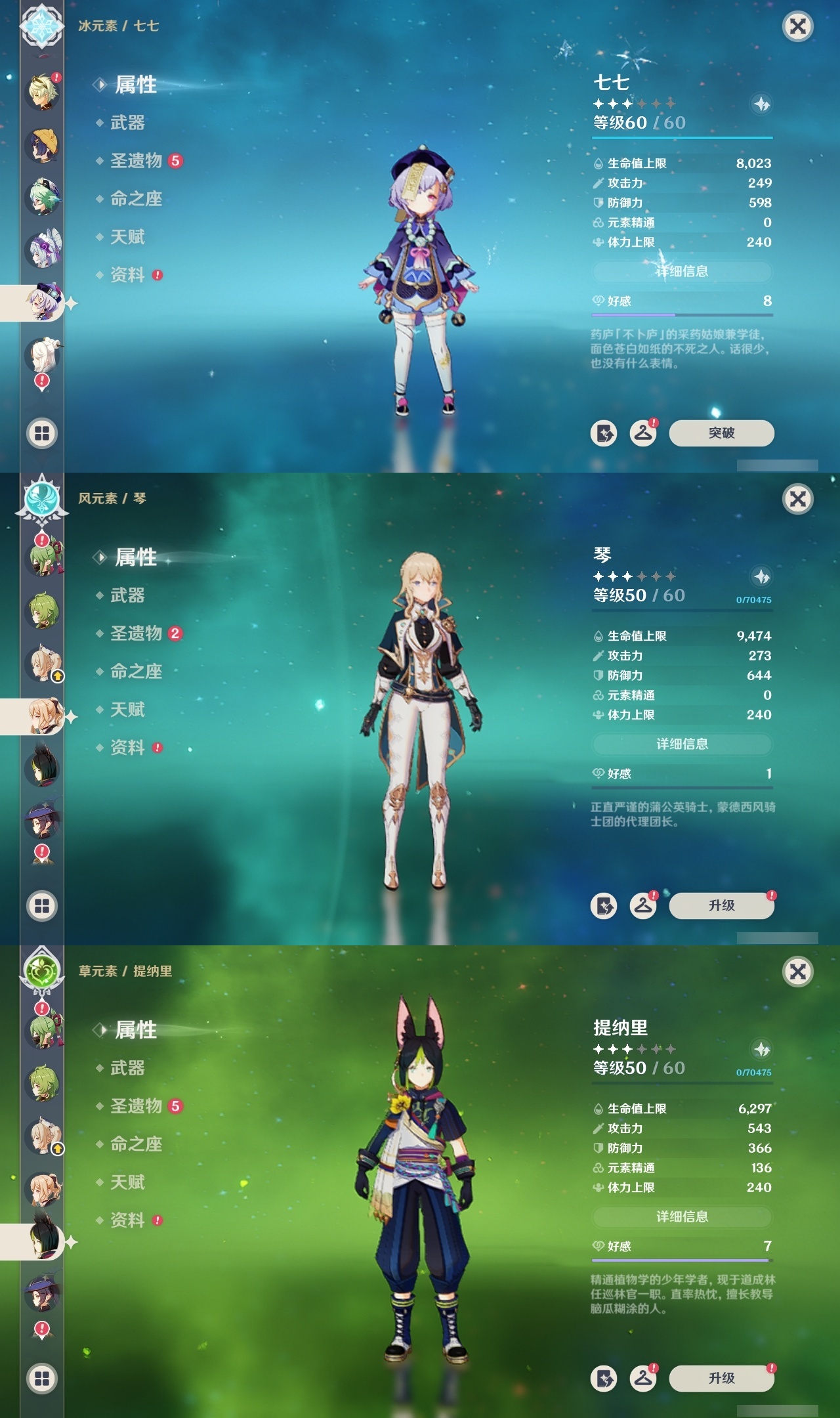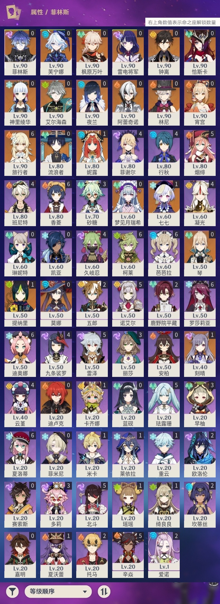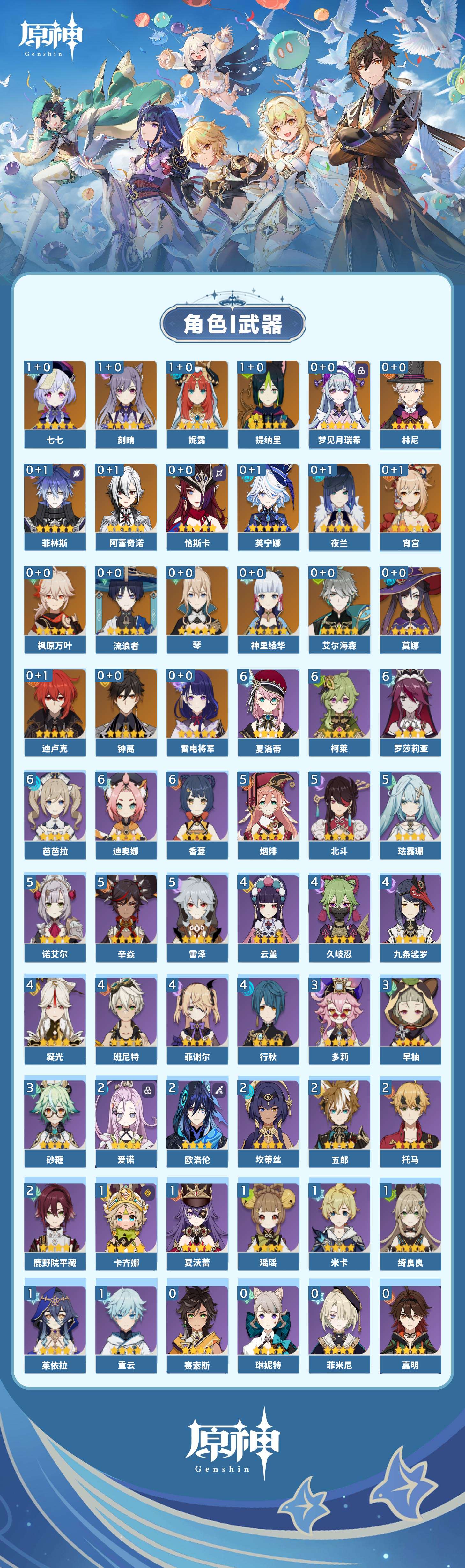 【原神】【lyys11518】冒险等级:59,五星数量:30,五星角色:刻晴 1命七七 1命提纳里 1命妮露 1命莫娜琴神里绫华恰斯卡宵宫钟离梦见月瑞希林尼夜兰芙宁娜阿蕾奇诺菲林斯艾尔海森流浪者迪卢克枫原万叶雷电将军__五星武器:静水流涌之辉赤月之形血染荒城飞雷之弦振狼的末路天空之傲天空之脊天空之翼若水__四星角色:香菱 6命迪奥娜 6命柯莱 6命芭芭拉 6命罗莎莉亚 6命夏洛蒂 6命珐露珊 5命烟绯 5命辛焱 5命诺艾尔 5命雷泽 5命北斗 5命班尼特 4命行秋 4命九条裟罗 4命久岐忍 4命凝光 4命云堇 4命菲谢尔 4命砂糖 3命多莉 3命早柚 3命鹿野院平藏 2命坎蒂丝 2命欧洛伦 2命托马 2命五郎 2命爱诺 2命卡齐娜 1命绮良良 1命瑶瑶 1命莱依拉 1命米卡 1命重云 1命夏沃蕾 1命蓝砚菲米尼琳妮特嘉明赛索斯