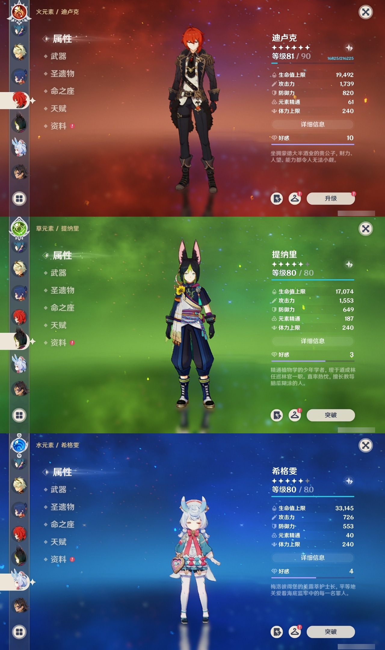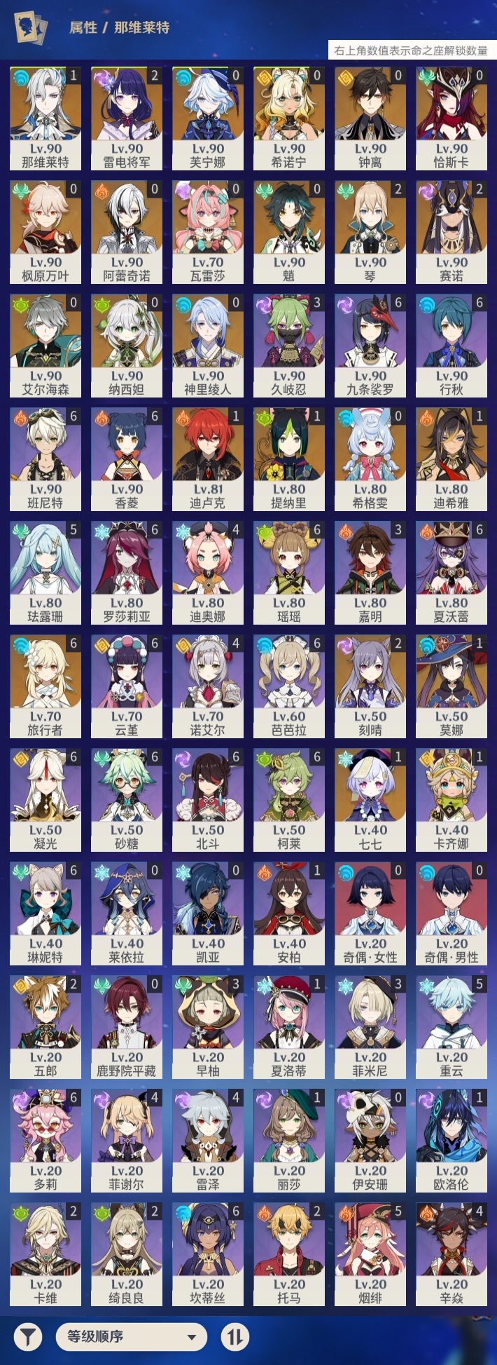 【原神】【lyys11508】冒险等级:60,五星数量:35,五星角色:刻晴 2命雷电将军 2命琴 2命赛诺 2命迪希雅 1命那维莱特 1命迪卢克 1命莫娜 1命七七 1命提纳里 1命希诺宁恰斯卡钟离瓦雷莎神里绫人芙宁娜阿蕾奇诺纳西妲艾尔海森枫原万叶魈希格雯__五星武器:阿莫斯之弓 3精岩峰巡歌万世流涌大典有乐御簾切飞雷之弦振风鹰剑天空之脊天空之卷天空之翼薙草之稻光赤沙之杖__四星角色:班尼特 6命行秋 6命九条裟罗 6命香菱 6命凝光 6命砂糖 6命瑶瑶 6命坎蒂丝 6命多莉 6命柯莱 6命芭芭拉 6命云堇 6命罗莎莉亚 6命北斗 6命琳妮特 6命夏沃蕾 6命珐露珊 5命烟绯 5命重云 5命迪奥娜 4命辛焱 4命诺艾尔 4命雷泽 4命菲谢尔 4命久岐忍 3命早柚 3命菲米尼 3命嘉明 3命绮良良 2命卡维 2命托马 2命五郎 2命卡齐娜 1命欧洛伦 1命夏洛蒂 1命奇偶·女性奇偶·男性鹿野院平藏莱依拉伊安珊