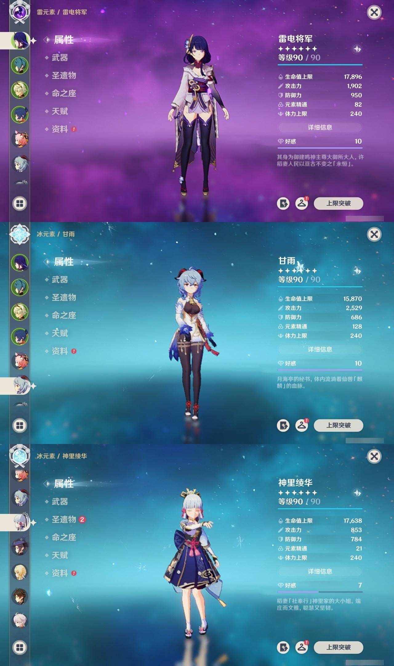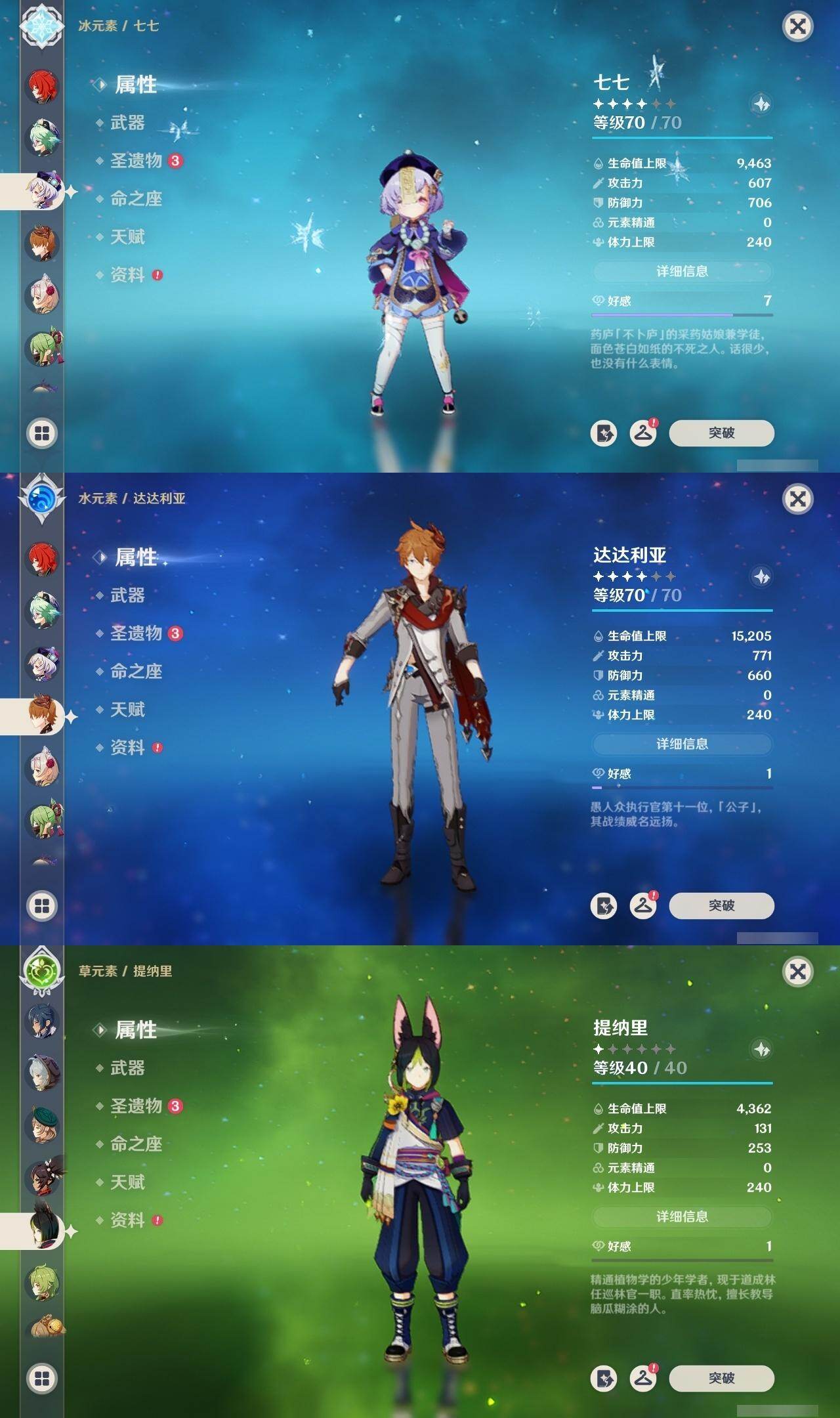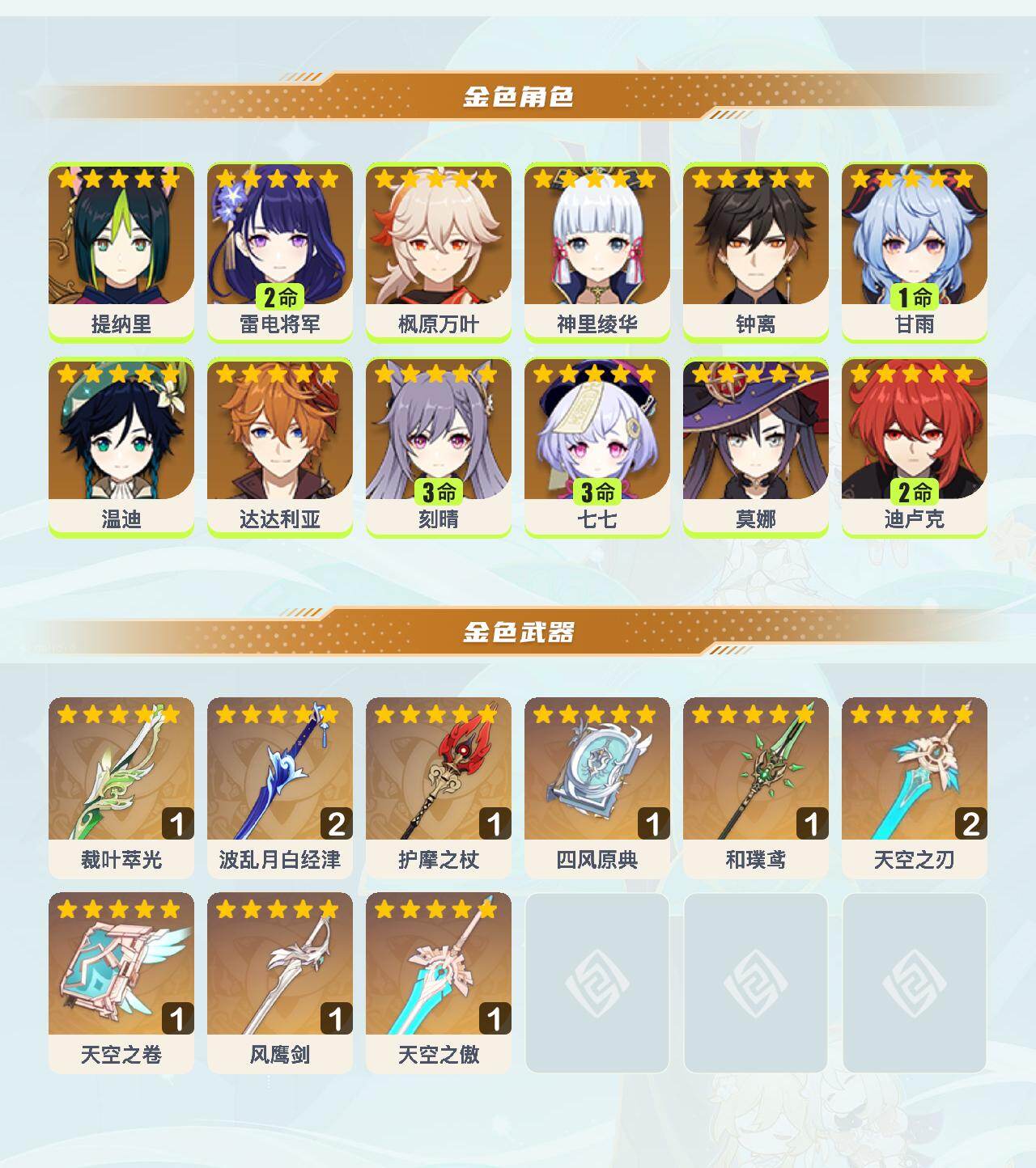 56级/34黄/女主/12个五星角色/9个五星武器 0命提纳里2命雷电将军0命枫原万叶0命神里绫华0命钟离1命甘雨0命温迪0命达达利亚3命刻晴3命七七0命莫娜2命迪卢克精1裁叶萃光精2波乱月白经津精1护摩之杖精1四风原典精1和璞鸢精2天空之刃精1天空之卷精1风鹰剑精1天空之傲