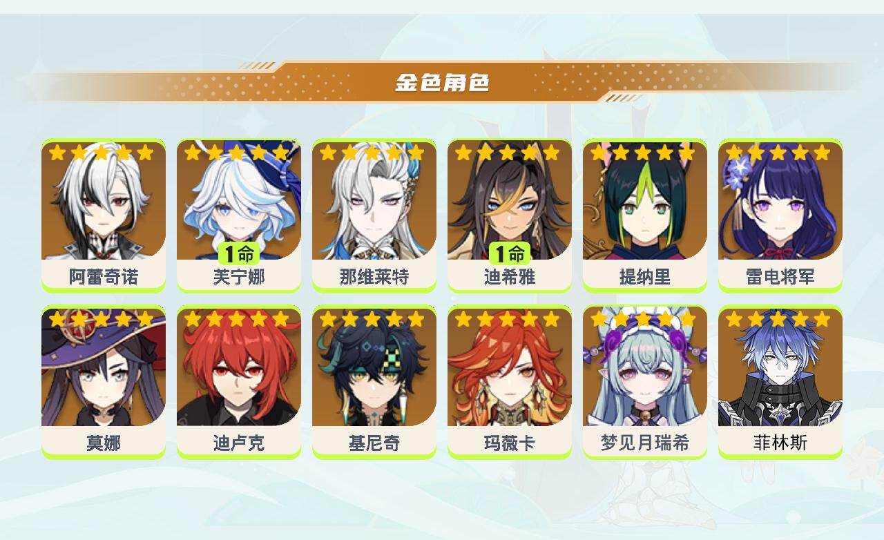 【ysz3122】56级/15黄/女主/12个五星角色/1个五星武器/0命玛薇卡/0命那维莱特/1命芙宁娜/0命基尼奇/0命菲林斯/0命阿蕾奇诺/0命雷电将军/0命梦见月瑞希/0命莫娜/0命迪卢克/1命迪希雅/0命提纳里