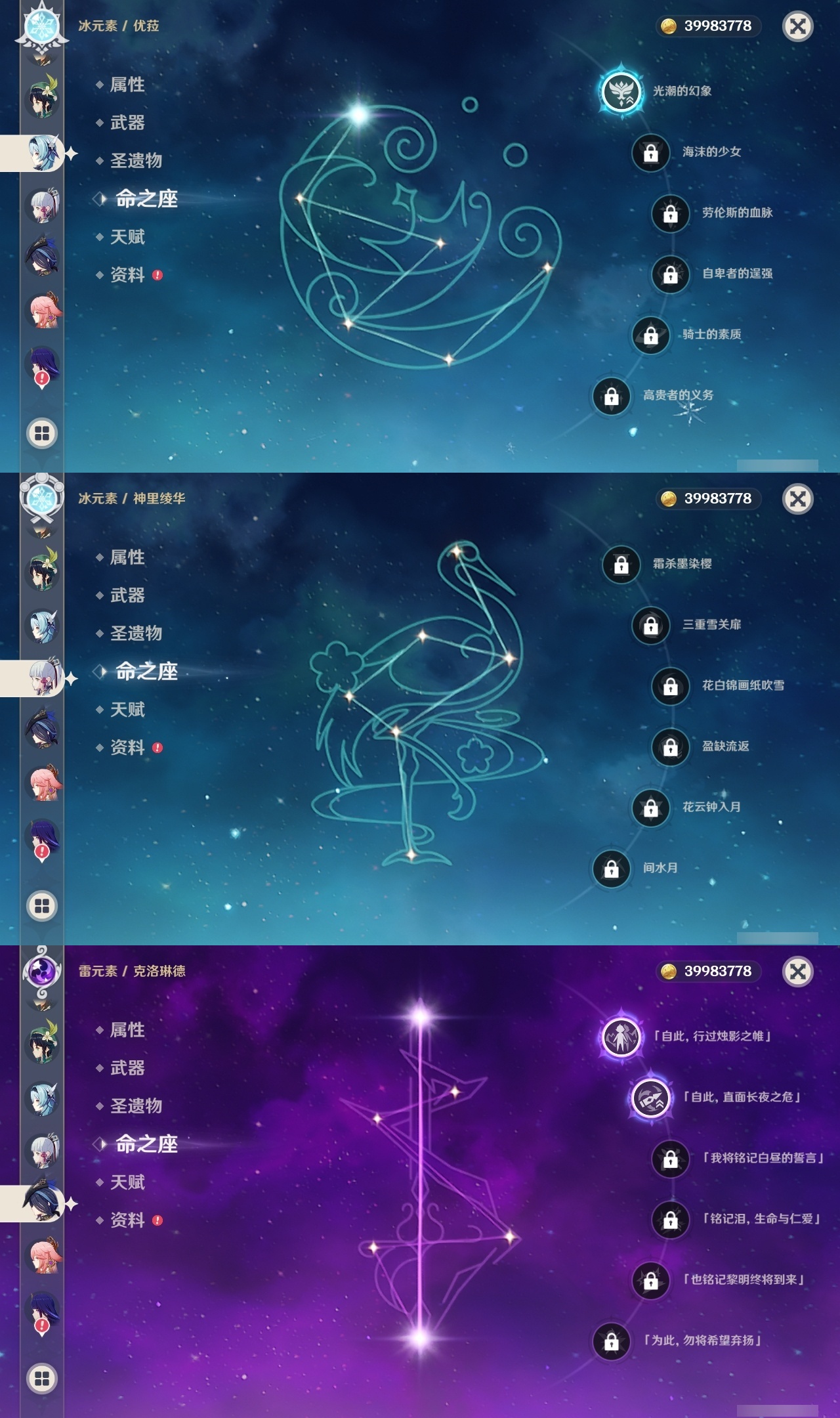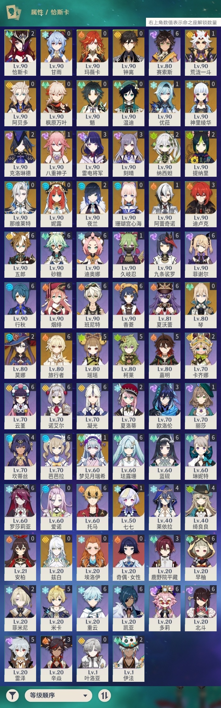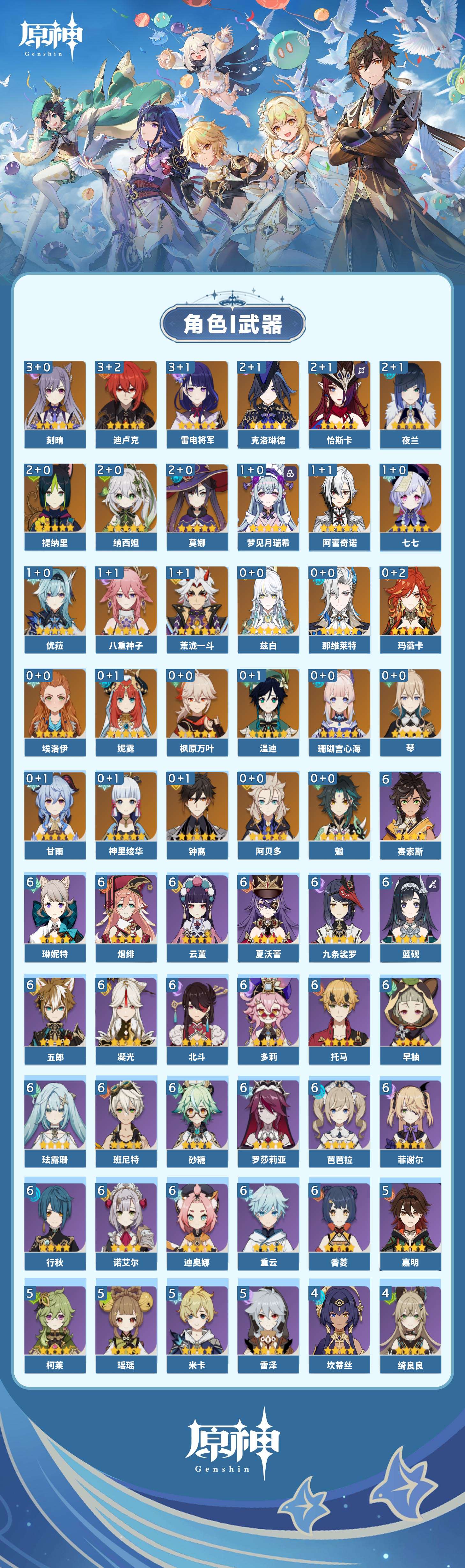 【原神】【lyys11534】冒险等级:60,五星数量:56,五星角色:迪卢克 3命刻晴 3命雷电将军 3命恰斯卡 2命莫娜 2命夜兰 2命提纳里 2命纳西妲 2命克洛琳德 2命梦见月瑞希 1命阿蕾奇诺 1命七七 1命优菈 1命荒泷一斗 1命八重神子 1命琴珊瑚宫心海神里绫华温迪玛薇卡钟离阿贝多那维莱特妮露兹白枫原万叶甘雨魈__五星武器:天空之脊 3精焚曜千阳 2精狼的末路 2精天空之傲 2精天空之刃 2精息灾 2精星鹫赤羽祭星者之望最初的大魔术赤月之形阿莫斯之弓飞雷之弦振风鹰剑四风原典天空之卷天空之翼无工之剑雾切之回光薙草之稻光终末嗟叹之诗赤角石溃杵神乐之真意贯虹之槊若水圣显之钥赦罪__四星角色:班尼特 6命行秋 6命九条裟罗 6命香菱 6命珐露珊 6命凝光 6命迪奥娜 6命砂糖 6命多莉 6命芭芭拉 6命云堇 6命蓝砚 6命早柚 6命托马 6命五郎 6命烟绯 6命重云 6命诺艾尔 6命罗莎莉亚 6命菲谢尔 6命北斗 6命琳妮特 6命夏沃蕾 6命赛索斯 6命瑶瑶 5命米卡 5命柯莱 5命雷泽 5命嘉明 5命绮良良 4命莱依拉 4命坎蒂丝 4命鹿野院平藏 3命欧洛伦 3命辛焱 3命卡齐娜 2命菲米尼 2命夏洛蒂 2命伊法 2命久岐忍 1命埃洛伊奇偶·女性爱诺