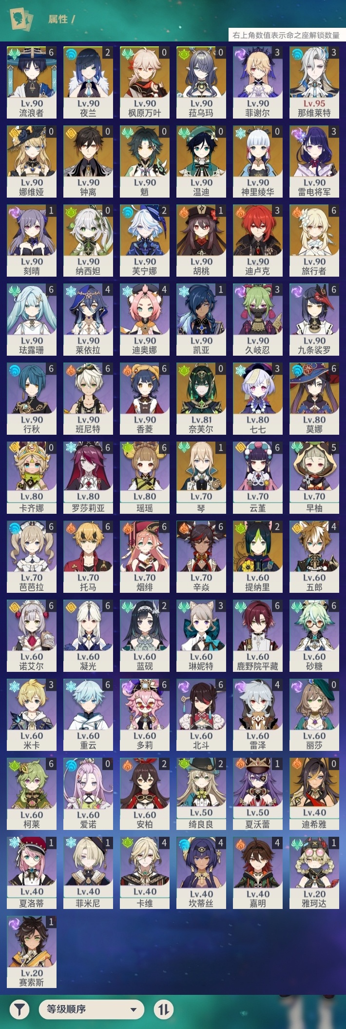 【原神】【lyys11531】冒险等级:60,五星数量:41,五星角色:莫娜 6命流浪者 6命那维莱特 3命迪卢克 3命雷电将军 3命七七 3命芙宁娜 2命夜兰 2命提纳里 2命胡桃 1命刻晴 1命琴 1命神里绫华温迪迪希雅钟离娜维娅纳西妲菈乌玛奈芙尔枫原万叶魈__五星武器:护摩之杖 3精天空之翼 2精雾切之回光 2精薙草之稻光 2精万世流涌大典裁断赤月之形真语秘匣苍古自由之誓风鹰剑和璞鸢狼的末路天空之傲天空之卷天空之刃终末嗟叹之诗若水千夜浮梦白雨心弦__四星角色:班尼特 6命行秋 6命九条裟罗 6命香菱 6命鹿野院平藏 6命珐露珊 6命凝光 6命砂糖 6命瑶瑶 6命多莉 6命柯莱 6命芭芭拉 6命云堇 6命托马 6命烟绯 6命重云 6命辛焱 6命诺艾尔 6命罗莎莉亚 6命北斗 6命早柚 5命迪奥娜 4命莱依拉 4命坎蒂丝 4命卡维 4命五郎 4命雷泽 4命嘉明 4命久岐忍 3命米卡 3命菲谢尔 3命琳妮特 3命绮良良 2命蓝砚 2命菲米尼 1命夏洛蒂 1命夏沃蕾 1命赛索斯 1命卡齐娜爱诺