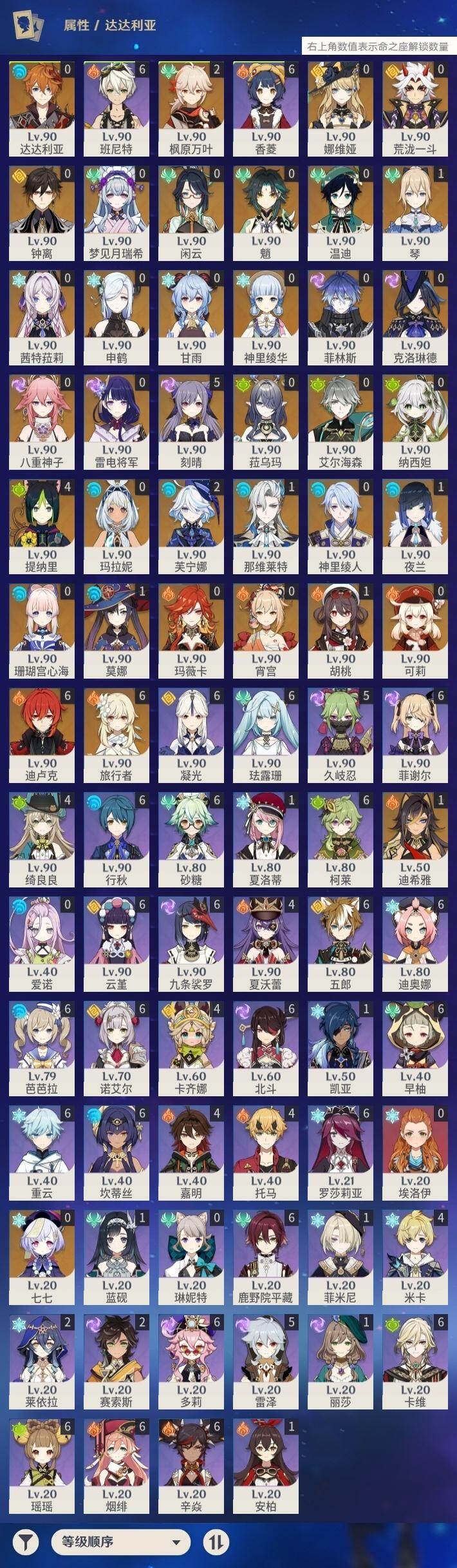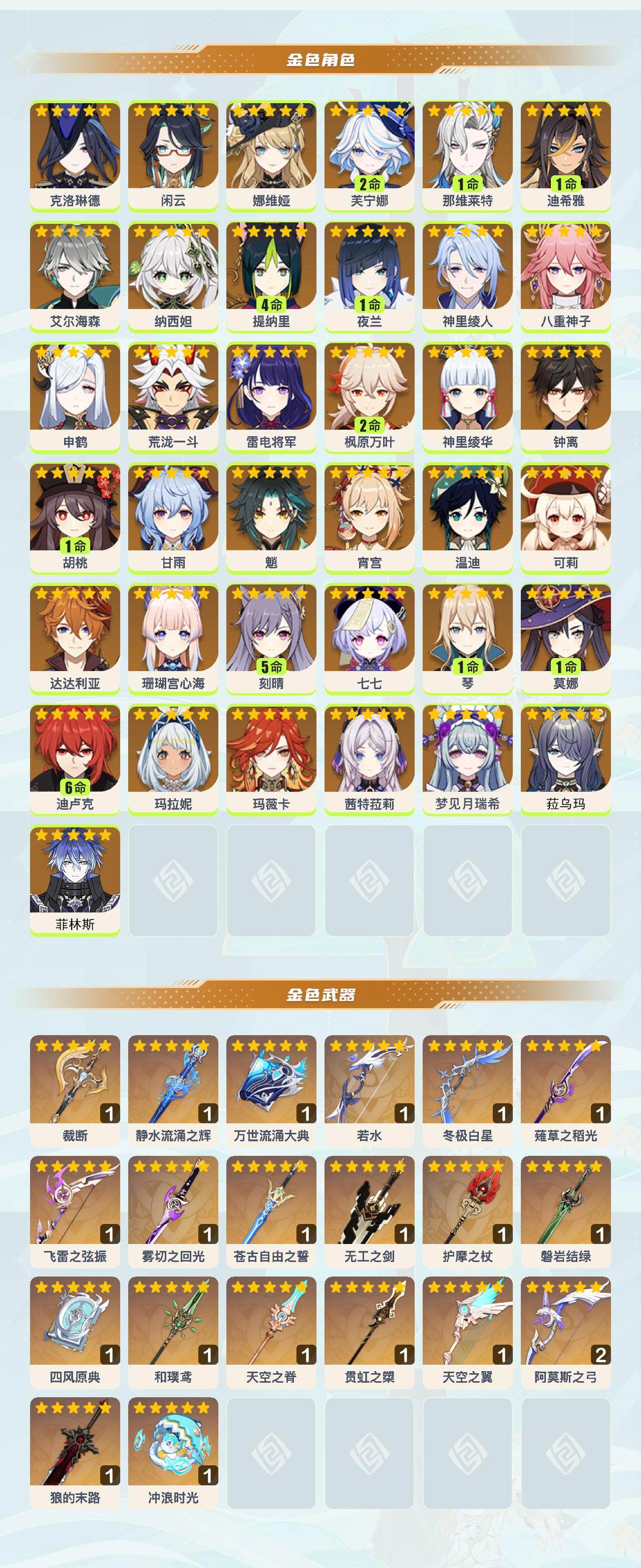 60级/88黄/女主/37个五星角色/25个五星武器 0命克洛琳德0命闲云0命娜维娅2命芙宁娜1命那维莱特1命迪希雅0命艾尔海森0命纳西妲4命提纳里1命夜兰0命神里绫人0命八重神子0命申鹤0命荒泷一斗0命雷电将军2命枫原万叶0命神里绫华0命钟离1命胡桃0命甘雨0命魈0命宵宫0命温迪0命可莉0命达达利亚0命珊瑚宫心海5命刻晴0命七七1命琴1命莫娜满命迪卢克0命玛拉妮0命玛薇卡0命茜特菈莉0命梦见月瑞希0命菈乌玛0命菲林斯精1裁断精1静水流涌之辉精1万世流涌大典精1若水精1冬极白星精1薙草之稻光精1飞雷之弦振精1雾切之回光精1苍古自由之誓精1无工之剑精1护摩之杖精1磐岩结绿精1四风原典精1和璞鸢精1天空之脊精1贯虹之槊精1天空之翼精2阿莫斯之弓精1狼的末路精1冲浪时光