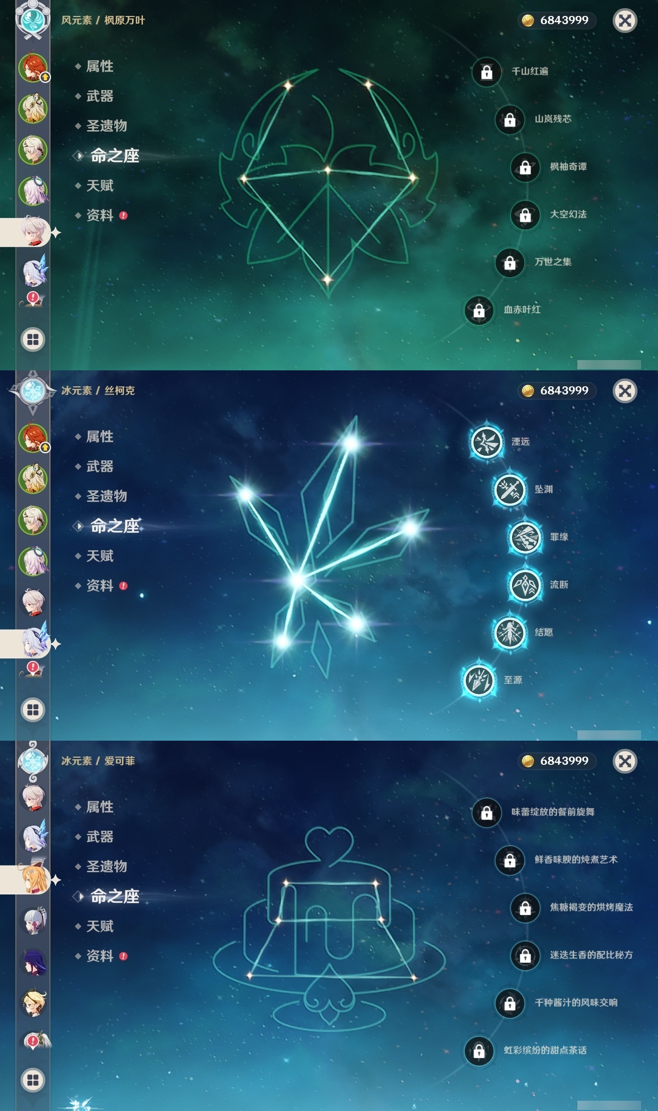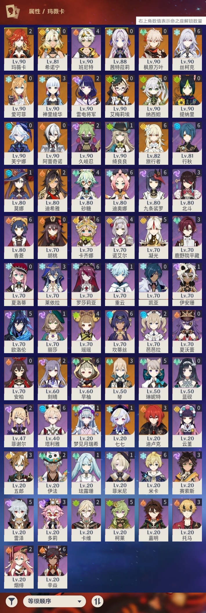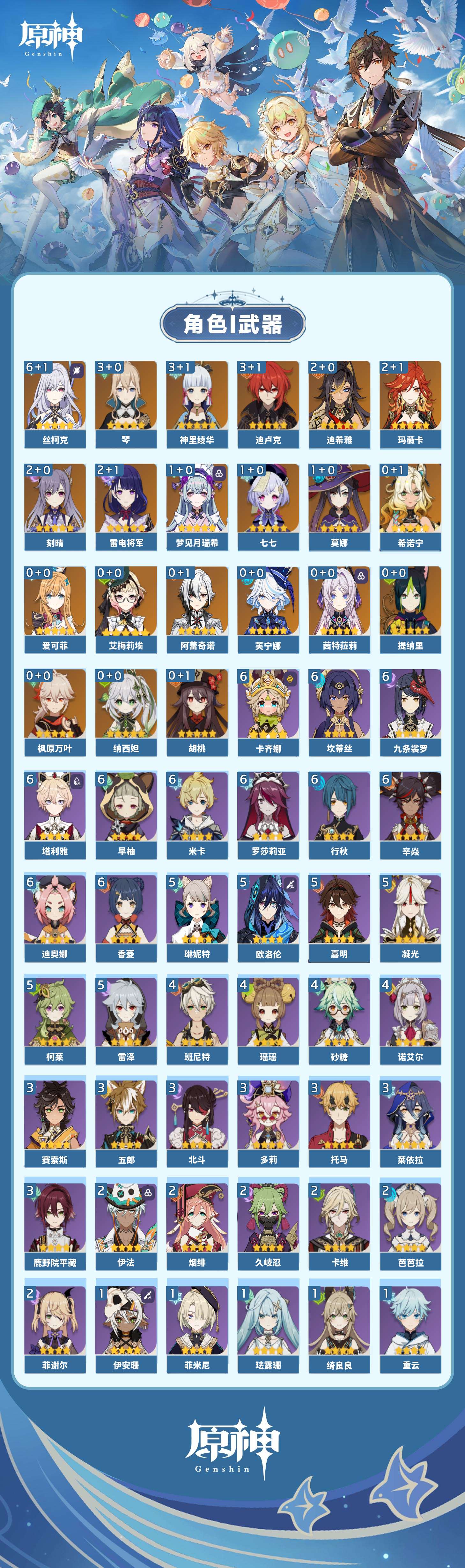 【原神】【lyys11133】冒险等级:60,五星数量:33,五星角色:丝柯克 6命迪卢克 3命琴 3命神里绫华 3命玛薇卡 2命迪希雅 2命刻晴 2命雷电将军 2命梦见月瑞希 1命莫娜 1命七七 1命艾梅莉埃希诺宁茜特菈莉芙宁娜提纳里爱可菲阿蕾奇诺纳西妲枫原万叶胡桃__五星武器:岩峰巡歌焚曜千阳有乐御簾切赤月之形苍耀阿莫斯之弓护摩之杖狼的末路天空之傲雾切之回光薙草之稻光息灾__四星角色:卡齐娜 6命行秋 6命九条裟罗 6命香菱 6命迪奥娜 6命米卡 6命坎蒂丝 6命早柚 6命辛焱 6命罗莎莉亚 6命塔利雅 6命凝光 5命柯莱 5命欧洛伦 5命雷泽 5命琳妮特 5命嘉明 5命班尼特 4命砂糖 4命瑶瑶 4命诺艾尔 4命鹿野院平藏 3命莱依拉 3命多莉 3命托马 3命五郎 3命北斗 3命赛索斯 3命久岐忍 2命卡维 2命芭芭拉 2命烟绯 2命菲谢尔 2命伊法 2命珐露珊 1命绮良良 1命重云 1命菲米尼 1命伊安珊 1命蓝砚云堇夏洛蒂夏沃蕾