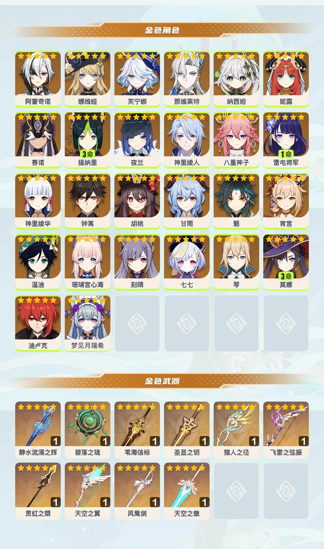 【ysx1650】59级/43黄/女主/26个五星角色/10个五星武器/0命芙宁娜/0命那维莱特/0命珊瑚宫心海/0命钟离/0命神里绫华/0命八重神子/1命雷电将军/0命纳西妲/0命妮露/0命夜兰/0命宵宫/0命胡桃/0命温迪/3命提纳里/3命莫娜/0命娜维娅/0命神里绫人/0命魈/0命琴/0命甘雨/0命赛诺/0命刻晴/0命七七/0命迪卢克/0命阿蕾奇诺/0命梦见月瑞希/精1猎人之径/精1飞雷之弦振/精1贯虹之槊/精1静水流涌之辉/精1圣显之钥/精1苇海信标/精1风鹰剑/精1天空之翼/精1碧落之珑/精1天空之傲