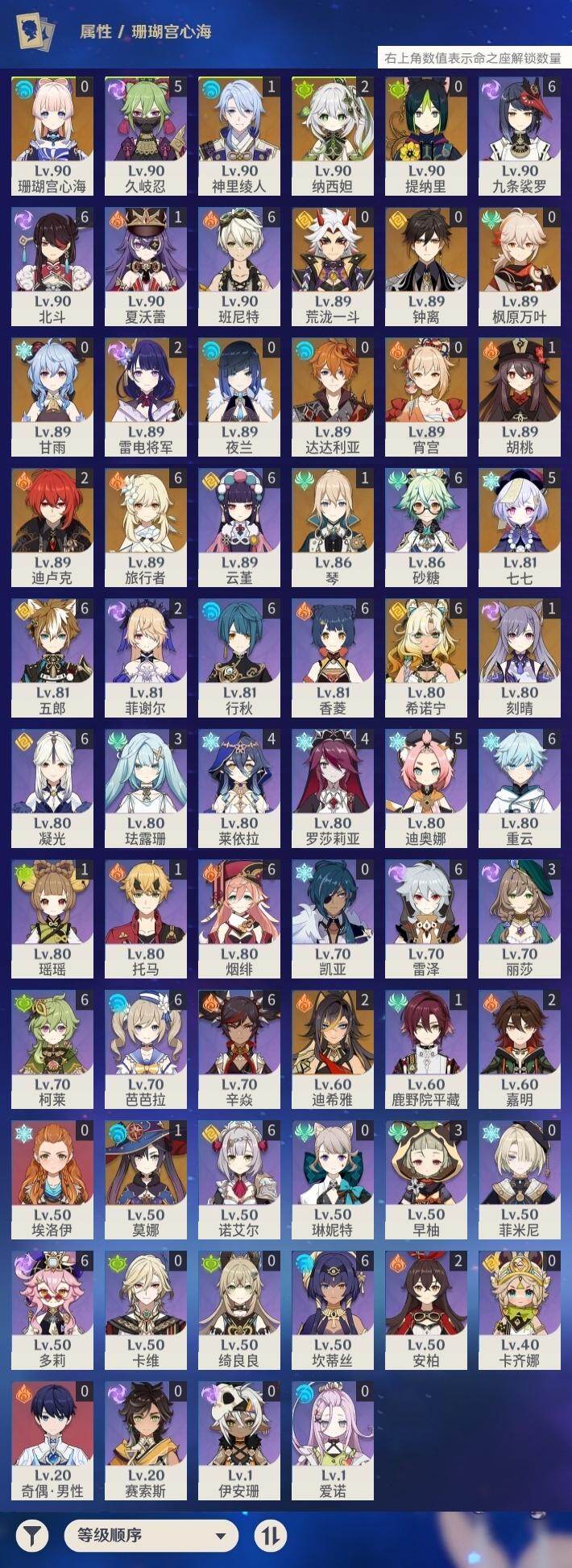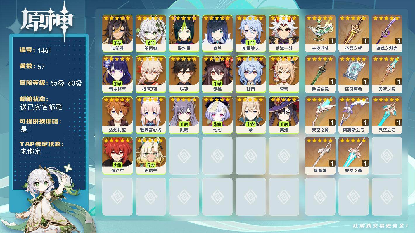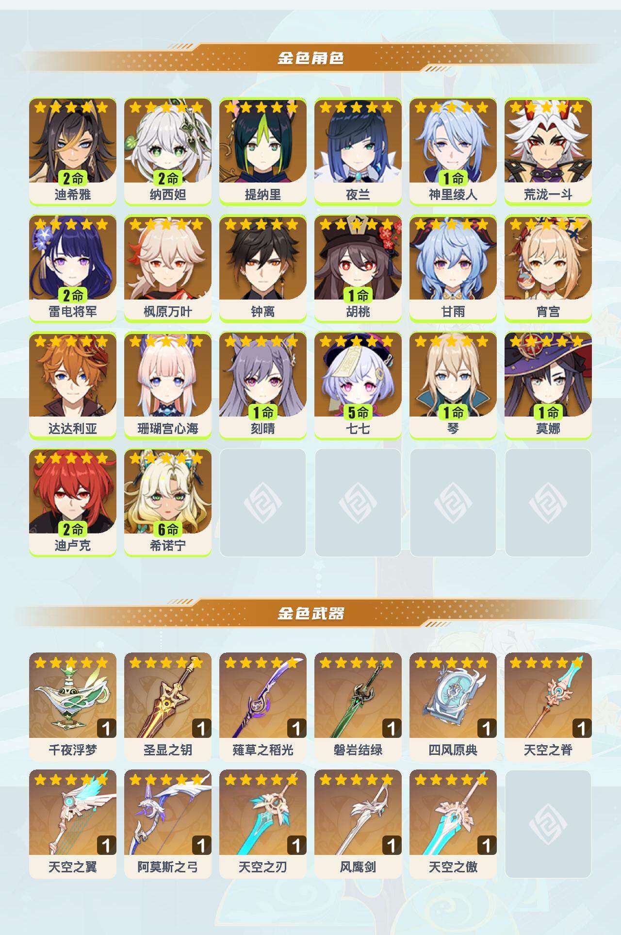 [15522861]60级/57黄/女主/20个五星角色/13个五星武器 2命迪希雅2命纳西妲0命提纳里0命夜兰1命神里绫人0命荒泷一斗2命雷电将军0命枫原万叶0命钟离1命胡桃0命甘雨0命宵宫0命达达利亚0命珊瑚宫心海1命刻晴5命七七1命琴1命莫娜2命迪卢克满命希诺宁精1千夜浮梦精1圣显之钥精1薙草之稻光精1磐岩结绿精1四风原典精1天空之脊精1天空之翼精1阿莫斯之弓精1天空之刃精1风鹰剑精1天空之傲