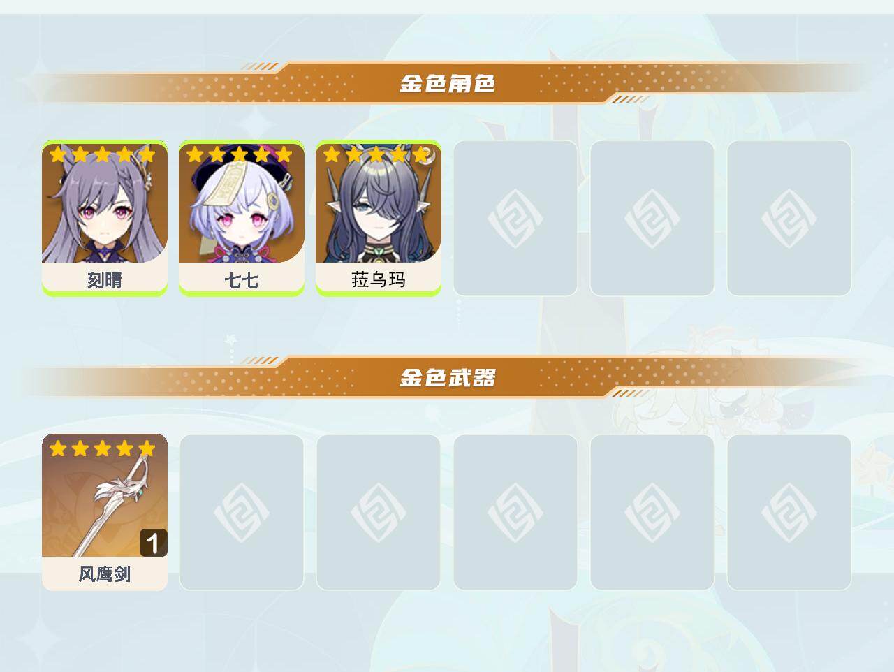 【ysf1570】25级/4黄/女主/3个五星角色/1个五星武器/0命菈乌玛/0命刻晴/0命七七/精1风鹰剑