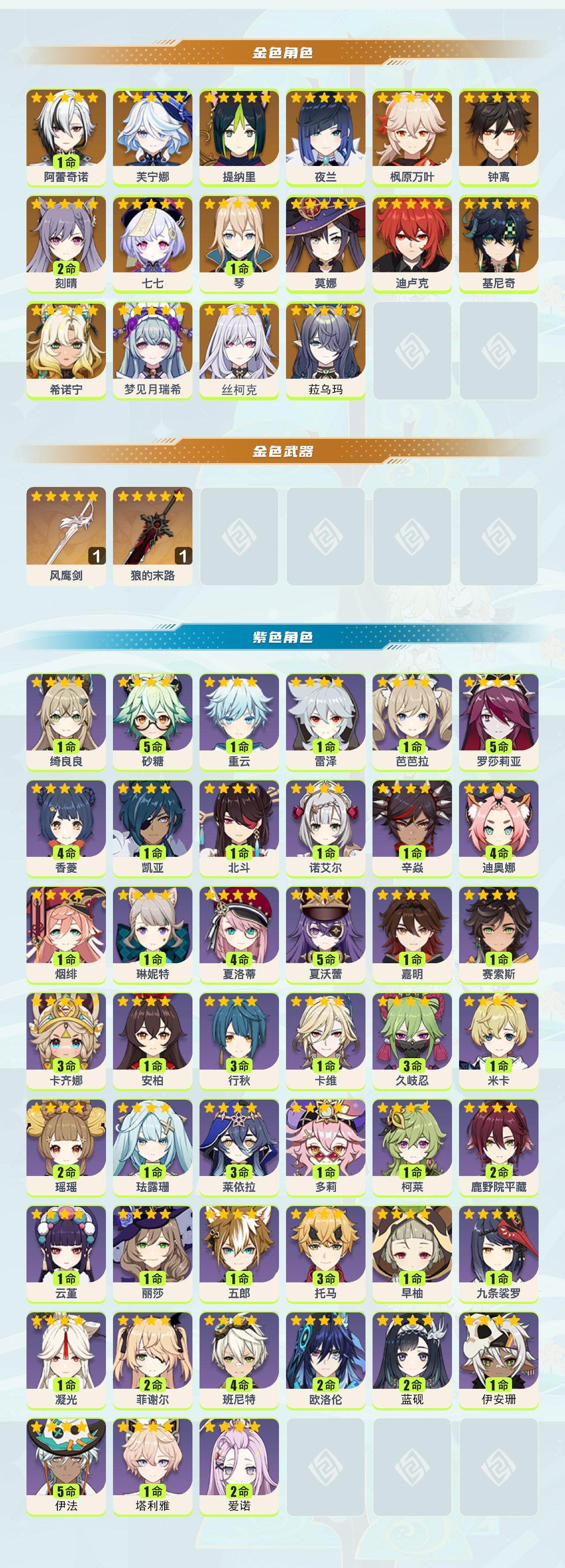 【ysz2983】57级/22黄/女主/18个五星角色/2个五星武器/0命菈乌玛/0命丝柯克/0命梦见月瑞希/0命希诺宁/0命基尼奇/1命阿蕾奇诺/0命芙宁娜/0命提纳里/0命夜兰/0命枫原万叶/0命钟离/1命琴/2命刻晴/0命迪卢克/0命莫娜/0命七七/精1狼的末路/精1风鹰剑/2命爱诺/1命塔利雅/5命伊法/1命伊安珊/2命蓝砚/2命欧洛伦/3命卡齐娜/1命赛索斯/0命嘉明/5命夏沃蕾/4命夏洛蒂/0命琳妮特/1命绮良良/1命卡维/1命米卡/2命瑶瑶/0命珐露珊/3命莱依拉/0命多莉/0命柯莱/2命鹿野院平藏/3命久岐忍/0命云堇/1命五郎/3命托马/1命九条裟罗/0命早柚/1命烟绯/5命罗莎莉亚/1命辛焱/4命迪奥娜/5命砂糖/0命雷泽/2命菲谢尔/0命丽莎/0命北斗/4命香菱/0命安柏/4命班尼特/3命行秋/1命芭芭拉/1命凝光/1命诺艾尔/1命凯亚/0命重云