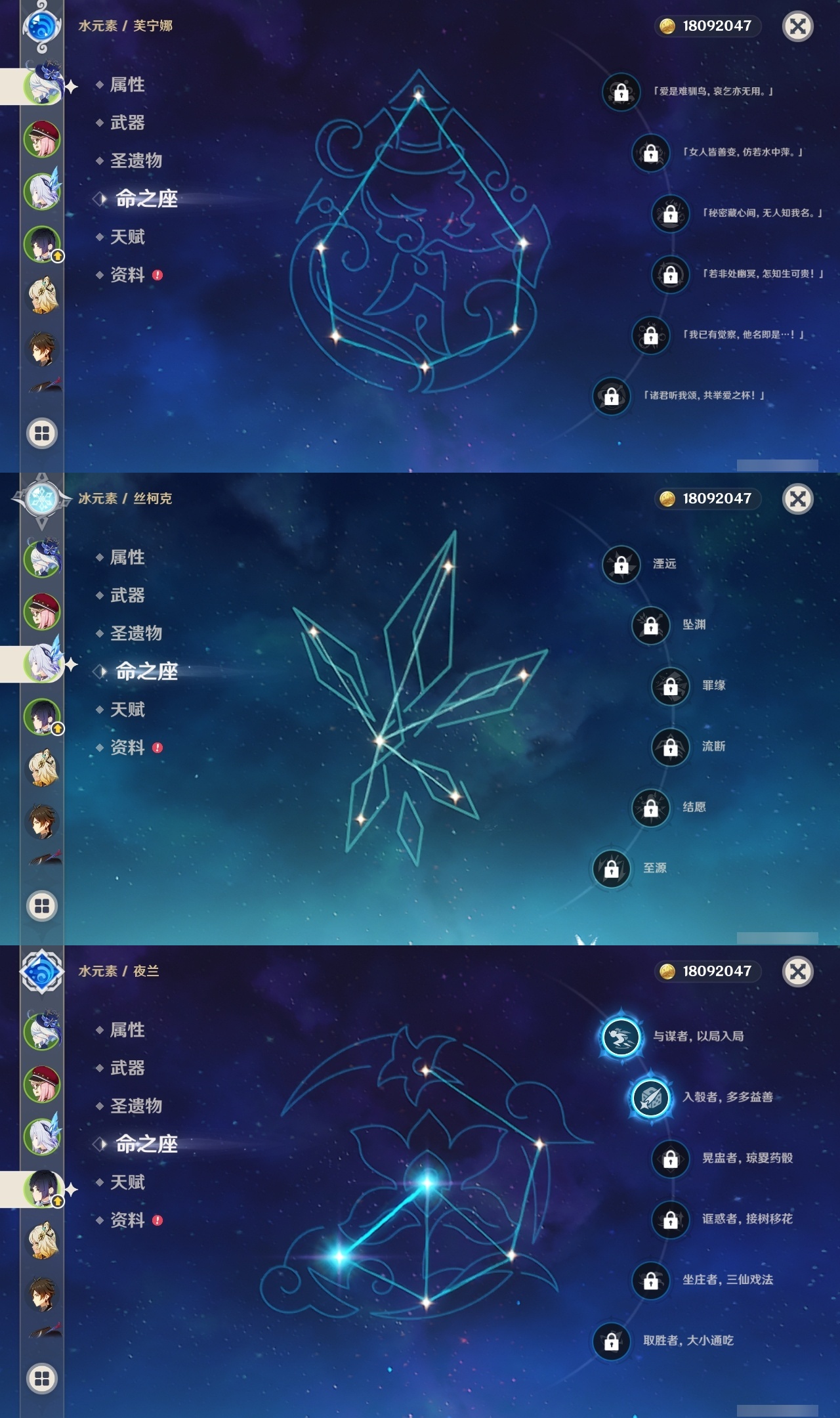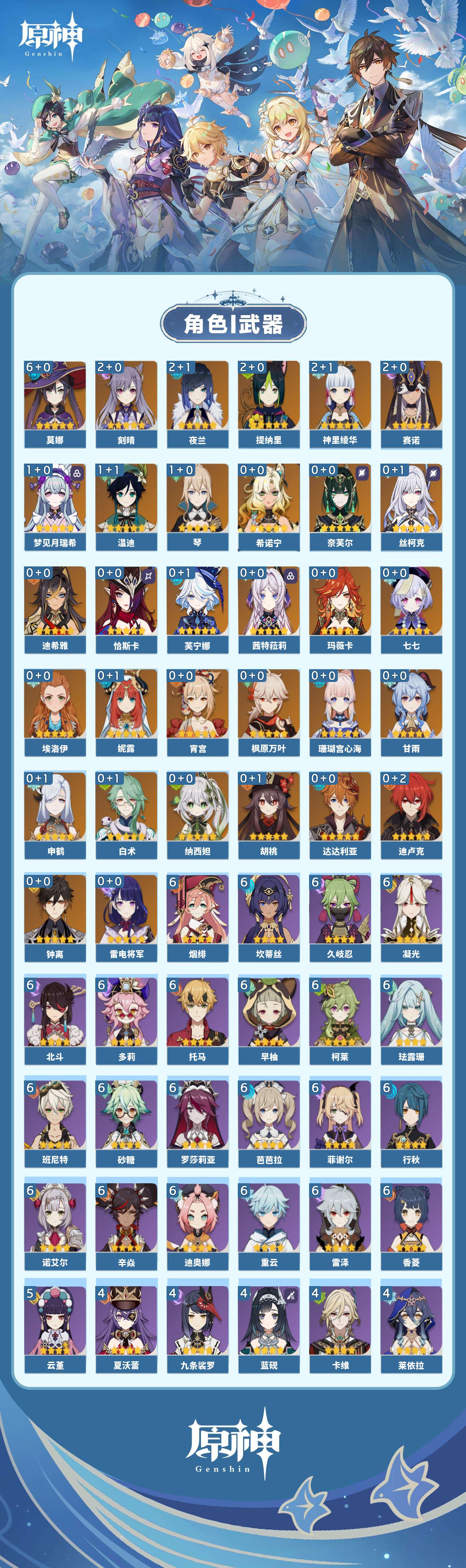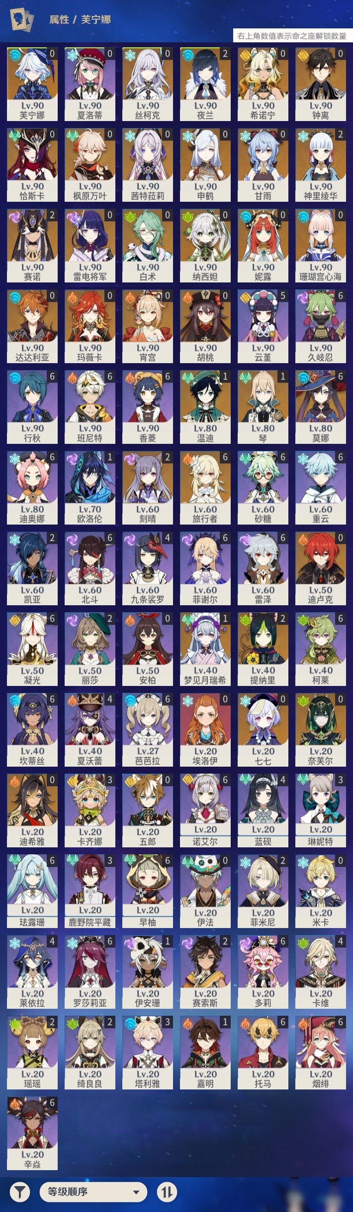 【原神】【lyys11509】冒险等级:60,五星数量:49,五星角色:莫娜 6命刻晴 2命神里绫华 2命夜兰 2命提纳里 2命赛诺 2命梦见月瑞希 1命琴 1命温迪 1命七七珊瑚宫心海希诺宁白术恰斯卡玛薇卡茜特菈莉宵宫迪希雅钟离达达利亚申鹤芙宁娜丝柯克妮露纳西妲奈芙尔迪卢克枫原万叶甘雨胡桃雷电将军__五星武器:狼的末路 2精碧落之珑金流监督静水流涌之辉裁断苍耀图莱杜拉的回忆风鹰剑护摩之杖四风原典天空之卷天空之刃雾切之回光终末嗟叹之诗息灾若水圣显之钥__四星角色:班尼特 6命行秋 6命香菱 6命久岐忍 6命珐露珊 6命凝光 6命迪奥娜 6命砂糖 6命坎蒂丝 6命多莉 6命柯莱 6命芭芭拉 6命早柚 6命托马 6命烟绯 6命重云 6命辛焱 6命诺艾尔 6命罗莎莉亚 6命雷泽 6命菲谢尔 6命北斗 6命云堇 5命九条裟罗 4命莱依拉 4命卡维 4命蓝砚 4命夏沃蕾 4命卡齐娜 3命鹿野院平藏 3命琳妮特 3命塔利雅 3命绮良良 2命瑶瑶 2命菲米尼 2命赛索斯 2命欧洛伦 1命嘉明 1命伊安珊 1命埃洛伊米卡五郎夏洛蒂伊法
