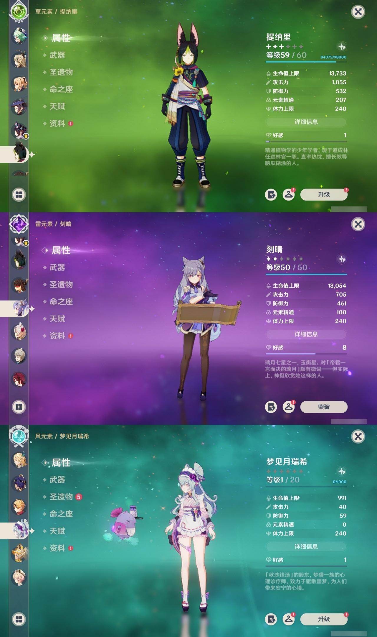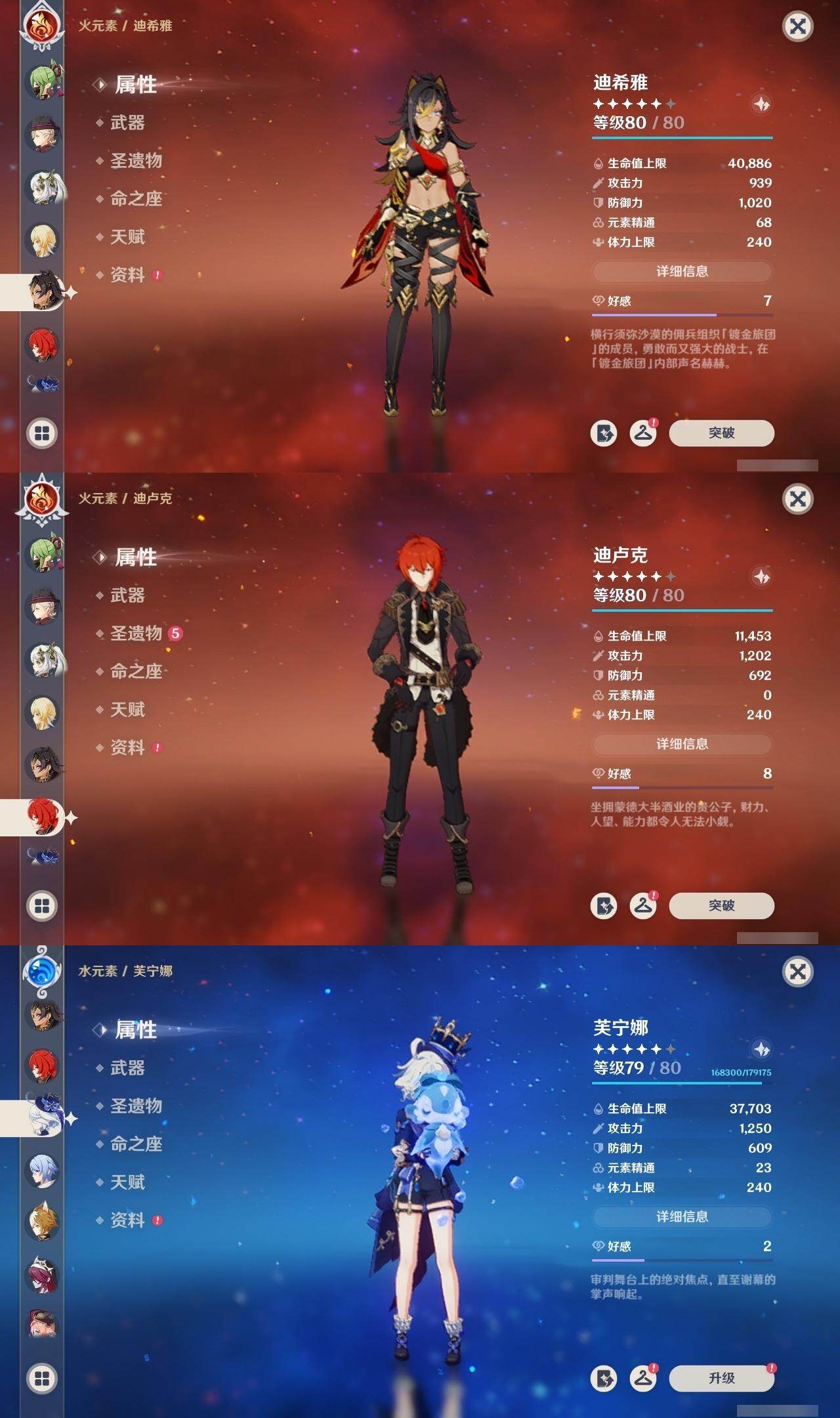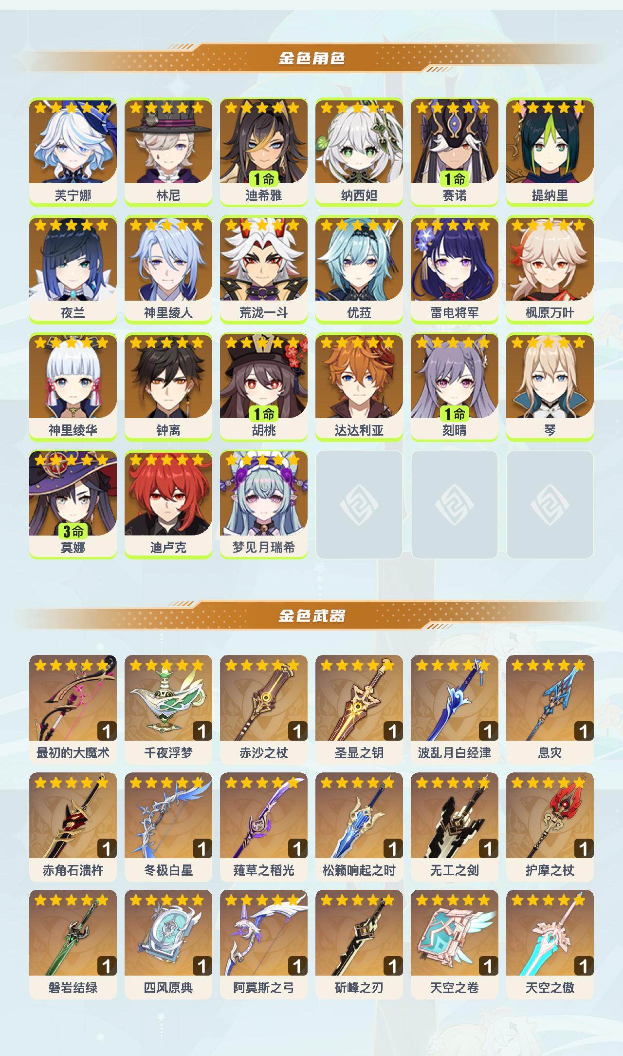 60级/50黄/女主/21个五星角色/22个五星武器 0命芙宁娜0命林尼1命迪希雅0命纳西妲1命赛诺0命提纳里0命夜兰0命神里绫人0命荒泷一斗0命优菈0命雷电将军0命枫原万叶0命神里绫华0命钟离1命胡桃0命达达利亚1命刻晴0命琴3命莫娜0命迪卢克0命梦见月瑞希精1最初的大魔术精1千夜浮梦精1赤沙之杖精1圣显之钥精1波乱月白经津精1息灾精1赤角石溃杵精1冬极白星精1薙草之稻光精1松籁响起之时精1无工之剑精1护摩之杖精1磐岩结绿精1四风原典精1阿莫斯之弓精1斫峰之刃精1天空之卷精1天空之傲