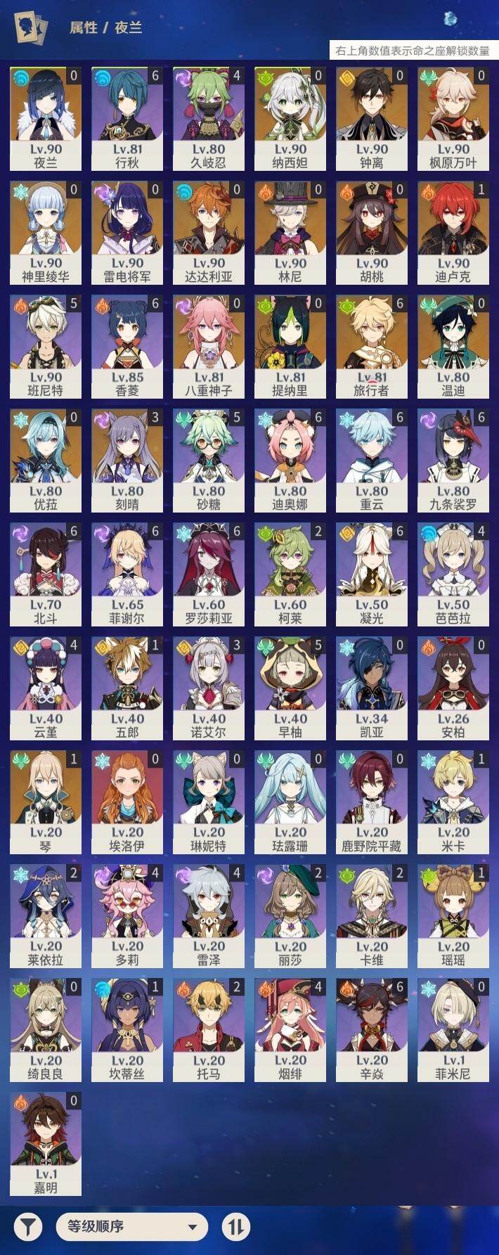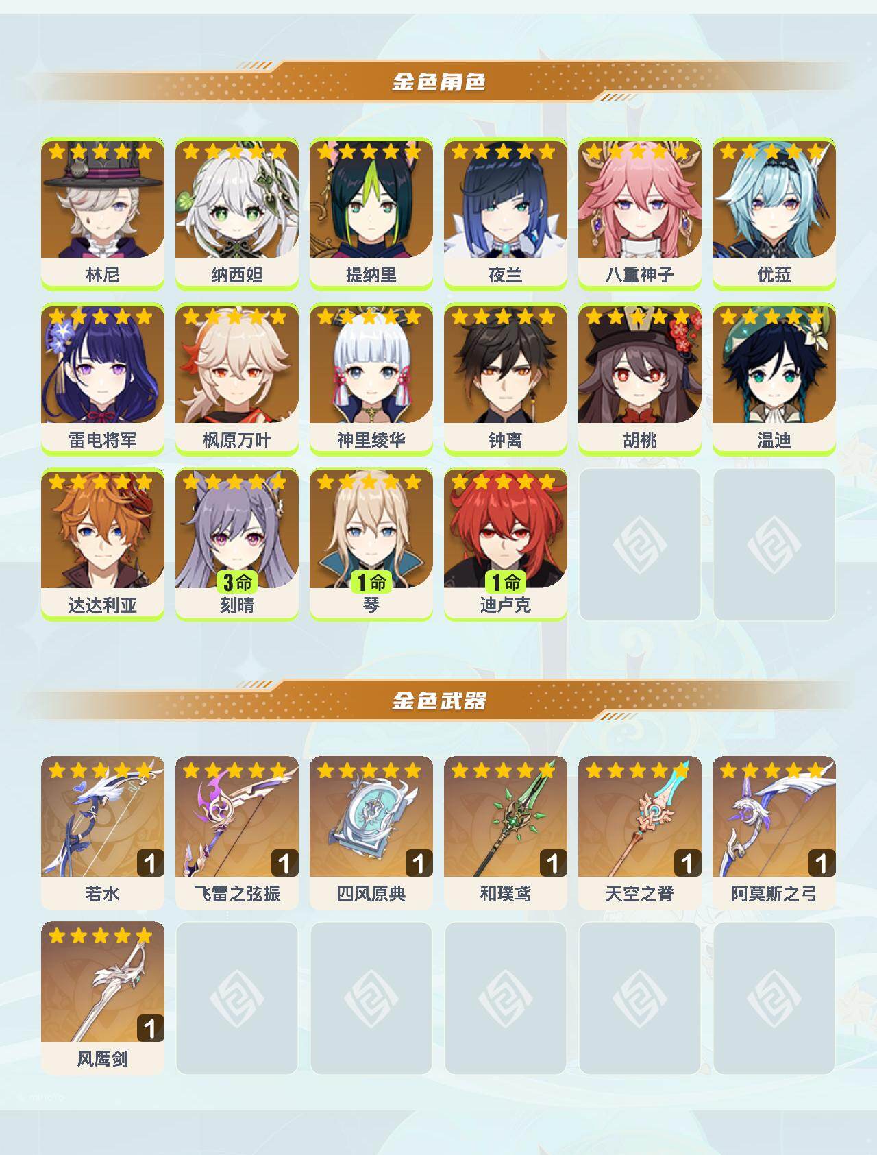 【店主推荐捡漏号】59级/29黄/男主/16个五星角色/8个五星武器 0命林尼0命纳西妲0命提纳里0命夜兰0命八重神子0命优菈0命雷电将军0命枫原万叶0命神里绫华0命钟离0命胡桃0命温迪0命达达利亚3命刻晴1命琴1命迪卢克精1若水精1飞雷之弦振精1四风原典精1和璞鸢精1天空之脊精1阿莫斯之弓精1风鹰剑