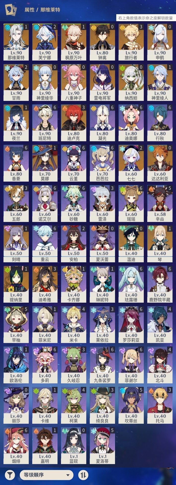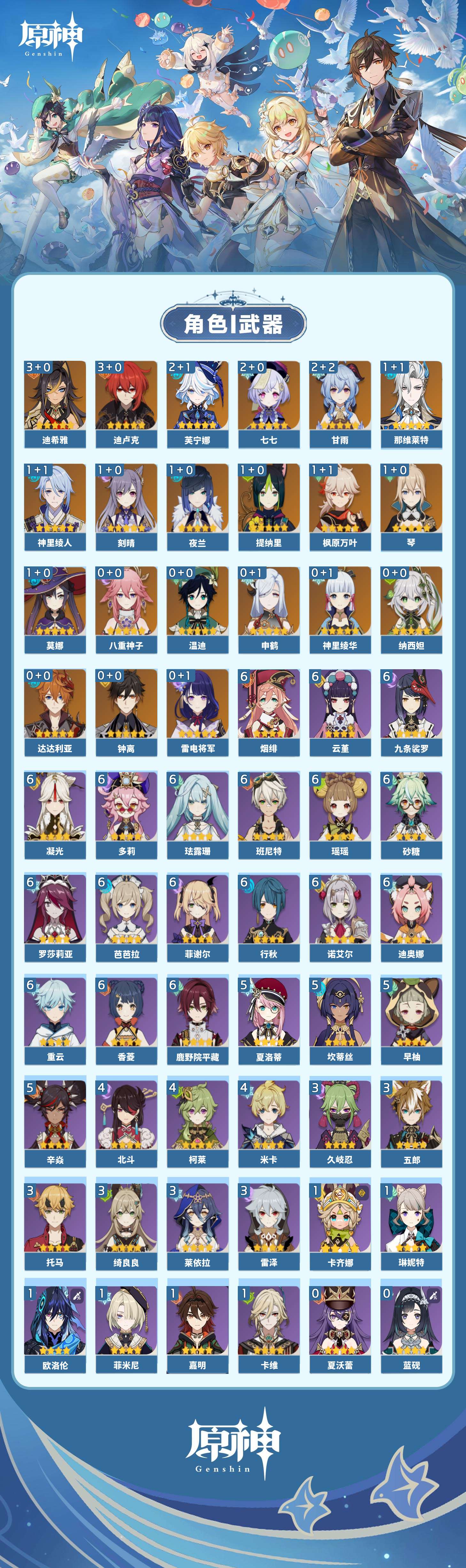 【原神】【lyys11571】冒险等级:60,五星数量:36,五星角色:迪希雅 3命迪卢克 3命芙宁娜 2命甘雨 2命七七 2命那维莱特 1命枫原万叶 1命刻晴 1命莫娜 1命琴 1命神里绫人 1命夜兰 1命提纳里 1命神里绫华温迪钟离达达利亚申鹤八重神子纳西妲雷电将军__五星武器:阿莫斯之弓 2精万世流涌大典金流监督静水流涌之辉不灭月华苍古自由之誓风鹰剑天空之傲天空之卷天空之刃天空之翼雾切之回光薙草之稻光息灾波乱月白经津__四星角色:班尼特 6命行秋 6命九条裟罗 6命香菱 6命鹿野院平藏 6命珐露珊 6命凝光 6命迪奥娜 6命砂糖 6命瑶瑶 6命多莉 6命芭芭拉 6命云堇 6命烟绯 6命重云 6命诺艾尔 6命罗莎莉亚 6命菲谢尔 6命坎蒂丝 5命早柚 5命辛焱 5命夏洛蒂 5命米卡 4命柯莱 4命北斗 4命久岐忍 3命绮良良 3命莱依拉 3命托马 3命五郎 3命雷泽 3命卡齐娜 1命卡维 1命欧洛伦 1命菲米尼 1命琳妮特 1命嘉明 1命蓝砚夏沃蕾