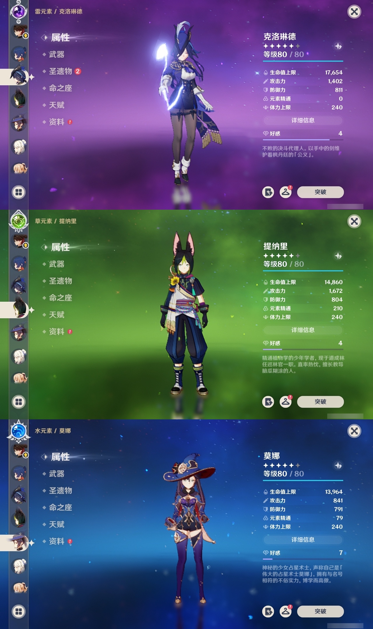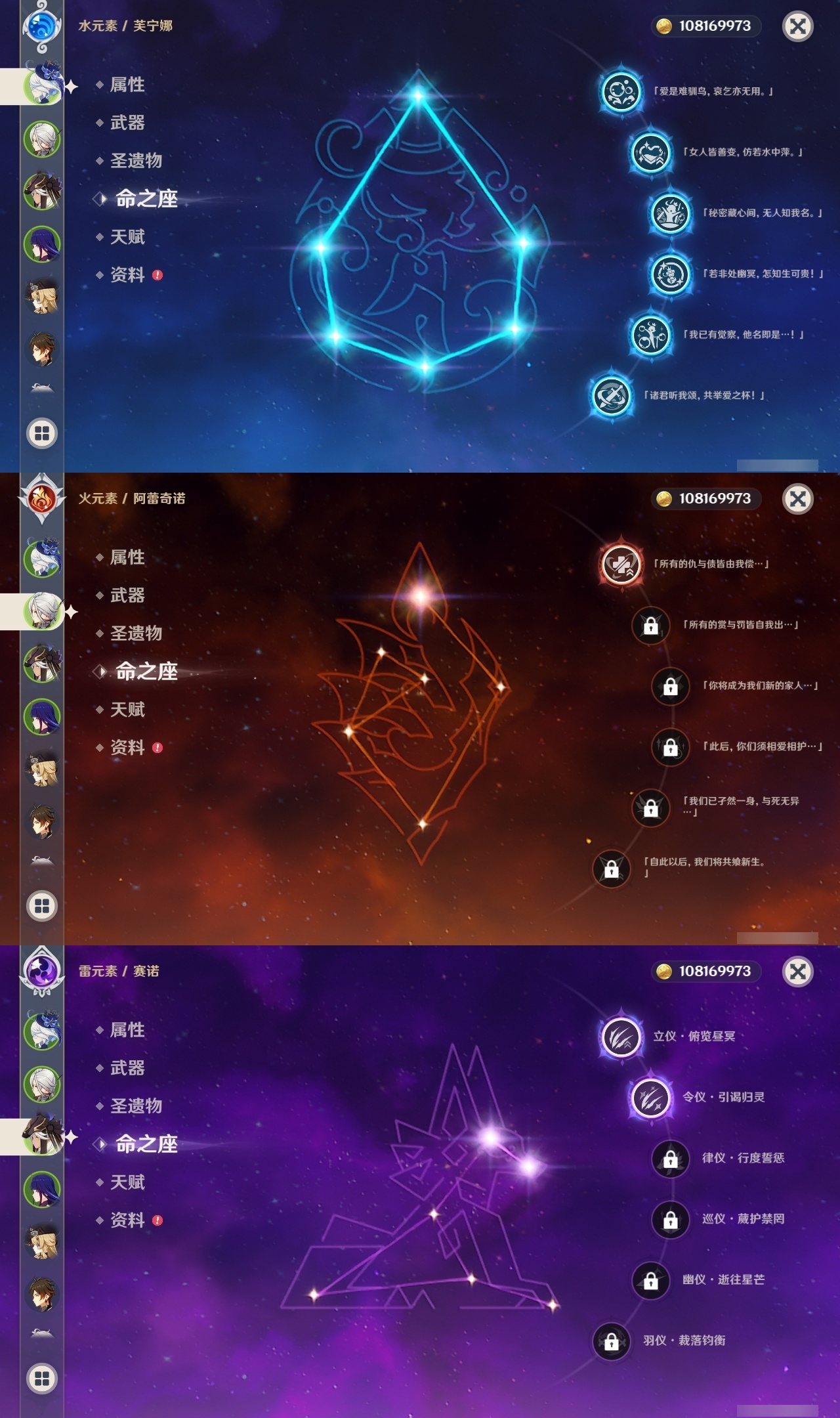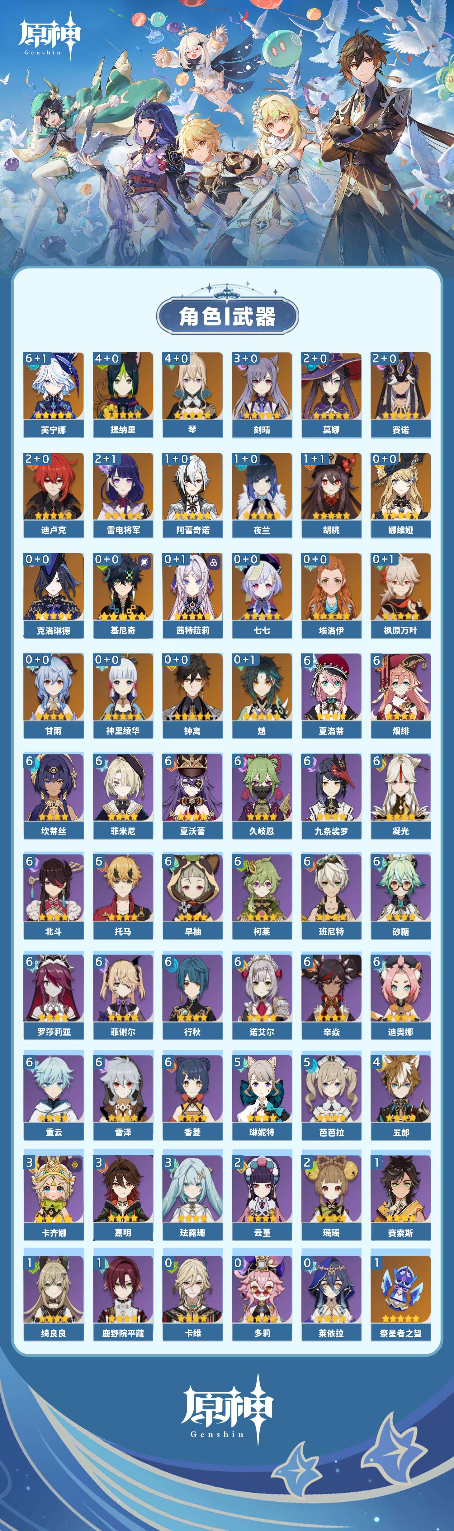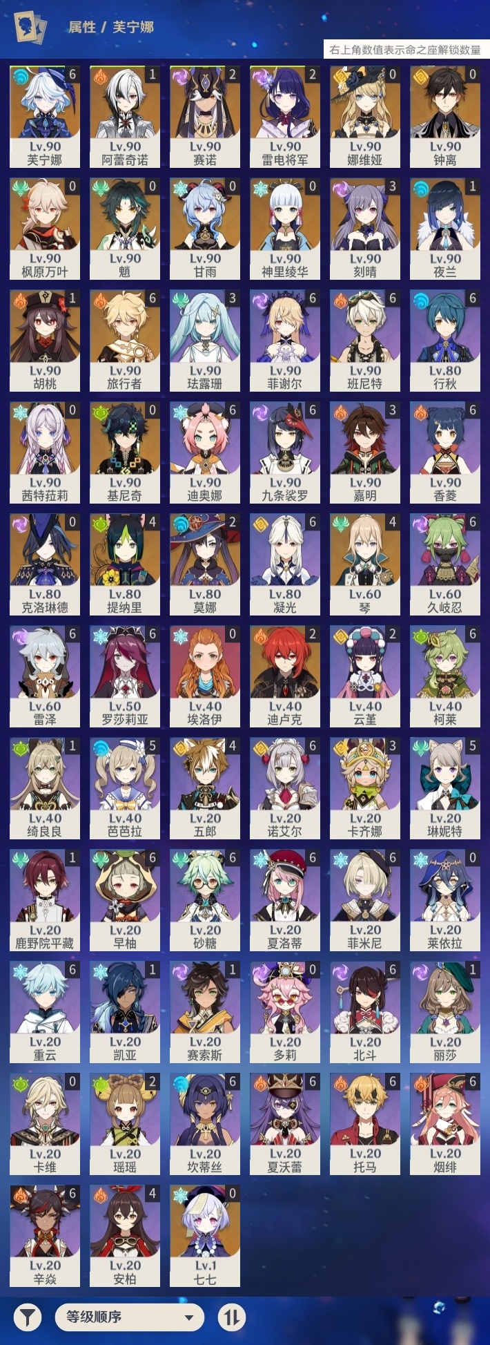 【原神】【lyys11552】冒险等级:60,五星数量:34,五星角色:芙宁娜 6命琴 4命提纳里 4命刻晴 3命迪卢克 2命雷电将军 2命莫娜 2命赛诺 2命阿蕾奇诺 1命胡桃 1命夜兰 1命七七基尼奇神里绫华茜特菈莉钟离娜维娅枫原万叶甘雨魈克洛琳德__五星武器:祭星者之望焚曜千阳静水流涌之辉苍古自由之誓风鹰剑和璞鸢护摩之杖天空之傲天空之卷天空之翼薙草之稻光息灾__四星角色:班尼特 6命行秋 6命九条裟罗 6命香菱 6命久岐忍 6命凝光 6命迪奥娜 6命砂糖 6命坎蒂丝 6命柯莱 6命早柚 6命托马 6命烟绯 6命重云 6命辛焱 6命诺艾尔 6命罗莎莉亚 6命雷泽 6命菲谢尔 6命北斗 6命菲米尼 6命夏洛蒂 6命夏沃蕾 6命芭芭拉 5命琳妮特 5命五郎 4命卡齐娜 3命珐露珊 3命嘉明 3命瑶瑶 2命云堇 2命鹿野院平藏 1命绮良良 1命赛索斯 1命埃洛伊莱依拉多莉卡维