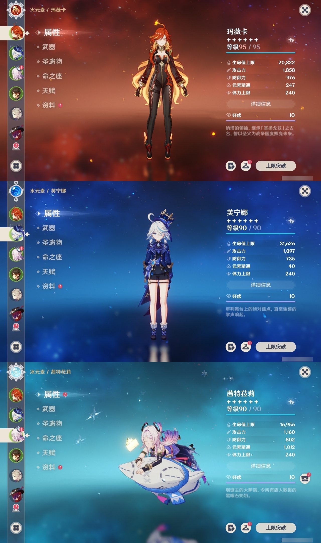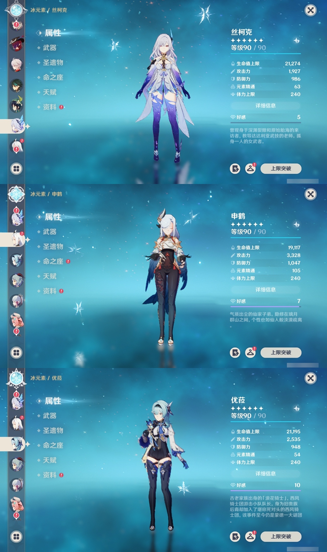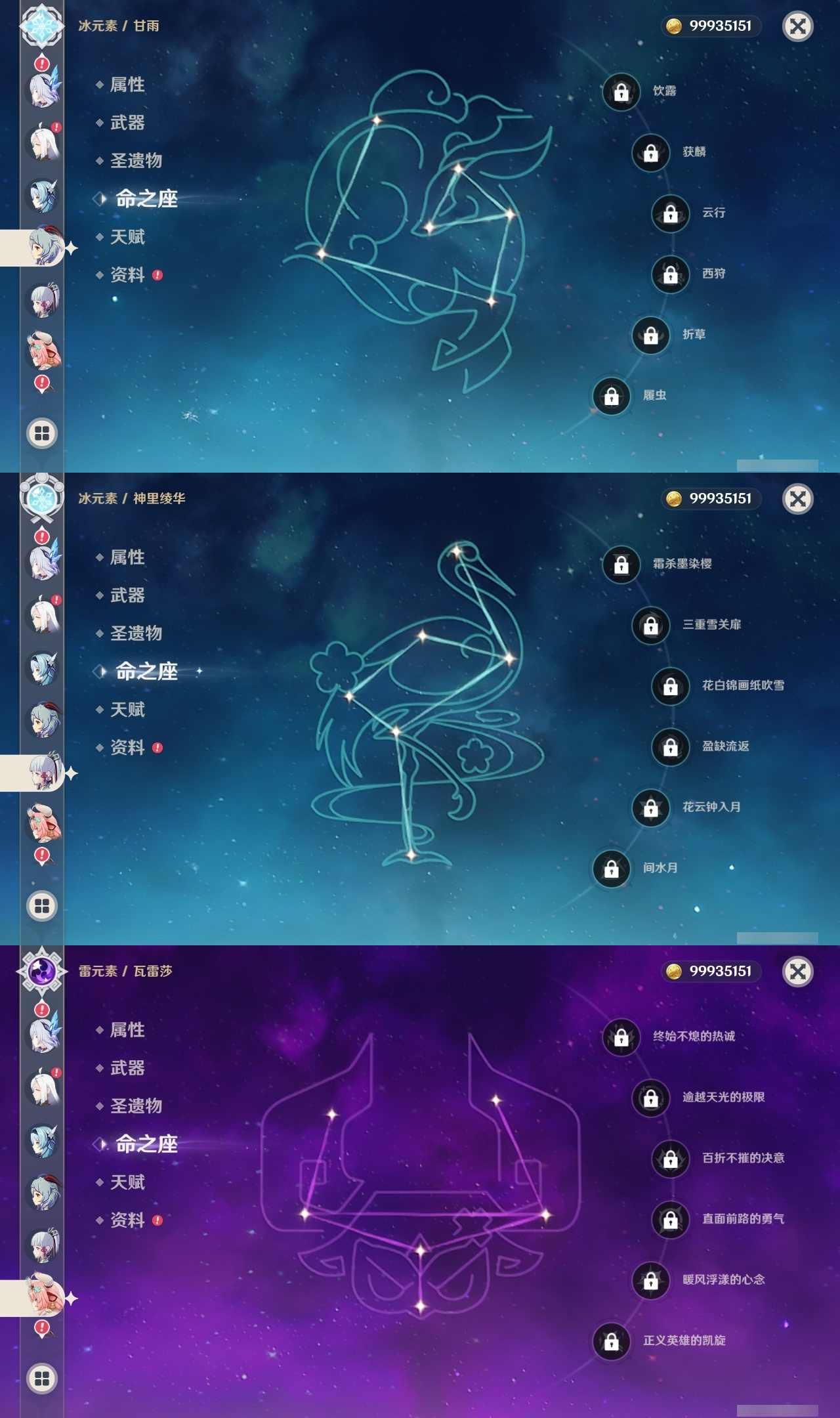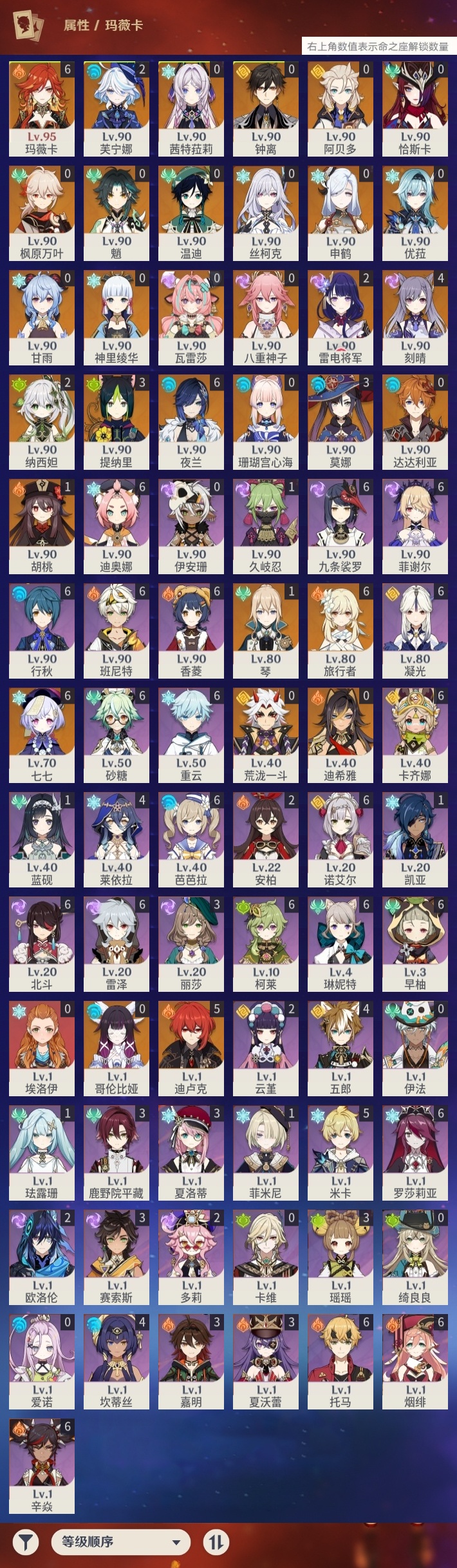 【原神】满命,冒险等级:60,五星数量:49,五星角色:玛薇卡 6命七七 6命夜兰 6命迪卢克 5命刻晴 4命莫娜 3命提纳里 3命芙宁娜 2命雷电将军 2命纳西妲 2命胡桃 1命琴 1命珊瑚宫心海神里绫华温迪恰斯卡茜特菈莉优菈迪希雅钟离荒泷一斗达达利亚申鹤瓦雷莎八重神子阿贝多丝柯克哥伦比娅枫原万叶甘雨魈__五星武器:焚曜千阳金流监督真语秘匣阿莫斯之弓不灭月华风鹰剑护摩之杖狼的末路磐岩结绿四风原典天空之傲天空之脊天空之卷天空之翼雾切之回光若水千夜浮梦__四星角色:卡齐娜 6命班尼特 6命行秋 6命九条裟罗 6命香菱 6命凝光 6命迪奥娜 6命砂糖 6命柯莱 6命芭芭拉 6命早柚 6命托马 6命烟绯 6命重云 6命辛焱 6命诺艾尔 6命罗莎莉亚 6命雷泽 6命菲谢尔 6命北斗 6命琳妮特 6命米卡 5命莱依拉 4命坎蒂丝 4命五郎 4命鹿野院平藏 3命瑶瑶 3命夏洛蒂 3命夏沃蕾 3命嘉明 3命赛索斯 3命多莉 2命欧洛伦 2命云堇 2命久岐忍 1命珐露珊 1命蓝砚 1命菲米尼 1命埃洛伊绮良良卡维伊法伊安珊爱诺