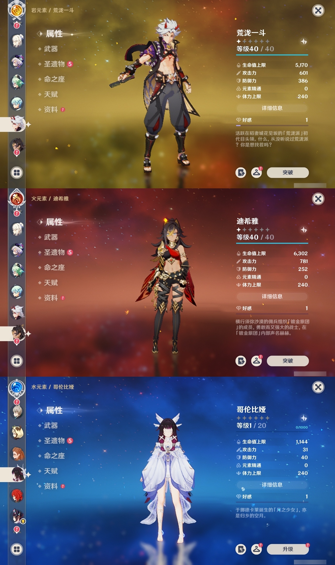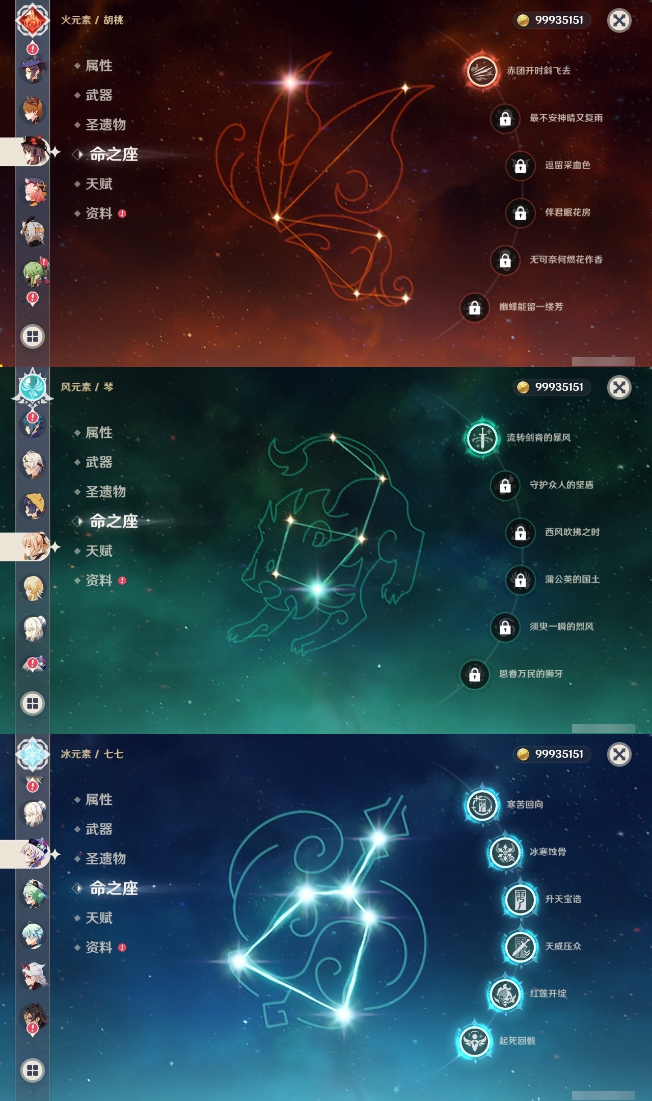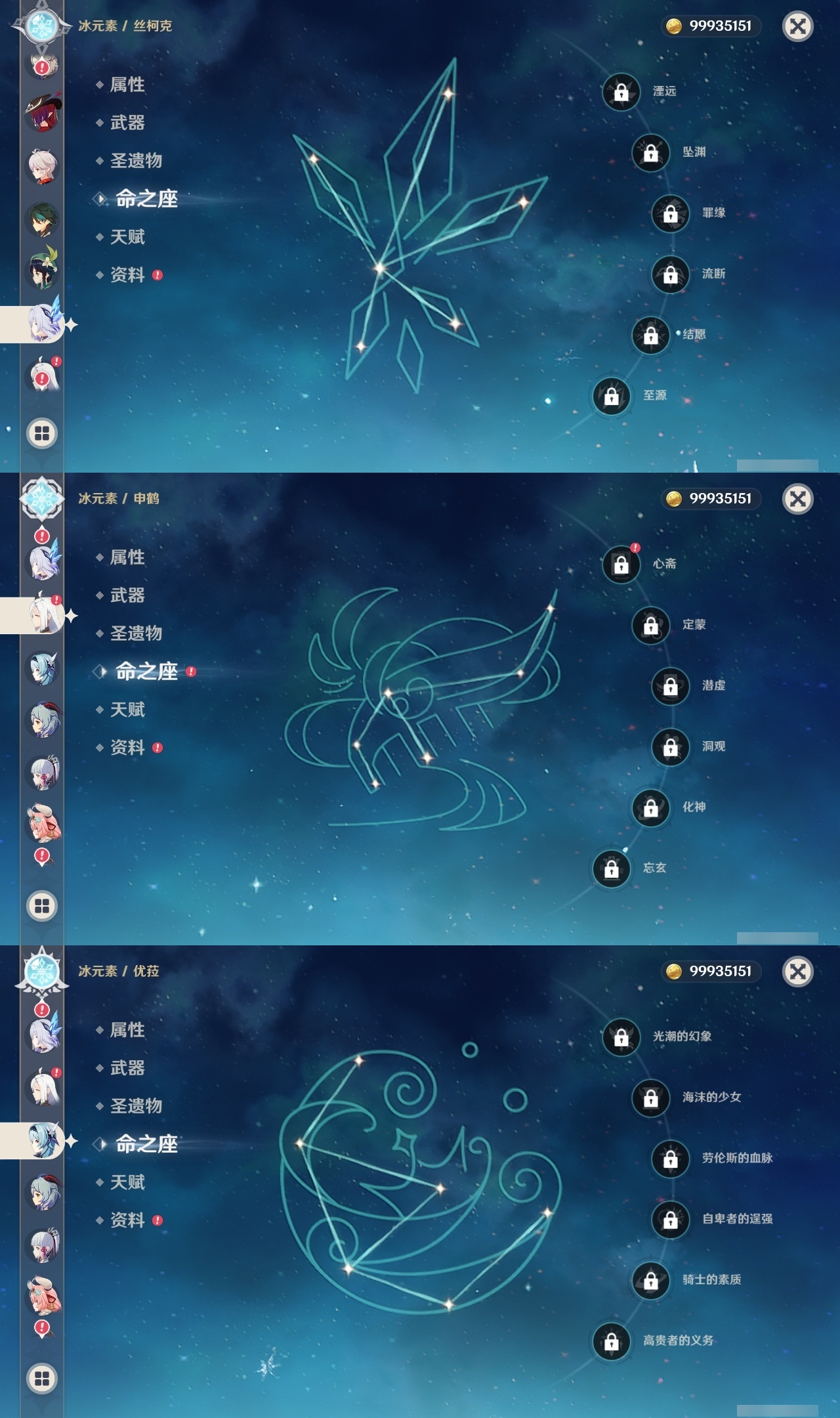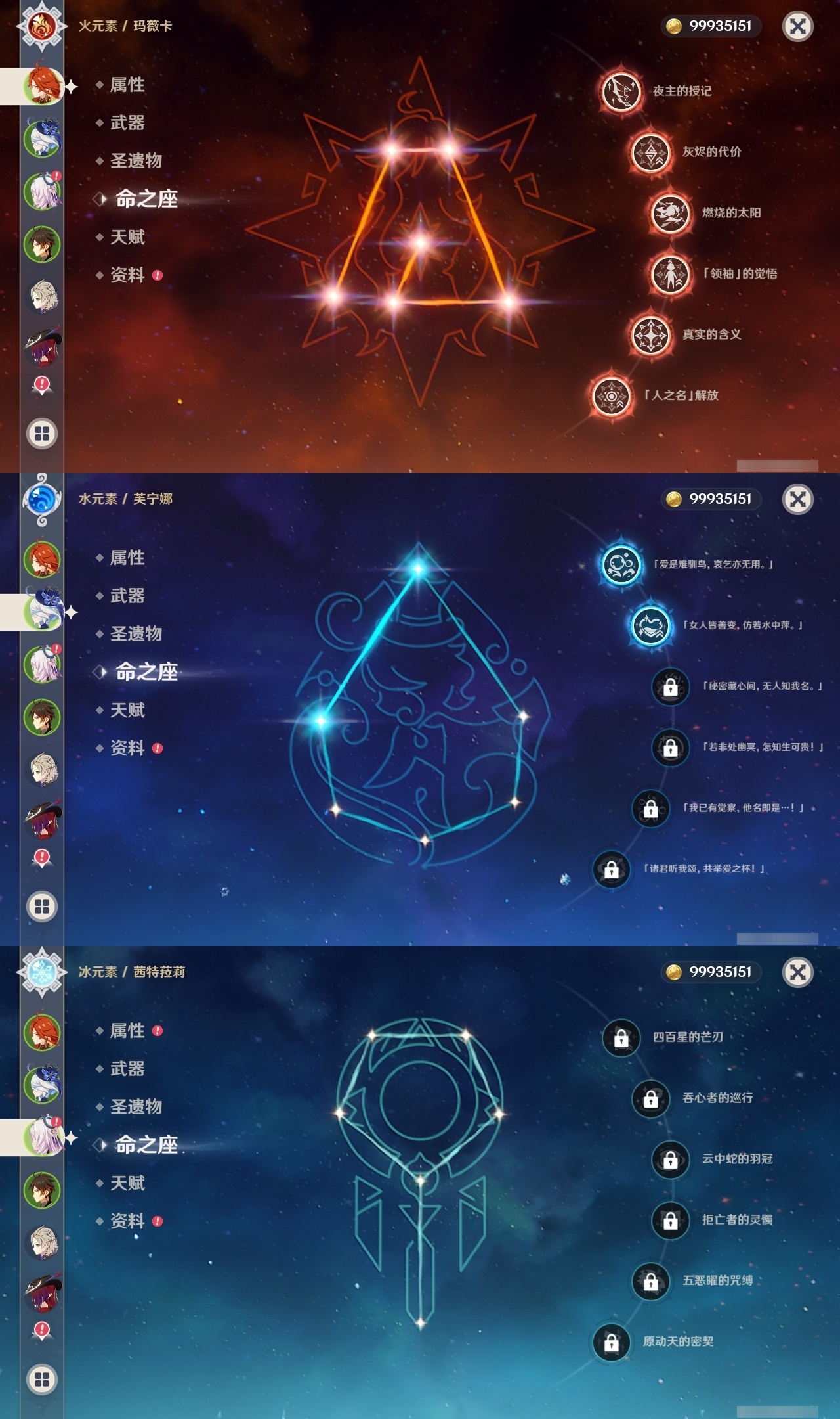 【原神】满命,冒险等级:60,五星数量:49,五星角色:玛薇卡 6命七七 6命夜兰 6命迪卢克 5命刻晴 4命莫娜 3命提纳里 3命芙宁娜 2命雷电将军 2命纳西妲 2命胡桃 1命琴 1命珊瑚宫心海神里绫华温迪恰斯卡茜特菈莉优菈迪希雅钟离荒泷一斗达达利亚申鹤瓦雷莎八重神子阿贝多丝柯克哥伦比娅枫原万叶甘雨魈__五星武器:焚曜千阳金流监督真语秘匣阿莫斯之弓不灭月华风鹰剑护摩之杖狼的末路磐岩结绿四风原典天空之傲天空之脊天空之卷天空之翼雾切之回光若水千夜浮梦__四星角色:卡齐娜 6命班尼特 6命行秋 6命九条裟罗 6命香菱 6命凝光 6命迪奥娜 6命砂糖 6命柯莱 6命芭芭拉 6命早柚 6命托马 6命烟绯 6命重云 6命辛焱 6命诺艾尔 6命罗莎莉亚 6命雷泽 6命菲谢尔 6命北斗 6命琳妮特 6命米卡 5命莱依拉 4命坎蒂丝 4命五郎 4命鹿野院平藏 3命瑶瑶 3命夏洛蒂 3命夏沃蕾 3命嘉明 3命赛索斯 3命多莉 2命欧洛伦 2命云堇 2命久岐忍 1命珐露珊 1命蓝砚 1命菲米尼 1命埃洛伊绮良良卡维伊法伊安珊爱诺