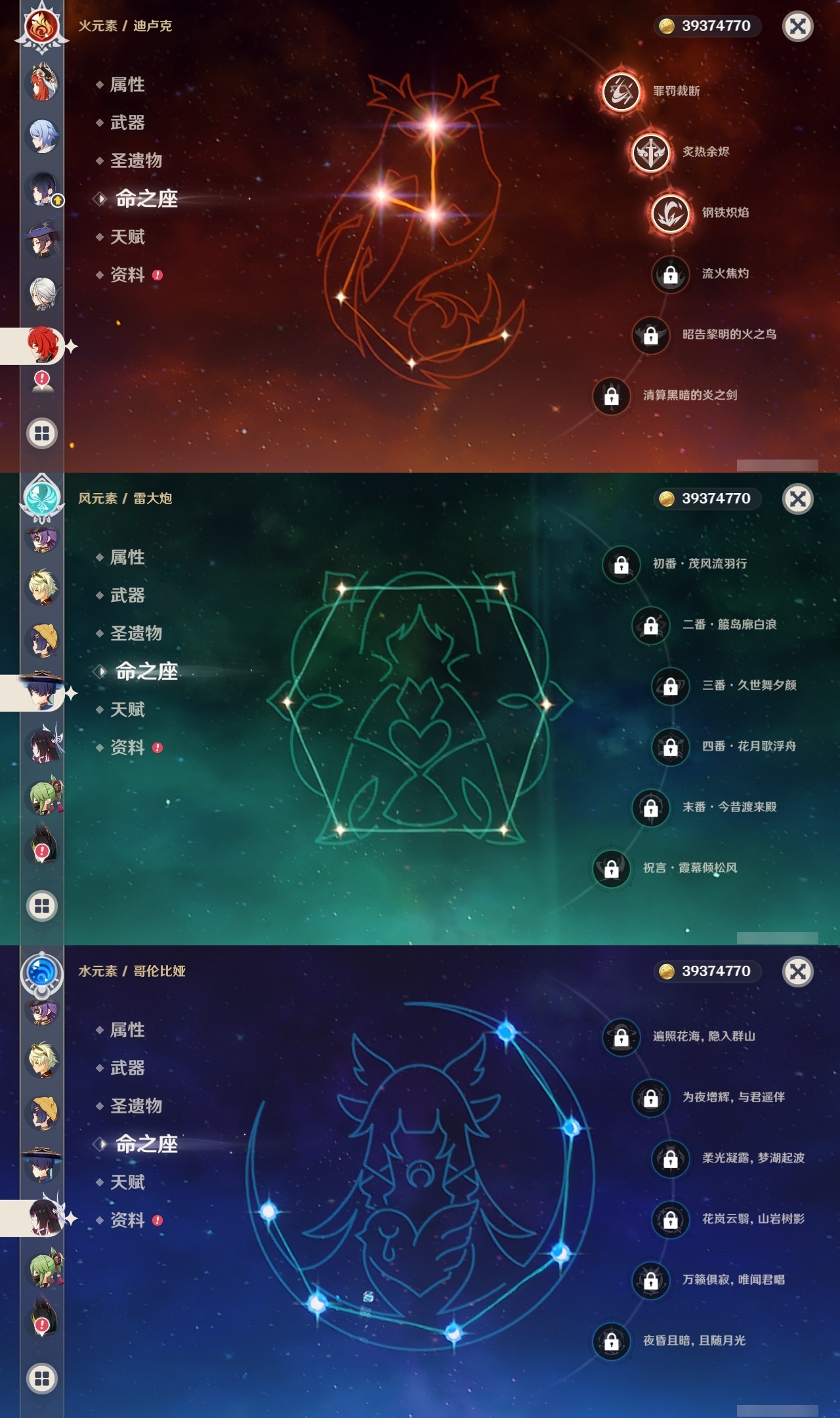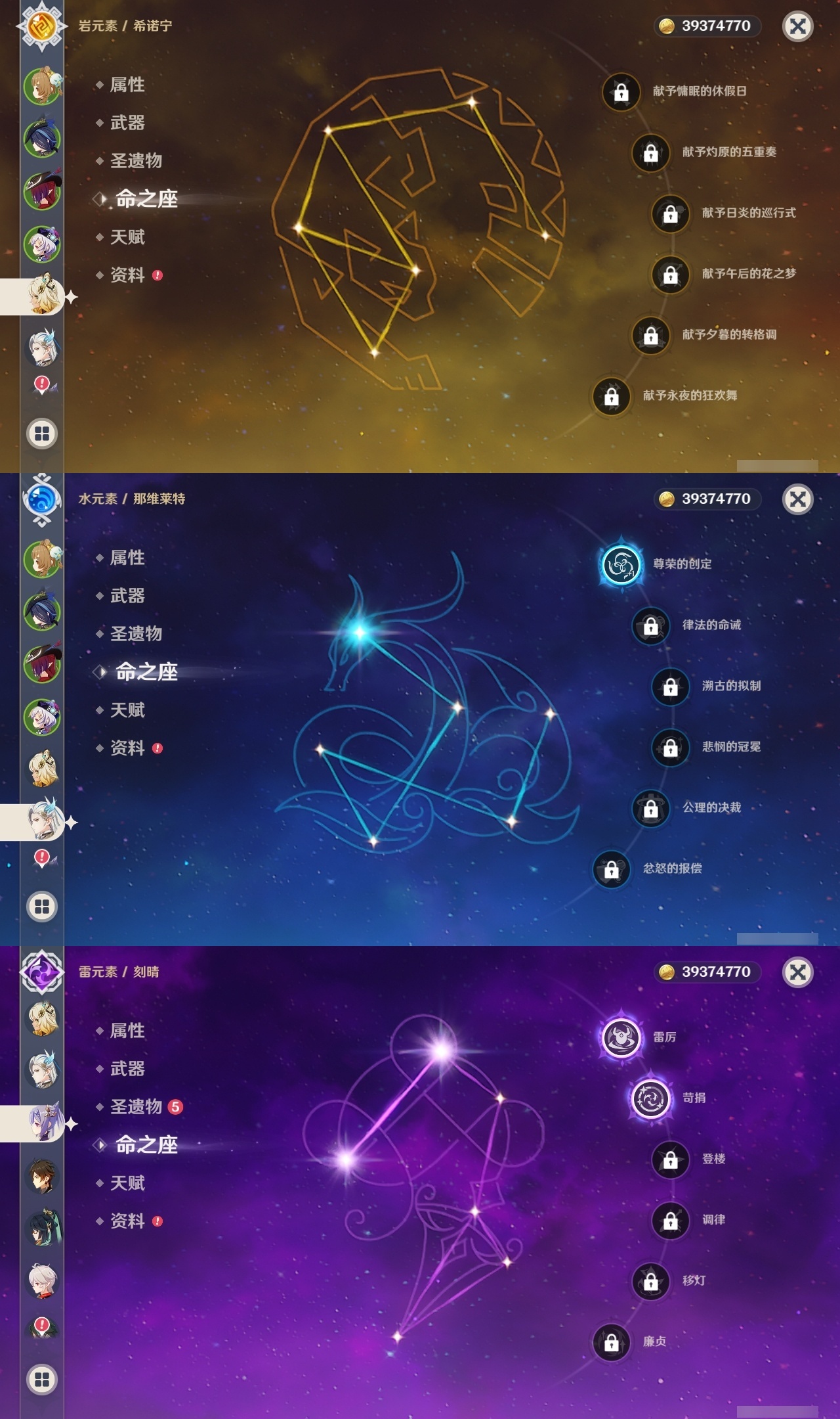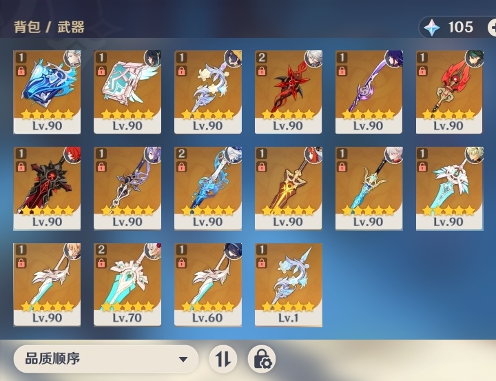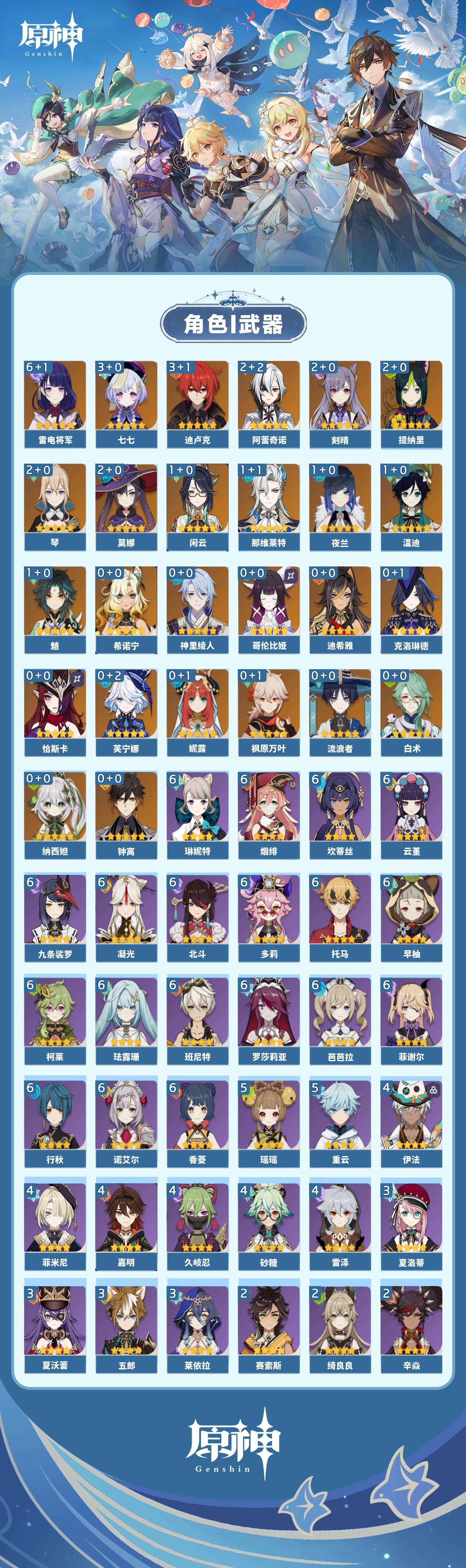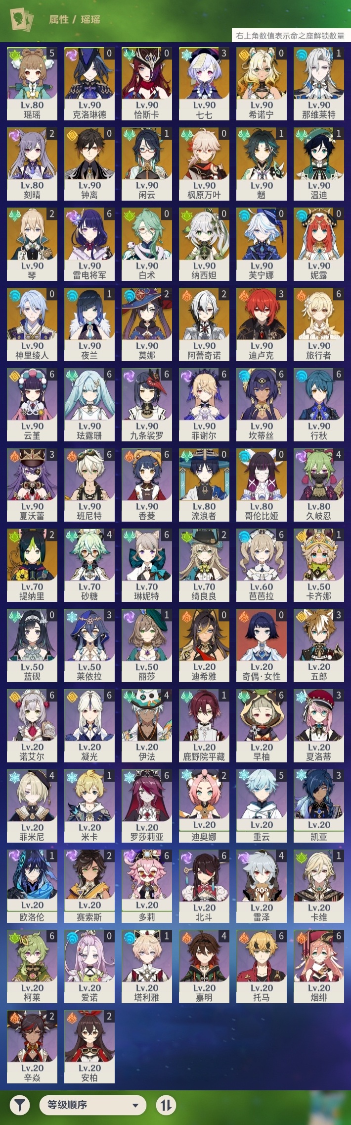 【原神】【lyys11547】冒险等级:60,五星数量:41,五星角色:雷电将军 6命迪卢克 3命七七 3命阿蕾奇诺 2命刻晴 2命莫娜 2命琴 2命提纳里 2命那维莱特 1命闲云 1命魈 1命温迪 1命夜兰 1命希诺宁白术恰斯卡迪希雅钟离神里绫人芙宁娜妮露纳西妲流浪者哥伦比娅枫原万叶克洛琳德__五星武器:静水流涌之辉 2精赤月之形 2精天空之傲 2精柔灯挽歌万世流涌大典苍古自由之誓风鹰剑护摩之杖狼的末路天空之卷天空之刃薙草之稻光圣显之钥赦罪__四星角色:班尼特 6命行秋 6命九条裟罗 6命香菱 6命珐露珊 6命凝光 6命坎蒂丝 6命多莉 6命柯莱 6命芭芭拉 6命云堇 6命早柚 6命托马 6命烟绯 6命诺艾尔 6命罗莎莉亚 6命菲谢尔 6命北斗 6命琳妮特 6命瑶瑶 5命重云 5命久岐忍 4命砂糖 4命雷泽 4命菲米尼 4命嘉明 4命伊法 4命莱依拉 3命五郎 3命夏洛蒂 3命夏沃蕾 3命迪奥娜 2命绮良良 2命辛焱 2命赛索斯 2命卡齐娜 1命鹿野院平藏 1命米卡 1命卡维 1命欧洛伦 1命塔利雅 1命奇偶·女性蓝砚爱诺