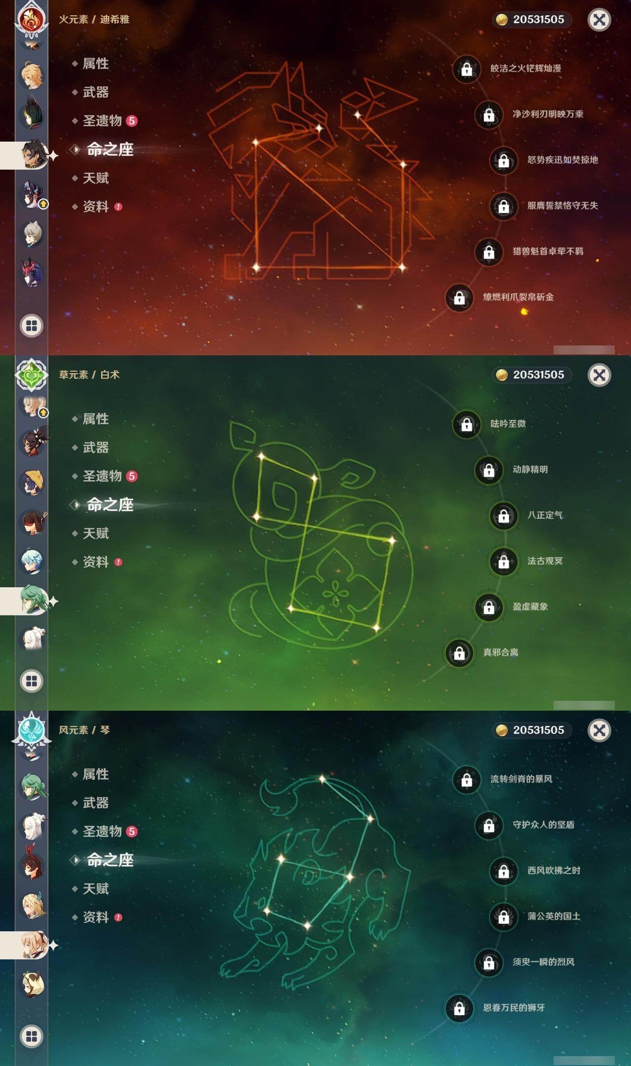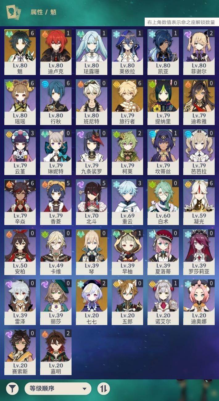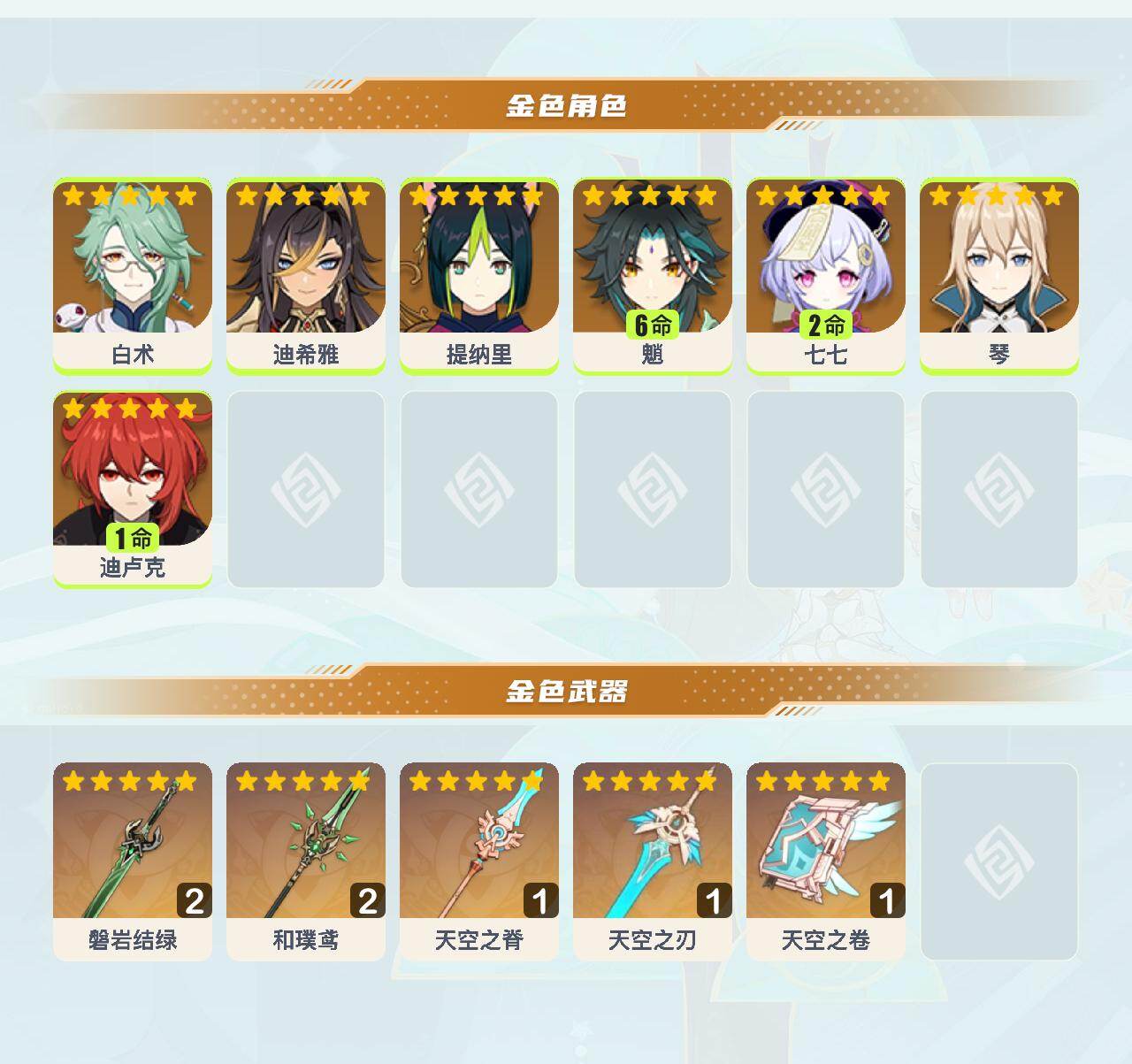 [16498060]45级/23黄/男主/7个五星角色/5个五星武器 0命白术0命迪希雅0命提纳里满命魈2命七七0命琴1命迪卢克精2磐岩结绿精2和璞鸢精1天空之脊精1天空之刃精1天空之卷