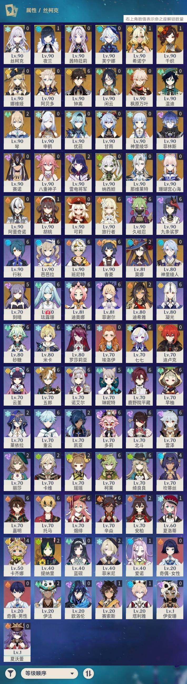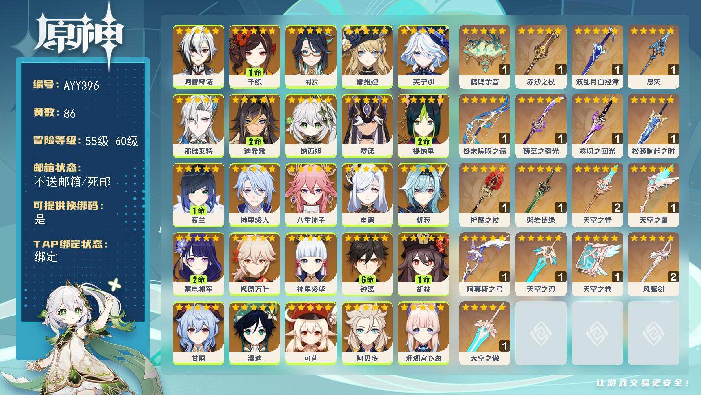 [16499044]60级/86黄/女主/34个五星角色/19个五星武器 0命阿蕾奇诺1命千织0命闲云0命娜维娅0命芙宁娜0命那维莱特2命迪希雅0命纳西妲0命赛诺2命提纳里1命夜兰0命神里绫人0命八重神子0命申鹤0命优菈2命雷电将军0命枫原万叶0命神里绫华满命钟离1命胡桃0命甘雨0命温迪0命可莉0命阿贝多0命珊瑚宫心海5命刻晴满命七七2命琴2命莫娜0命迪卢克1命希诺宁0命茜特菈莉0命丝柯克0命菲林斯精1鹤鸣余音精1赤沙之杖精1波乱月白经津精1息灾精1终末嗟叹之诗精1薙草之稻光精1雾切之回光精1松籁响起之时精1护摩之杖精1磐岩结绿精2天空之脊精1天空之翼精1阿莫斯之弓精1天空之刃精1天空之卷精2风鹰剑精1天空之傲