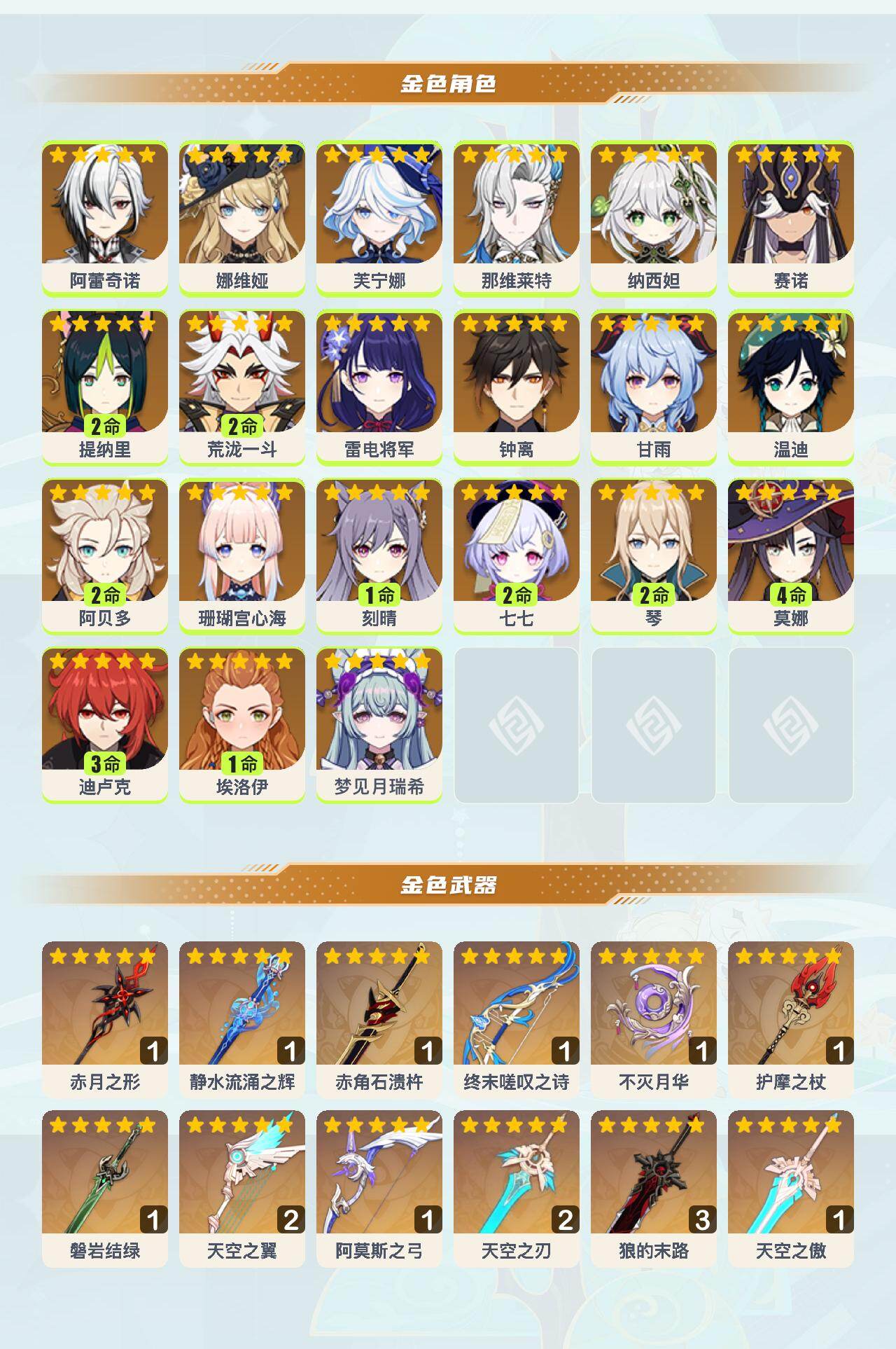 【ysyt803】60级/55黄/女主/21个五星角色/12个五星武器/0命阿蕾奇诺/0命娜维娅/2命荒泷一斗/2命阿贝多/0命芙宁娜/0命那维莱特/0命钟离/0命温迪/2命琴/0命甘雨/0命雷电将军/1命刻晴/0命纳西妲/2命提纳里/0命珊瑚宫心海/4命莫娜/2命七七/3命迪卢克/0命赛诺/0命梦见月瑞希/0命埃洛伊/精1终末嗟叹之诗/精1阿莫斯之弓/精2天空之翼/精1不灭月华/精1赤月之形/精1护摩之杖/精1赤角石溃杵/精1静水流涌之辉/精1磐岩结绿/精2天空之刃/精3狼的末路/精1天空之傲