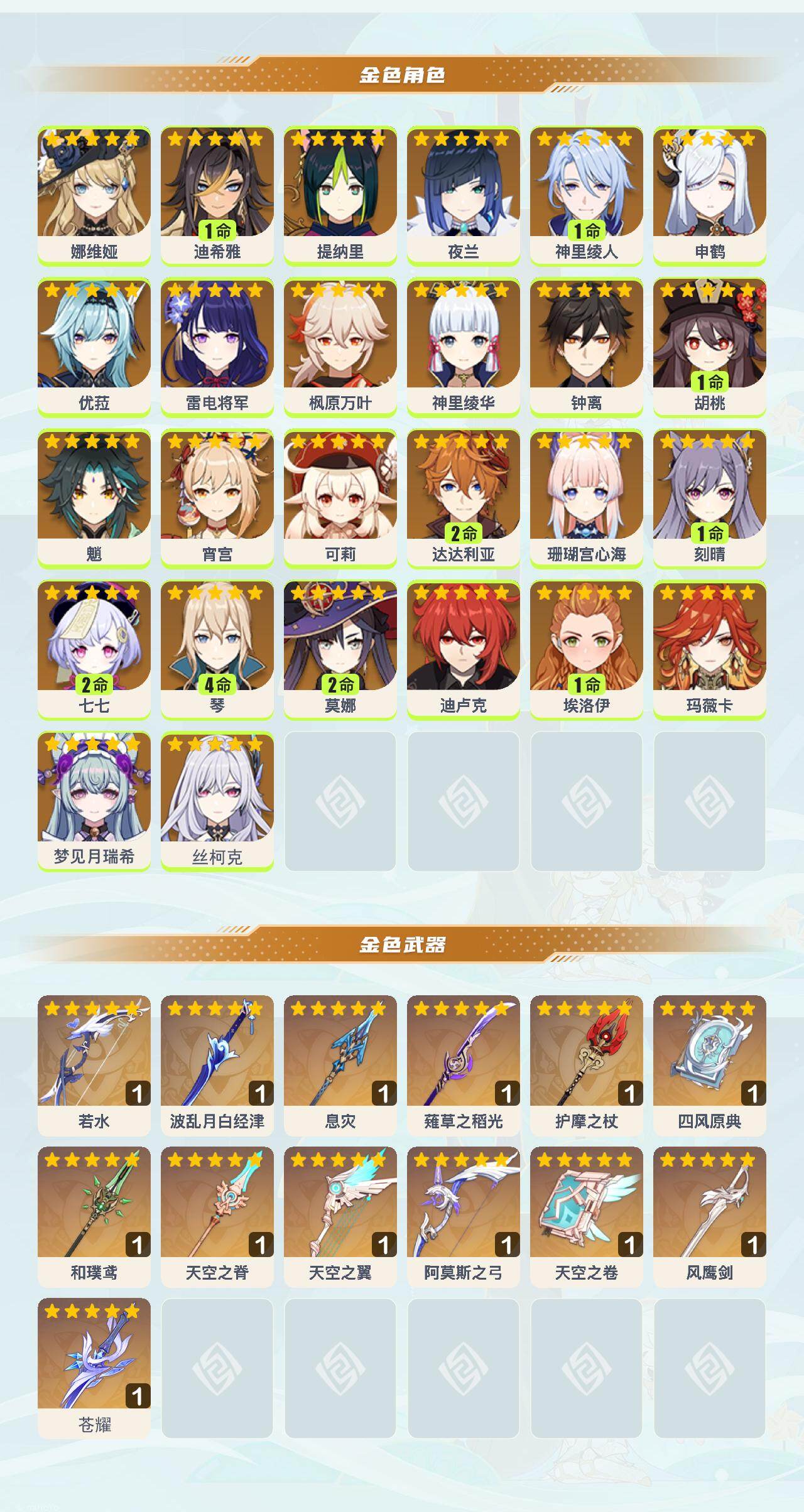 【ysyt799】60级/54黄/女主/26个五星角色/14个五星武器/1命胡桃/0命夜兰/0命钟离/0命玛薇卡/0命丝柯克/0命枫原万叶/4命琴/0命申鹤/0命优菈/0命神里绫华/0命雷电将军/1命神里绫人/0命珊瑚宫心海/2命达达利亚/0命宵宫/0命可莉/2命莫娜/0命娜维娅/0命梦见月瑞希/0命魈/0命提纳里/2命七七/0命埃洛伊/1命刻晴/1命迪希雅/0命迪卢克/精1若水/精1天空之翼/精1四风原典/精1薙草之稻光/精1息灾/精1和璞鸢/精1天空之脊/精1护摩之杖/精1苍耀/精1波乱月白经津/精1风鹰剑/精1阿莫斯之弓/精1天空之卷