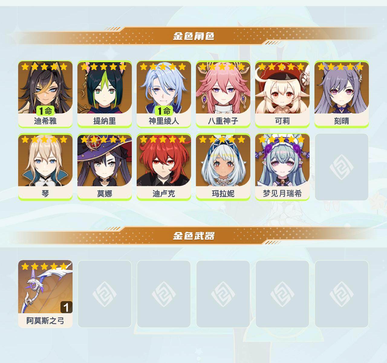 【ysyt792】14黄/男主/11个五星角色/1个五星武器/0命提纳里/1命神里绫人/1命迪希雅/0命玛拉妮/0命可莉/0命琴/0命迪卢克/0命八重神子/0命刻晴/0命梦见月瑞希/0命莫娜/精1阿莫斯之弓