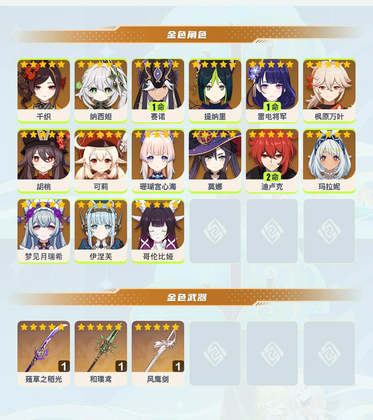 【ysyt789】56级/22黄/女主/15个五星角色/3个五星武器/0命枫原万叶/0命纳西妲/1命雷电将军/0命珊瑚宫心海/0命胡桃/0命玛拉妮/2命迪卢克/0命可莉/0命千织/0命梦见月瑞希/1命赛诺/0命哥伦比娅/0命莫娜/0命提纳里/0命伊涅芙/精1薙草之稻光/精1风鹰剑/精1和璞鸢