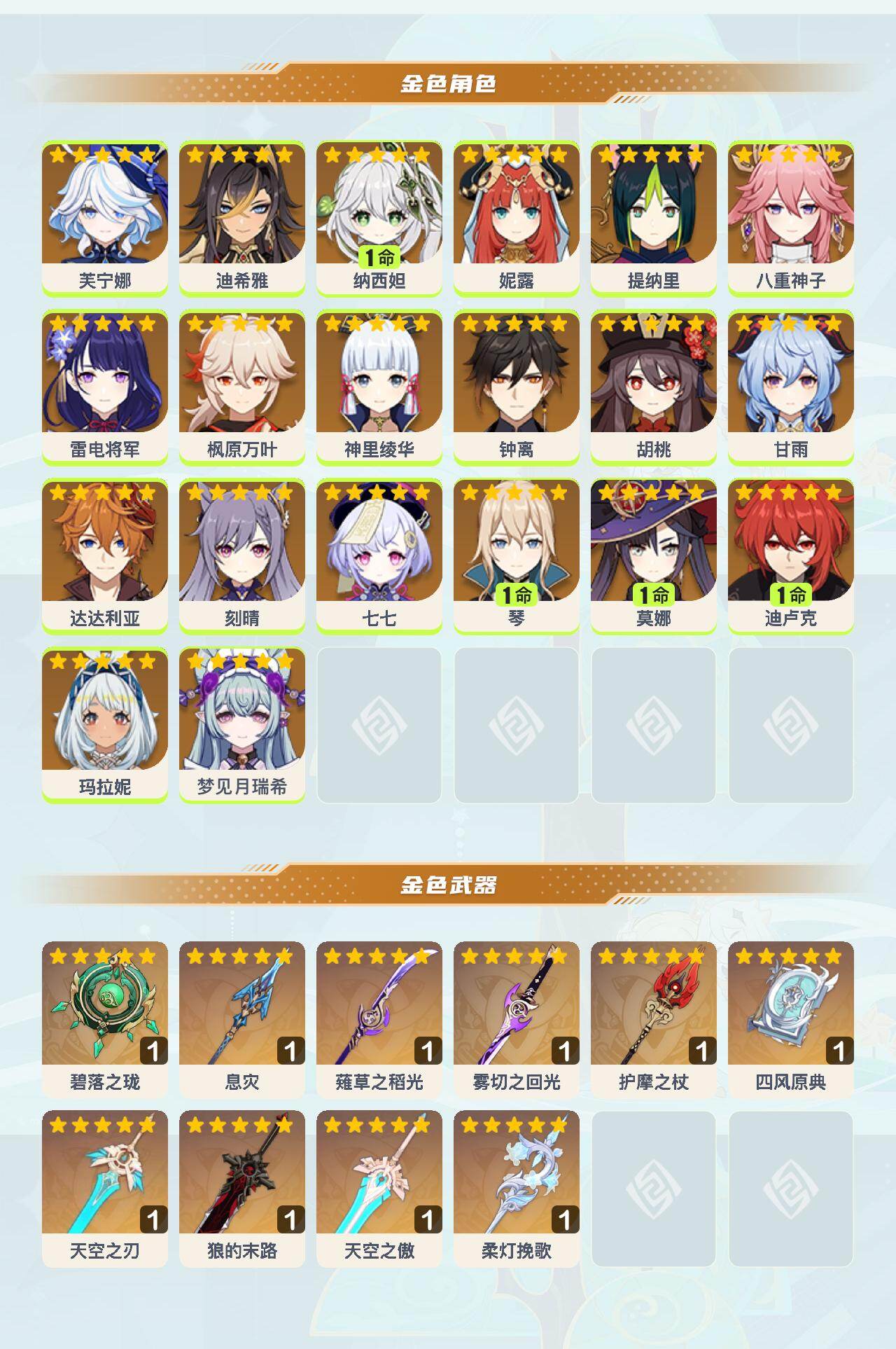 【ysyt779】59级/35黄/女主/20个五星角色/11个五星武器/0命神里绫华/0命玛拉妮/0命雷电将军/0命钟离/0命枫原万叶/0命甘雨/0命八重神子/1命纳西妲/0命妮露/0命达达利亚/0命胡桃/0命刻晴/0命提纳里/0命芙宁娜/1命莫娜/1命迪卢克/0命七七/0命梦见月瑞希/1命琴/0命迪希雅/精1四风原典/精1护摩之杖/精1雾切之回光/精1柔灯挽歌/精1息灾/精1天空之刃/精1狼的末路/精1碧落之珑/精1薙草之稻光/精1天空之傲