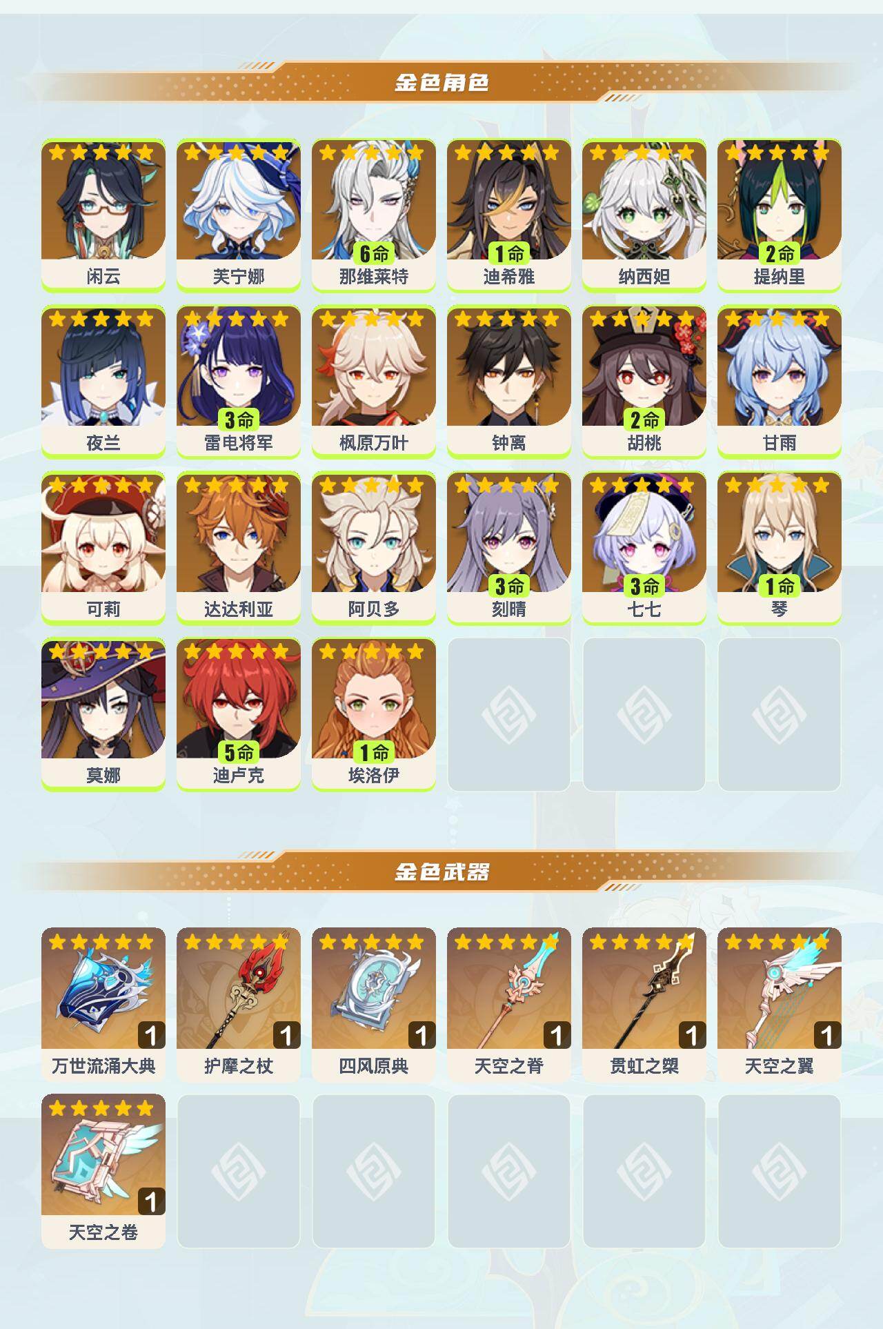 【ysyt771】60级/55黄/女主/21个五星角色/8个五星武器/满命那维莱特/0命芙宁娜/0命枫原万叶/3命雷电将军/0命钟离/0命甘雨/0命纳西妲/0命达达利亚/2命胡桃/5命迪卢克/0命阿贝多/0命闲云/1命琴/3命刻晴/2命提纳里/0命夜兰/0命可莉/3命七七/0命莫娜/1命迪希雅/0命埃洛伊/精1天空之翼/精1万世流涌大典/精1四风原典/精1天空之脊/精1护摩之杖/精1贯虹之槊/精1天空之卷