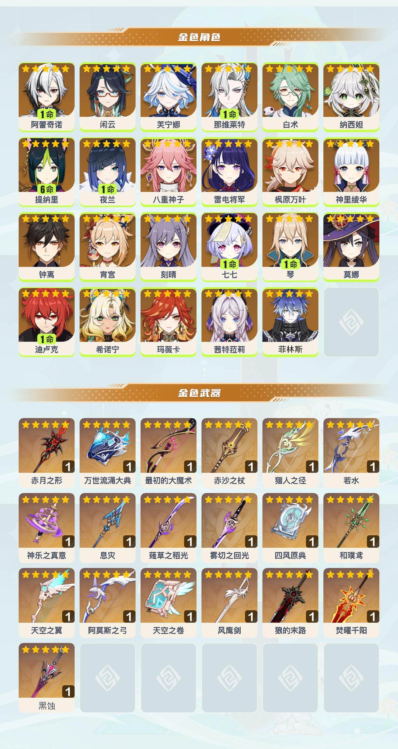 [16499931]60级/61黄/女主/23个五星角色/26个五星武器 1命阿蕾奇诺0命闲云0命芙宁娜1命那维莱特0命白术0命纳西妲满命提纳里1命夜兰0命八重神子0命雷电将军0命枫原万叶0命神里绫华0命钟离0命宵宫0命刻晴1命七七1命琴0命莫娜1命迪卢克0命希诺宁0命玛薇卡0命茜特菈莉0命菲林斯精1赤月之形精1万世流涌大典精1最初的大魔术精1赤沙之杖精1猎人之径精1若水精1神乐之真意精1息灾精1薙草之稻光精1雾切之回光精1四风原典精1和璞鸢精1天空之翼精1阿莫斯之弓精1天空之卷精1风鹰剑精1狼的末路精1焚曜千阳精1黑蚀