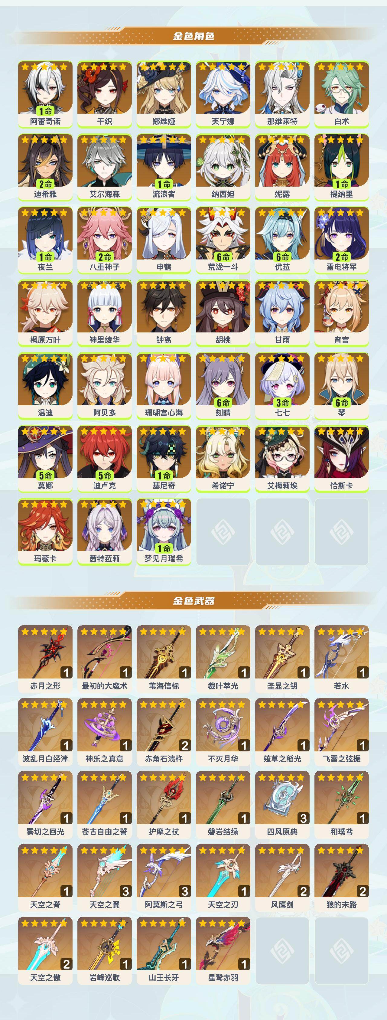 [16504018]【店主推荐捡漏号】60级/136黄/男主/39个五星角色/38个五星武器 1命阿蕾奇诺0命千织0命娜维娅0命芙宁娜0命那维莱特0命白术2命迪希雅0命艾尔海森1命流浪者0命纳西妲0命妮露1命提纳里1命夜兰2命八重神子0命申鹤满命荒泷一斗满命优菈2命雷电将军0命枫原万叶0命神里绫华0命钟离0命胡桃0命甘雨0命宵宫0命温迪0命阿贝多0命珊瑚宫心海满命刻晴3命七七满命琴5命莫娜5命迪卢克1命基尼奇0命希诺宁0命艾梅莉埃0命恰斯卡0命玛薇卡0命茜特菈莉1命梦见月瑞希精1赤月之形精1最初的大魔术精1苇海信标精1裁叶萃光精1圣显之钥精1若水精1波乱月白经津精1神乐之真意精2赤角石溃杵精1不灭月华精1薙草之稻光精1飞雷之弦振精1雾切之回光精1苍古自由之誓精1护摩之杖精1磐岩结绿精3四风原典精1和璞鸢精1天空之脊精3天空之翼精3阿莫斯之弓精1天空之刃精2风鹰剑精2狼的末路精2天空之傲精1岩峰巡歌精1山王长牙精1星鹫赤羽