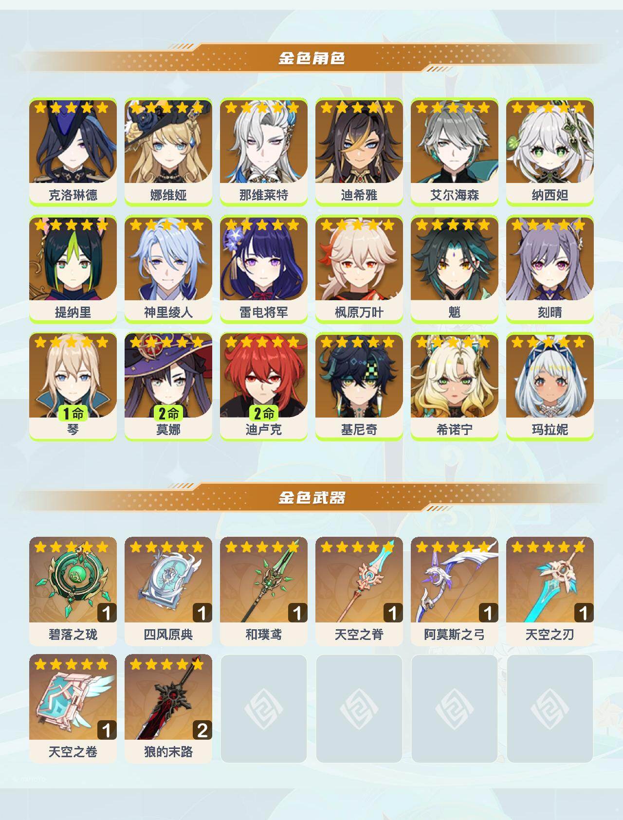 【ysyt790】58级/32黄/女主/18个五星角色/8个五星武器/0命枫原万叶/0命娜维娅/0命魈/0命克洛琳德/0命雷电将军/0命艾尔海森/0命纳西妲/0命提纳里/0命那维莱特/0命希诺宁/0命神里绫人/2命迪卢克/0命玛拉妮/0命基尼奇/2命莫娜/0命刻晴/1命琴/0命迪希雅/精1阿莫斯之弓/精1四风原典/精1和璞鸢/精1天空之脊/精2狼的末路/精1天空之刃/精1碧落之珑/精1天空之卷