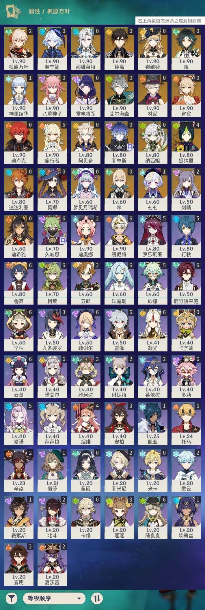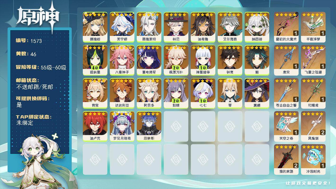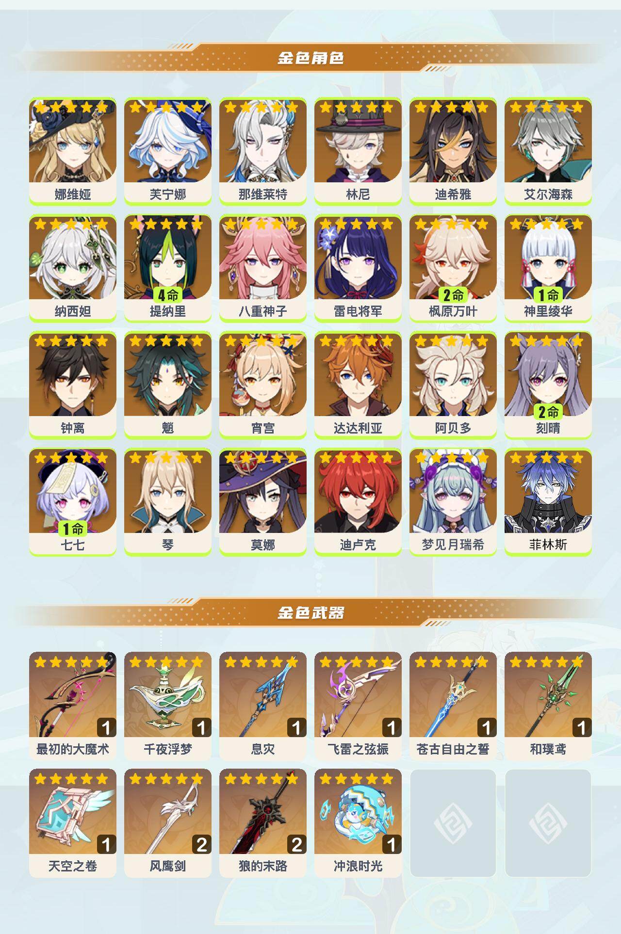 [15780307]60级/46黄/女主/24个五星角色/10个五星武器 0命娜维娅0命芙宁娜0命那维莱特0命林尼0命迪希雅0命艾尔海森0命纳西妲4命提纳里0命八重神子0命雷电将军2命枫原万叶1命神里绫华0命钟离0命魈0命宵宫0命达达利亚0命阿贝多2命刻晴1命七七0命琴0命莫娜0命迪卢克0命梦见月瑞希0命菲林斯精1最初的大魔术精1千夜浮梦精1息灾精1飞雷之弦振精1苍古自由之誓精1和璞鸢精1天空之卷精2风鹰剑精2狼的末路精1冲浪时光