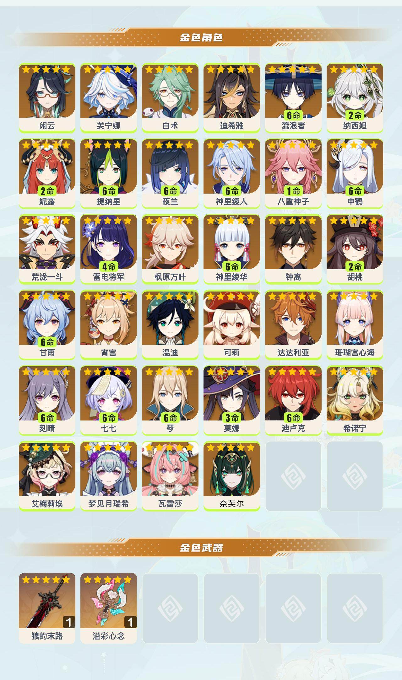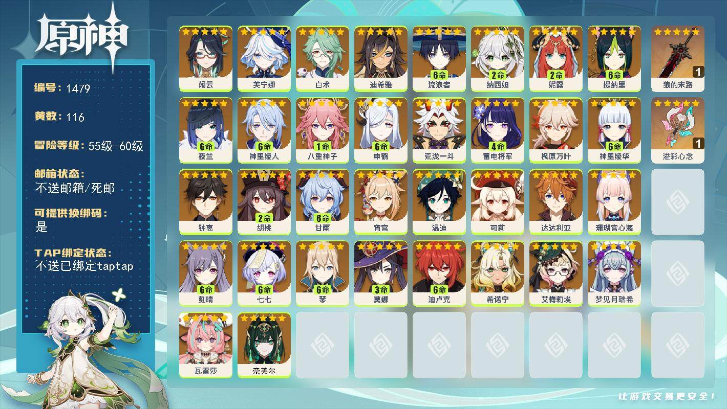 [15575403]60级/116黄/女主/34个五星角色/2个五星武器 0命闲云0命芙宁娜0命白术0命迪希雅满命流浪者2命纳西妲2命妮露满命提纳里满命夜兰满命神里绫人1命八重神子满命申鹤0命荒泷一斗4命雷电将军0命枫原万叶满命神里绫华0命钟离2命胡桃满命甘雨0命宵宫0命温迪0命可莉0命达达利亚0命珊瑚宫心海满命刻晴满命七七满命琴3命莫娜满命迪卢克0命希诺宁0命艾梅莉埃0命梦见月瑞希0命瓦雷莎0命奈芙尔精1狼的末路精1溢彩心念