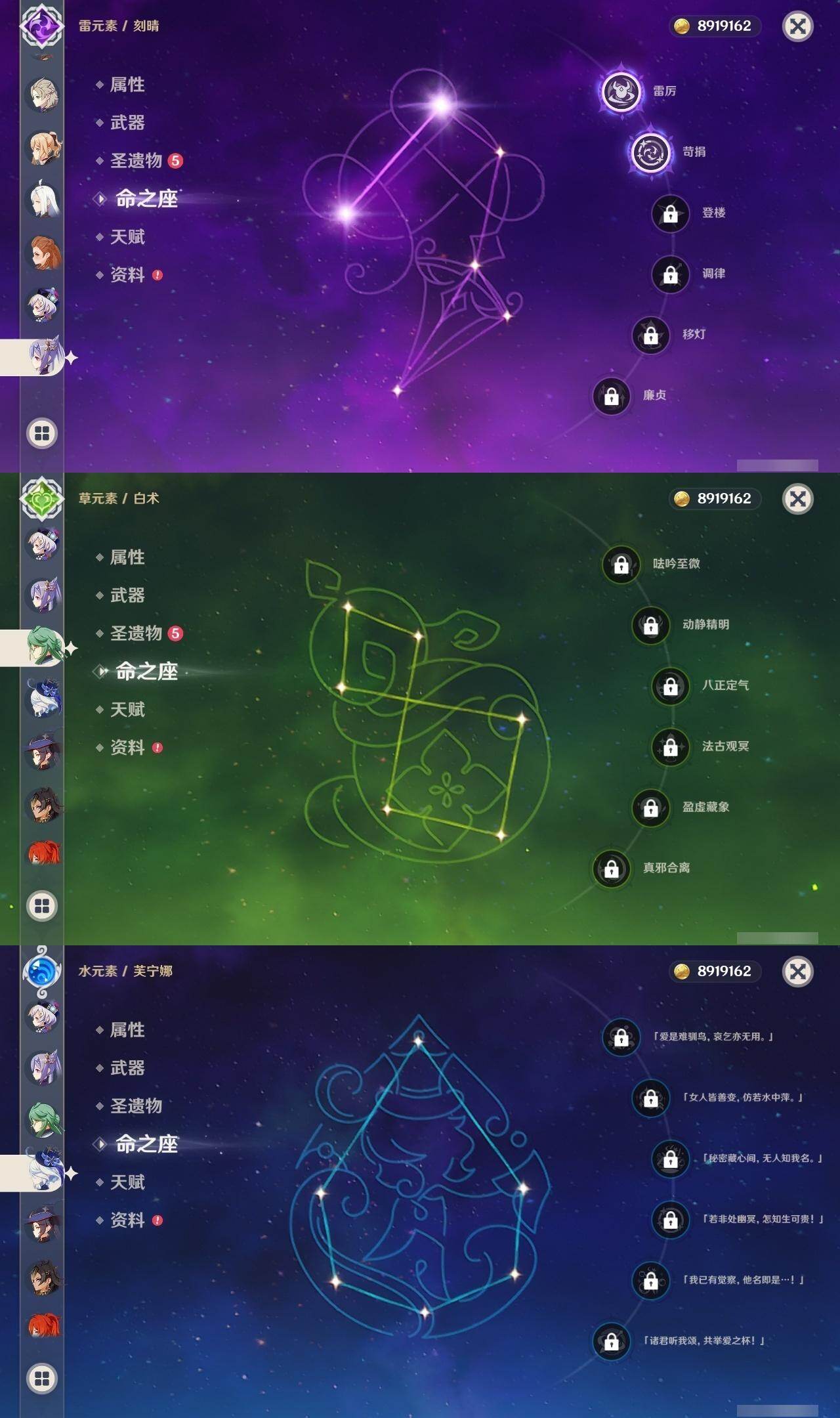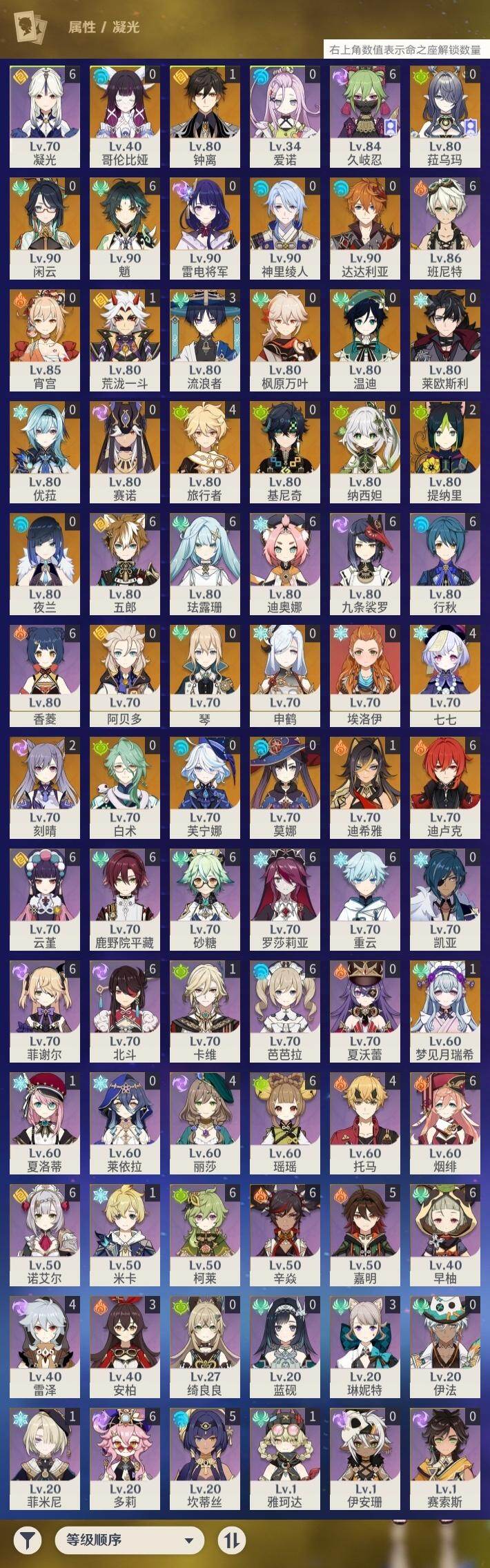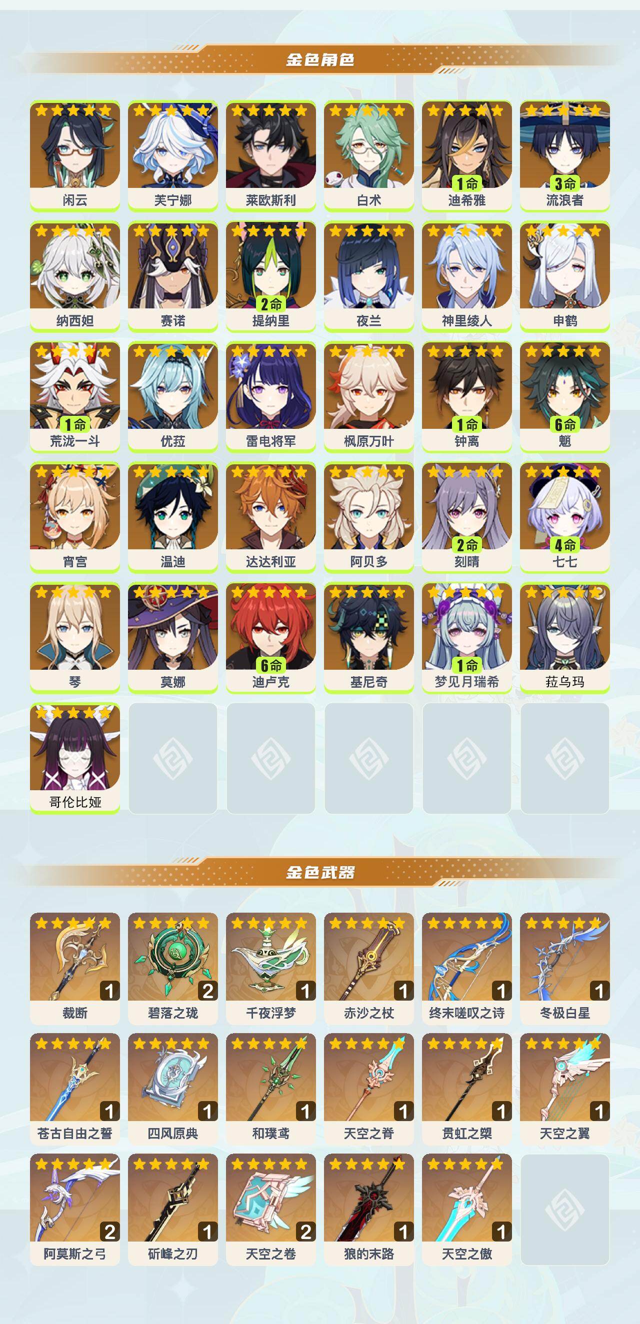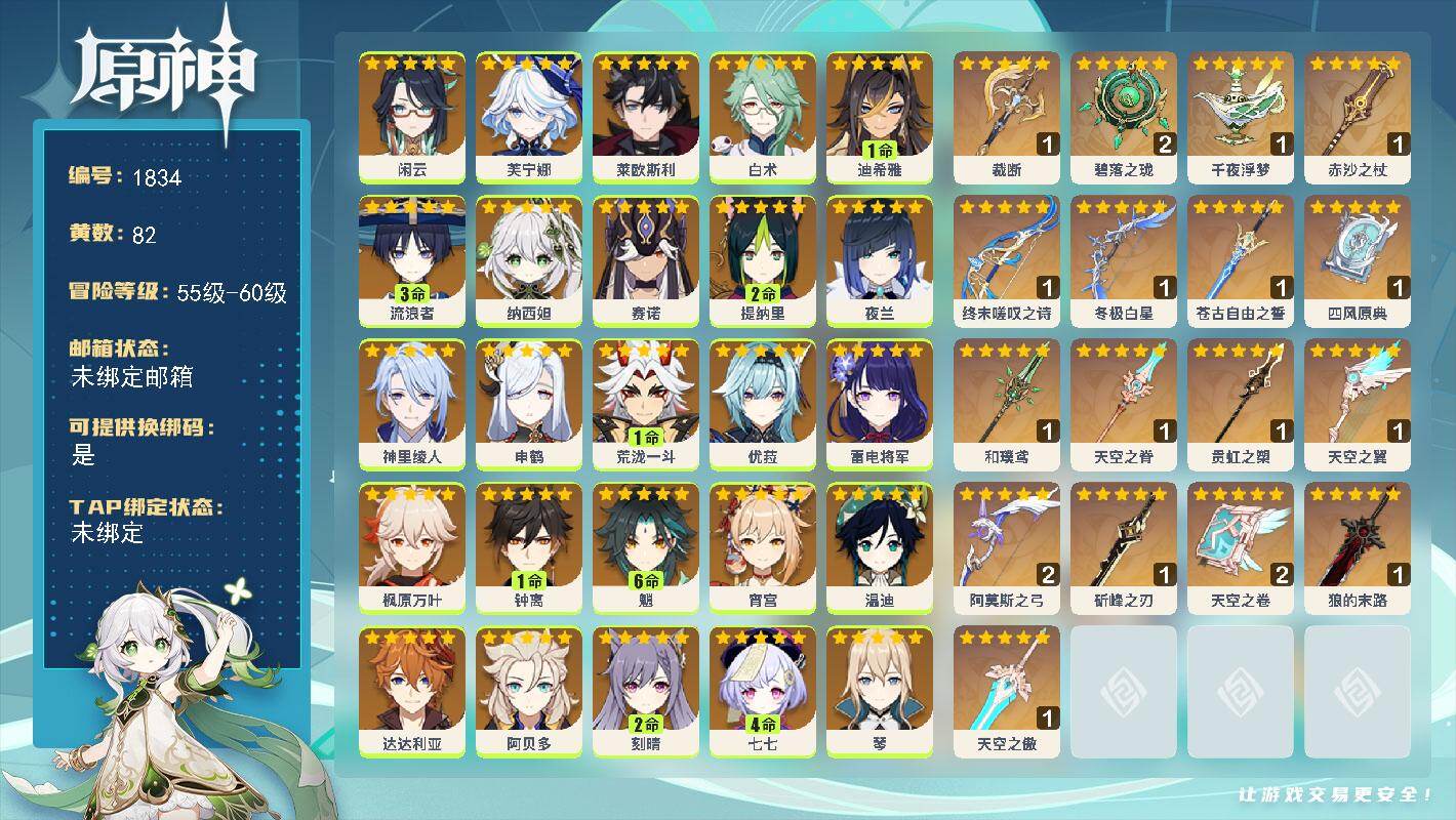 [16515569]60级/82黄/男主/31个五星角色/21个五星武器 0命闲云0命芙宁娜0命莱欧斯利0命白术1命迪希雅3命流浪者0命纳西妲0命赛诺2命提纳里0命夜兰0命神里绫人0命申鹤1命荒泷一斗0命优菈0命雷电将军0命枫原万叶1命钟离满命魈0命宵宫0命温迪0命达达利亚0命阿贝多2命刻晴4命七七0命琴0命莫娜满命迪卢克0命基尼奇1命梦见月瑞希0命菈乌玛0命哥伦比娅精1裁断精2碧落之珑精1千夜浮梦精1赤沙之杖精1终末嗟叹之诗精1冬极白星精1苍古自由之誓精1四风原典精1和璞鸢精1天空之脊精1贯虹之槊精1天空之翼精2阿莫斯之弓精1斫峰之刃精2天空之卷精1狼的末路精1天空之傲