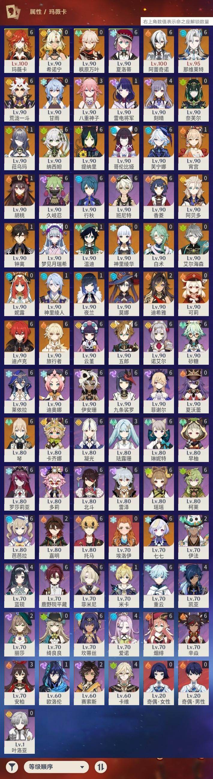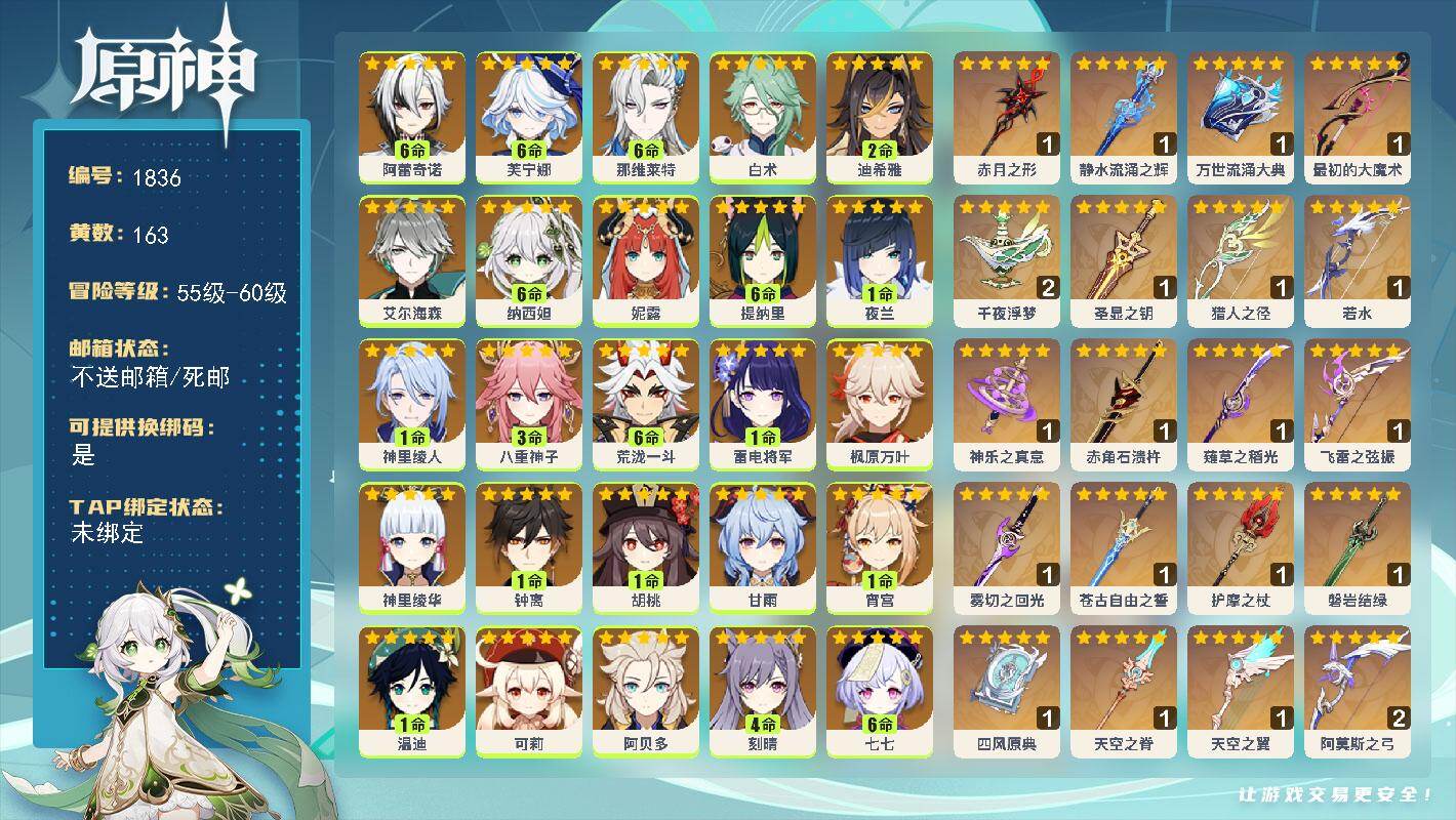 [16516183]60级/163黄/女主/34个五星角色/46个五星武器 满命阿蕾奇诺满命芙宁娜满命那维莱特0命白术2命迪希雅0命艾尔海森满命纳西妲0命妮露满命提纳里1命夜兰1命神里绫人3命八重神子满命荒泷一斗1命雷电将军0命枫原万叶0命神里绫华1命钟离1命胡桃0命甘雨1命宵宫1命温迪0命可莉0命阿贝多4命刻晴满命七七满命琴4命莫娜满命迪卢克0命希诺宁满命玛薇卡0命梦见月瑞希1命菈乌玛0命奈芙尔0命哥伦比娅精1赤月之形精1静水流涌之辉精1万世流涌大典精1最初的大魔术精2千夜浮梦精1圣显之钥精1猎人之径精1若水精1神乐之真意精1赤角石溃杵精1薙草之稻光精1飞雷之弦振精1雾切之回光精1苍古自由之誓精1护摩之杖精1磐岩结绿精1四风原典精1天空之脊精1天空之翼精2阿莫斯之弓精1天空之刃精1天空之卷精1风鹰剑精1狼的末路精1祭星者之望精1焚曜千阳精1纺夜天镜