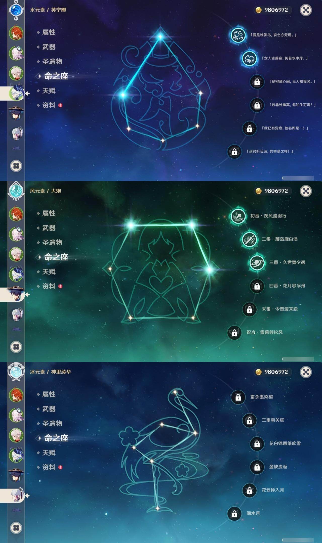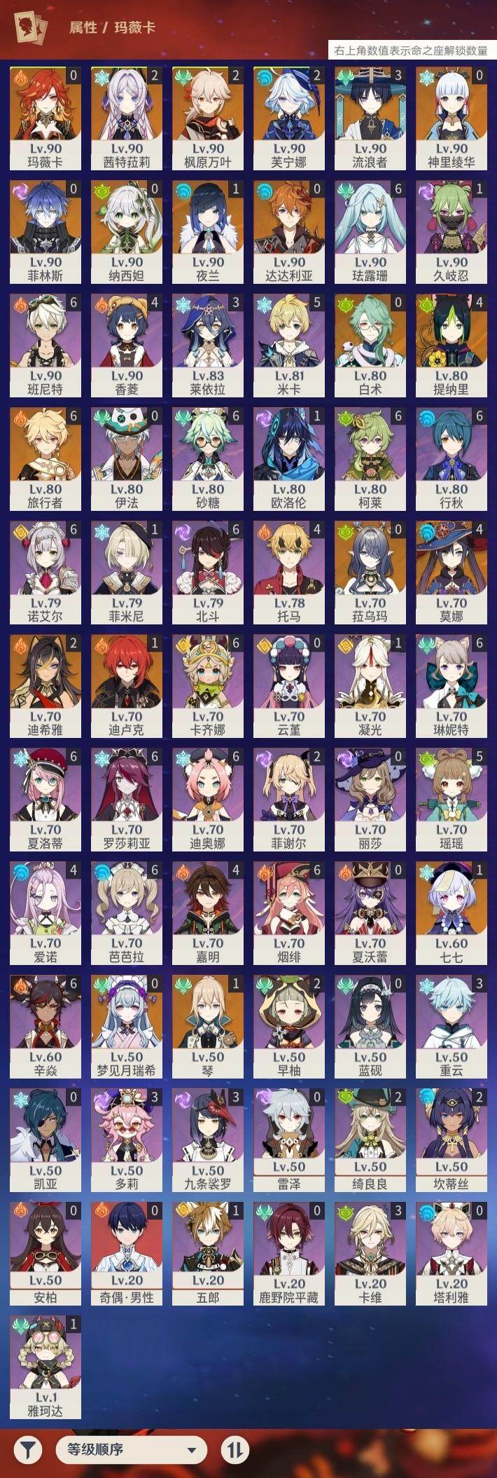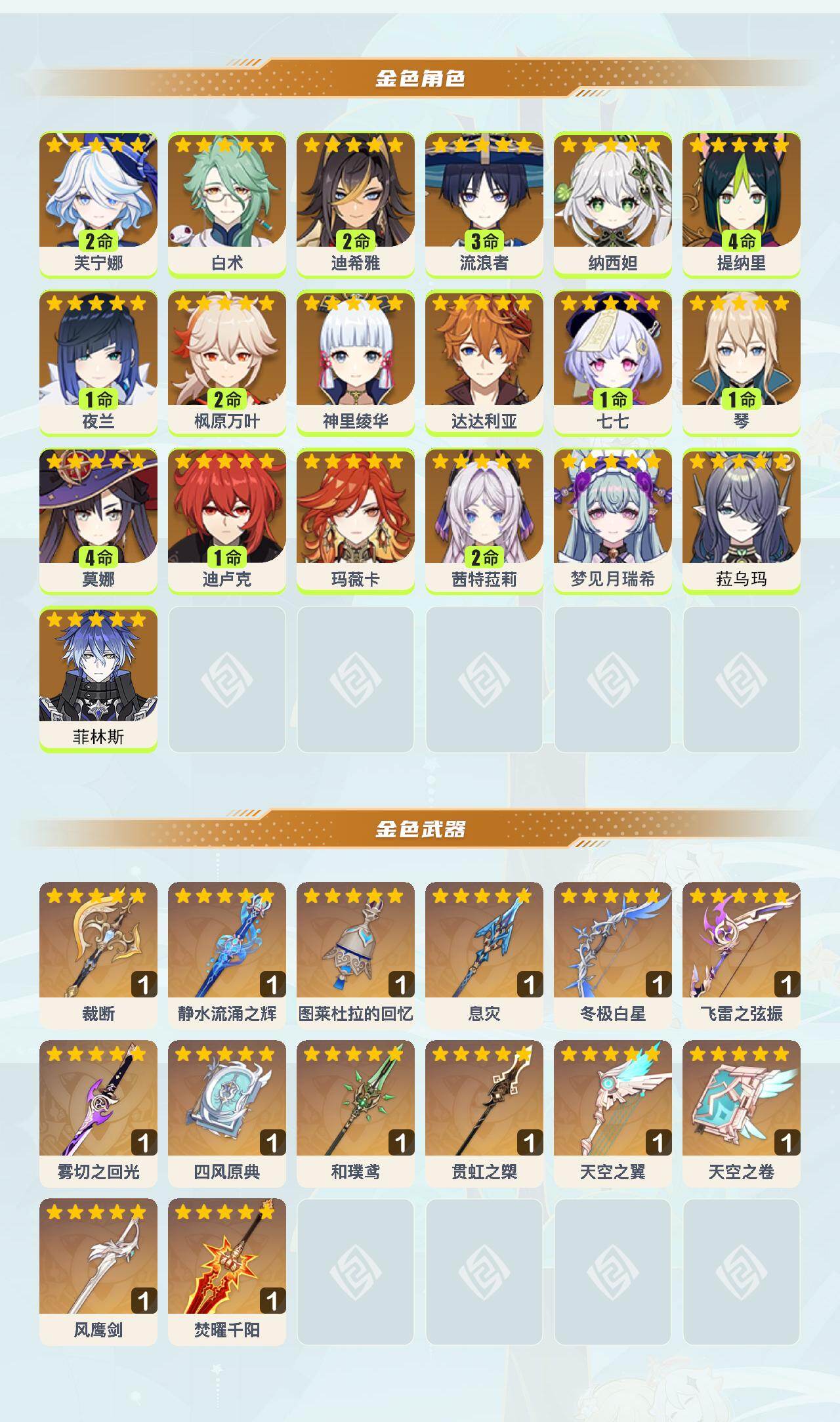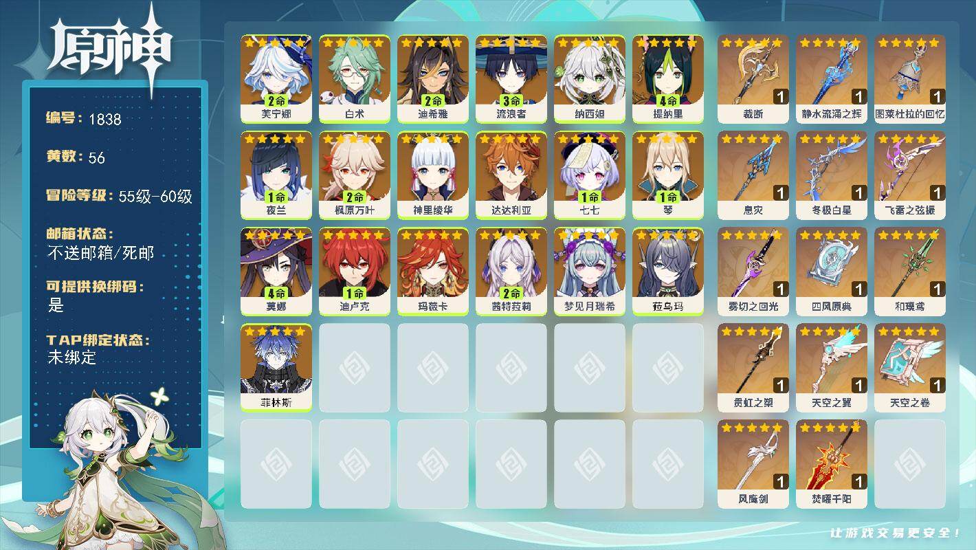 [16516799]60级/56黄/男主/19个五星角色/14个五星武器 2命芙宁娜0命白术2命迪希雅3命流浪者0命纳西妲4命提纳里1命夜兰2命枫原万叶0命神里绫华0命达达利亚1命七七1命琴4命莫娜1命迪卢克0命玛薇卡2命茜特菈莉0命梦见月瑞希0命菈乌玛0命菲林斯精1裁断精1静水流涌之辉精1图莱杜拉的回忆精1息灾精1冬极白星精1飞雷之弦振精1雾切之回光精1四风原典精1和璞鸢精1贯虹之槊精1天空之翼精1天空之卷精1风鹰剑精1焚曜千阳
