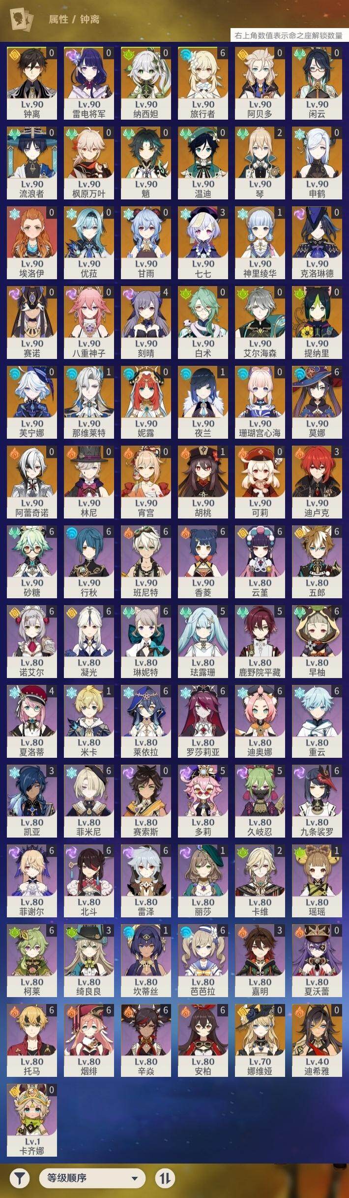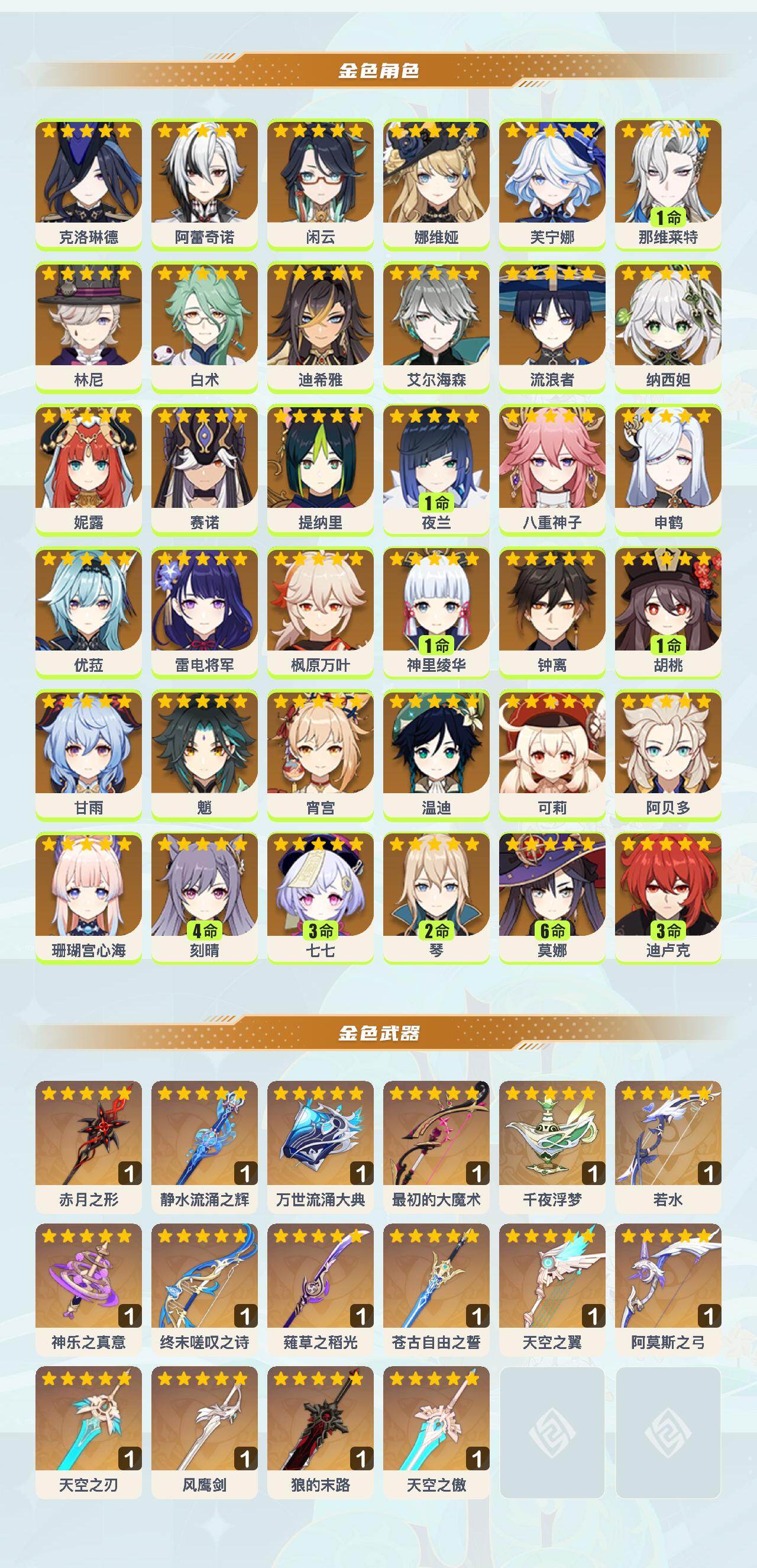 [16517529]60级/81黄/女主/36个五星角色/23个五星武器 0命克洛琳德0命阿蕾奇诺0命闲云0命娜维娅0命芙宁娜1命那维莱特0命林尼0命白术0命迪希雅0命艾尔海森0命流浪者0命纳西妲0命妮露0命赛诺0命提纳里1命夜兰0命八重神子0命申鹤0命优菈0命雷电将军0命枫原万叶1命神里绫华0命钟离1命胡桃0命甘雨0命魈0命宵宫0命温迪0命可莉0命阿贝多0命珊瑚宫心海4命刻晴3命七七2命琴满命莫娜3命迪卢克精1赤月之形精1静水流涌之辉精1万世流涌大典精1最初的大魔术精1千夜浮梦精1若水精1神乐之真意精1终末嗟叹之诗精1薙草之稻光精1苍古自由之誓精1天空之翼精1阿莫斯之弓精1天空之刃精1风鹰剑精1狼的末路精1天空之傲