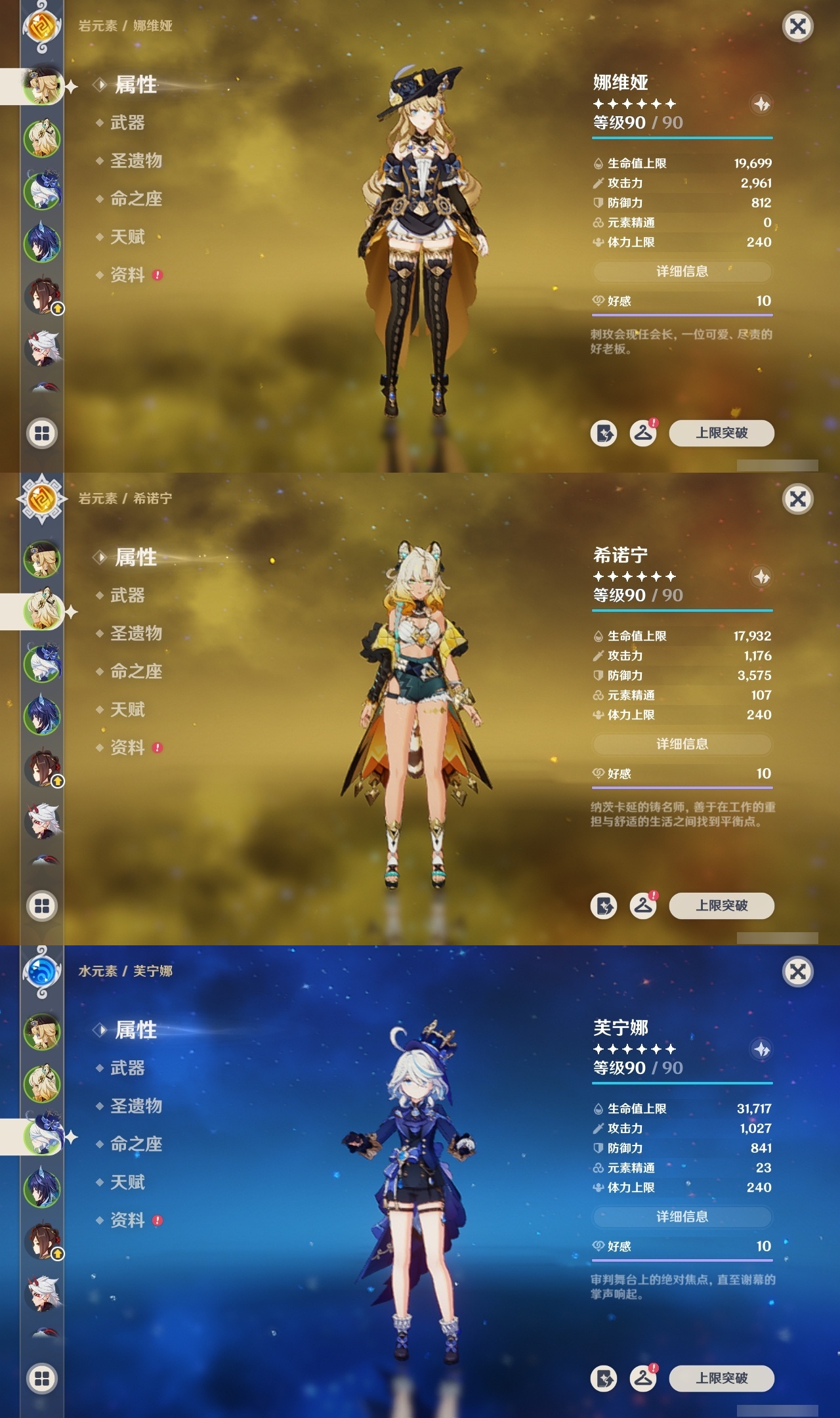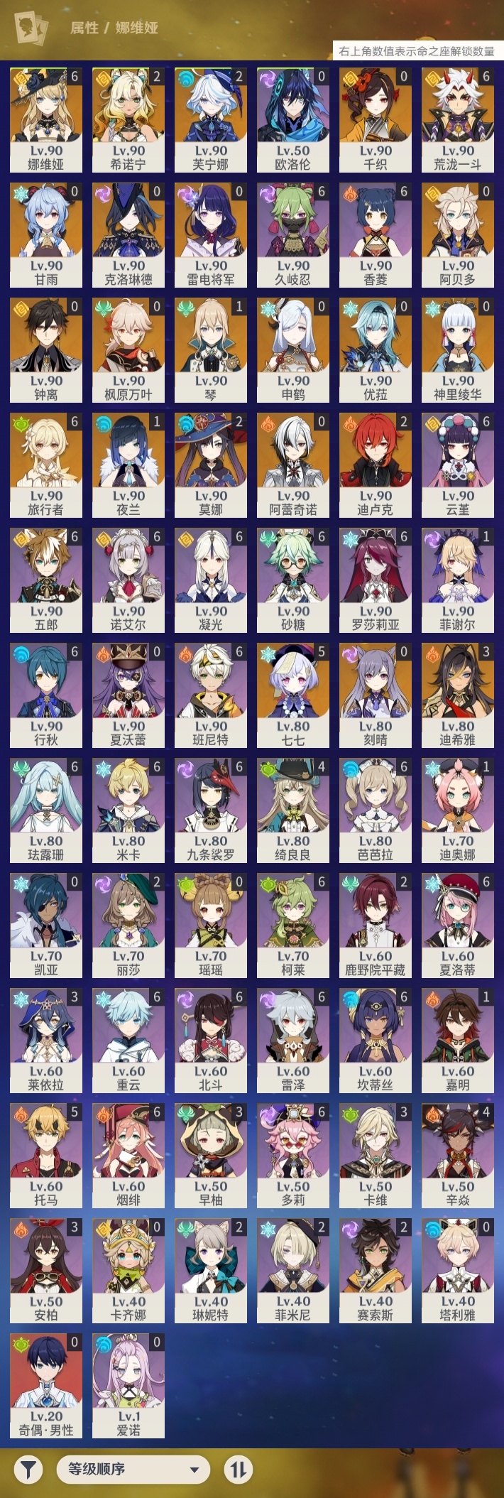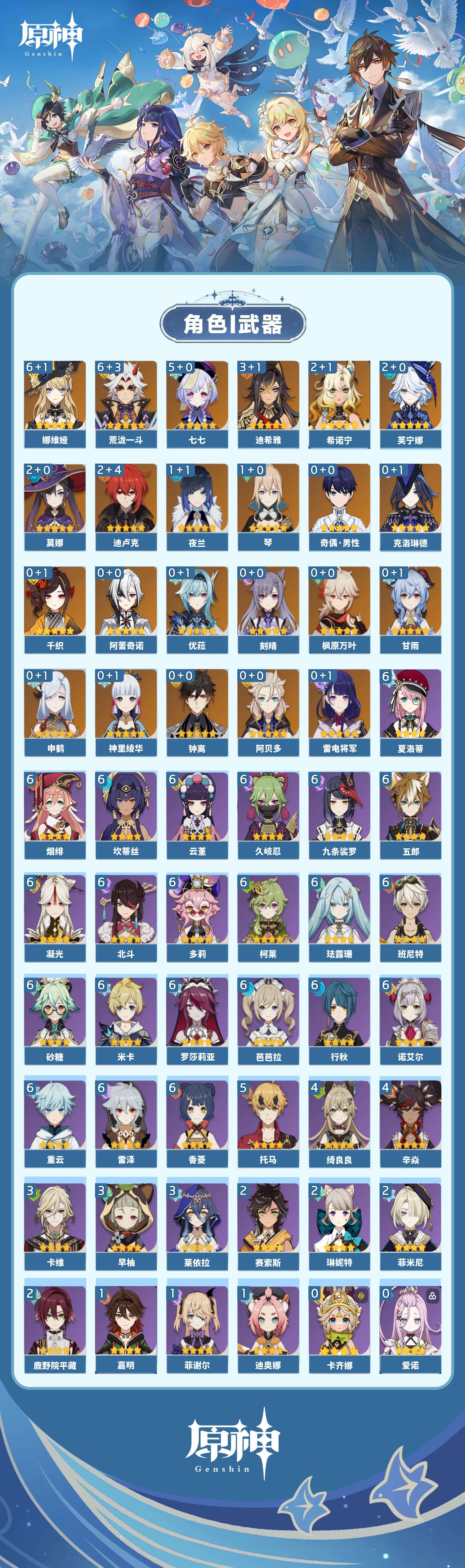 【原神】【lyys11592】冒险等级:60,五星数量:42,五星角色:娜维娅 6命荒泷一斗 6命七七 5命迪希雅 3命希诺宁 2命芙宁娜 2命迪卢克 2命莫娜 2命琴 1命夜兰 1命神里绫华优菈钟离申鹤阿贝多千织阿蕾奇诺枫原万叶甘雨克洛琳德刻晴雷电将军__五星武器:狼的末路 4精赤角石溃杵 3精天空之卷 2精岩峰巡歌苇海信标裁断有乐御簾切图莱杜拉的回忆阿莫斯之弓不灭月华飞雷之弦振风鹰剑护摩之杖松籁响起之时雾切之回光薙草之稻光息灾若水赦罪__四星角色:班尼特 6命行秋 6命九条裟罗 6命香菱 6命久岐忍 6命珐露珊 6命凝光 6命砂糖 6命米卡 6命坎蒂丝 6命多莉 6命柯莱 6命芭芭拉 6命云堇 6命五郎 6命烟绯 6命重云 6命诺艾尔 6命罗莎莉亚 6命雷泽 6命北斗 6命夏洛蒂 6命托马 5命绮良良 4命辛焱 4命莱依拉 3命卡维 3命早柚 3命鹿野院平藏 2命菲米尼 2命琳妮特 2命赛索斯 2命迪奥娜 1命菲谢尔 1命嘉明 1命奇偶·男性卡齐娜瑶瑶欧洛伦夏沃蕾塔利雅爱诺350抽