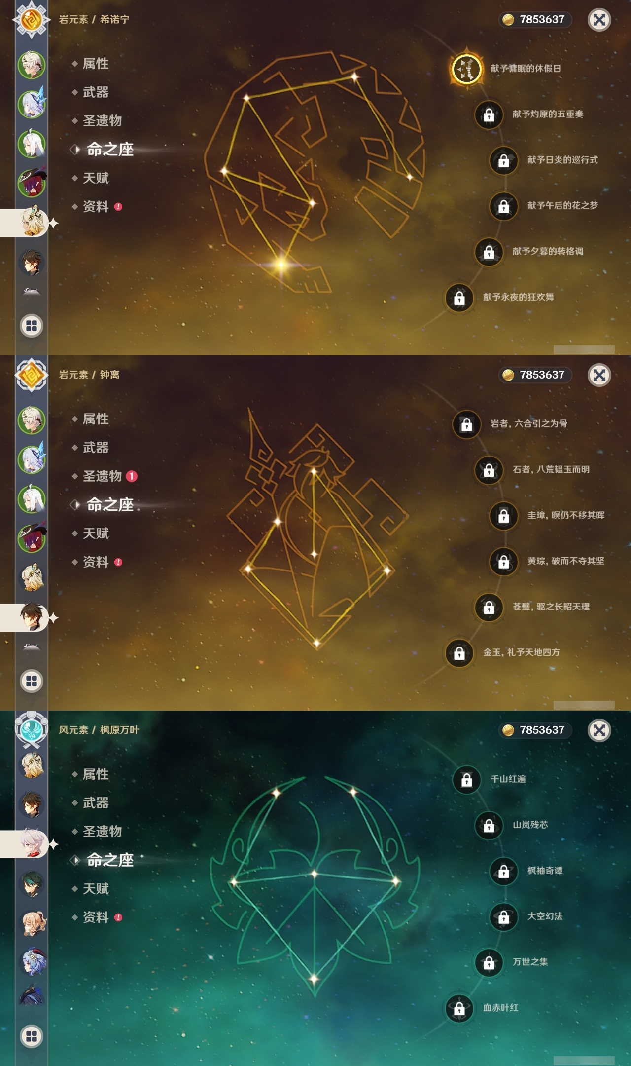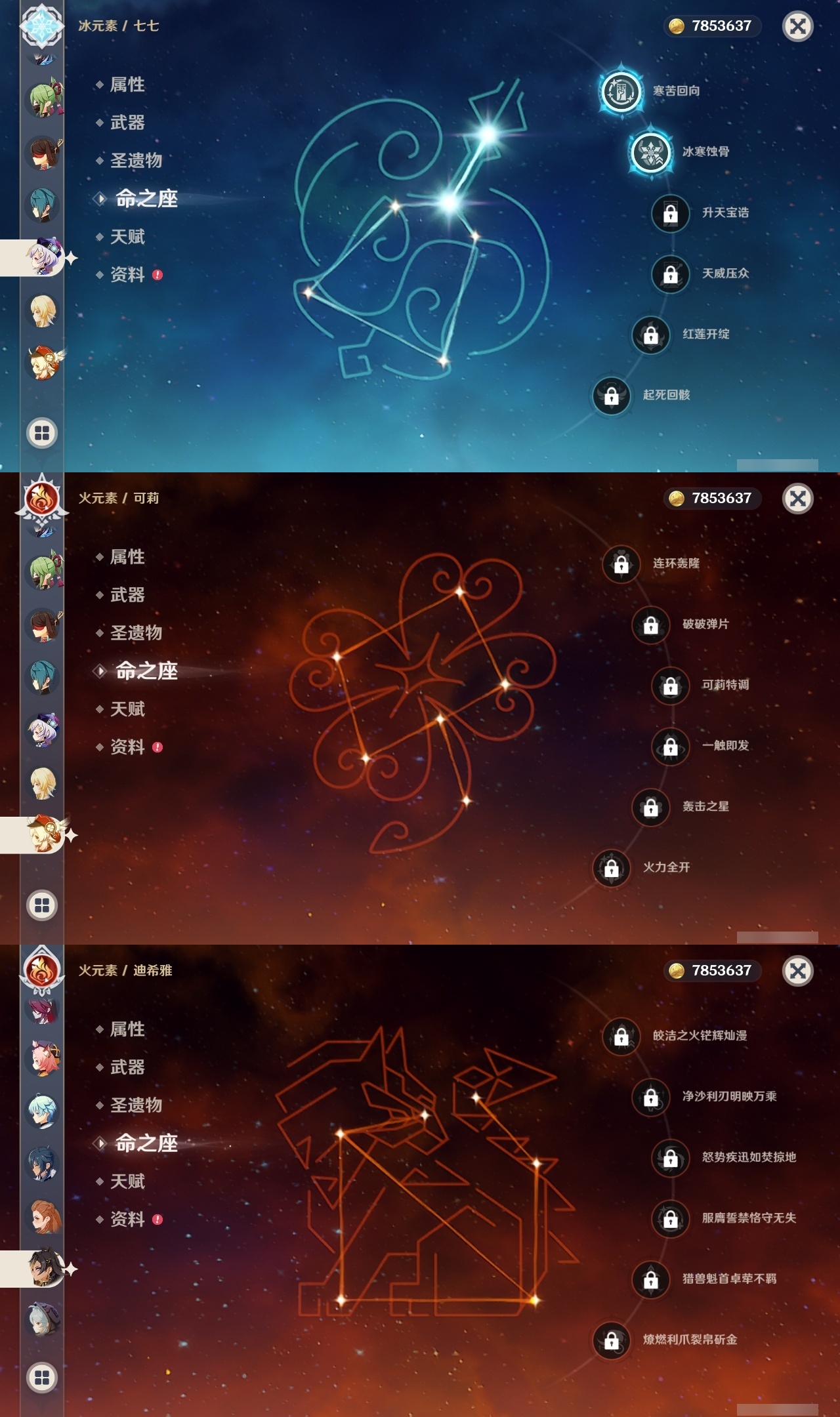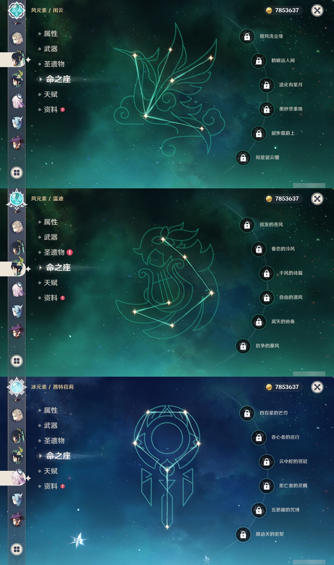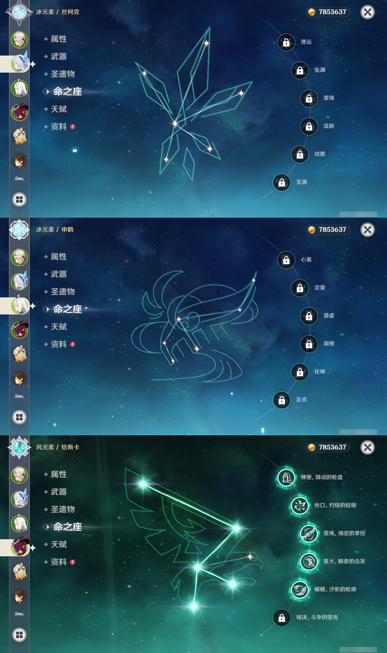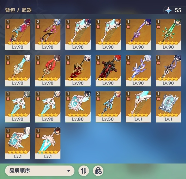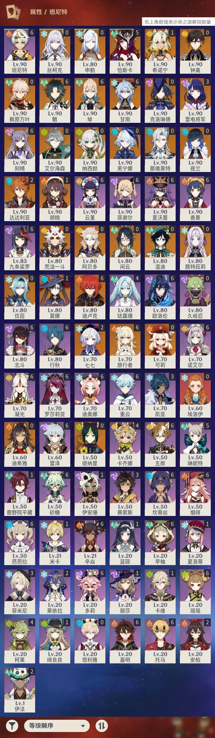 【原神】满命,冒险等级:60,五星数量:48,五星角色:迪卢克 6命甘雨 6命魈 6命刻晴 6命琴 6命恰斯卡 5命雷电将军 3命达达利亚 2命七七 2命希诺宁 1命胡桃 1命莫娜 1命温迪茜特菈莉优菈迪希雅钟离荒泷一斗申鹤阿贝多那维莱特夜兰芙宁娜提纳里闲云丝柯克纳西妲艾尔海森枫原万叶克洛琳德可莉__五星武器:最初的大魔术 2精息灾 2精星鹫赤羽苍耀和璞鸢护摩之杖狼的末路四风原典天空之傲天空之脊天空之卷天空之刃天空之翼薙草之稻光赤角石溃杵赦罪__四星角色:班尼特 6命行秋 6命九条裟罗 6命香菱 6命凝光 6命迪奥娜 6命砂糖 6命瑶瑶 6命坎蒂丝 6命多莉 6命芭芭拉 6命欧洛伦 6命云堇 6命早柚 6命托马 6命五郎 6命烟绯 6命重云 6命辛焱 6命诺艾尔 6命罗莎莉亚 6命雷泽 6命菲谢尔 6命北斗 6命夏沃蕾 6命嘉明 6命琳妮特 5命卡齐娜 4命珐露珊 4命柯莱 4命菲米尼 3命赛索斯 3命莱依拉 2命伊法 2命鹿野院平藏 1命绮良良 1命米卡 1命卡维 1命蓝砚 1命夏洛蒂 1命伊安珊 1命埃洛伊久岐忍塔利雅