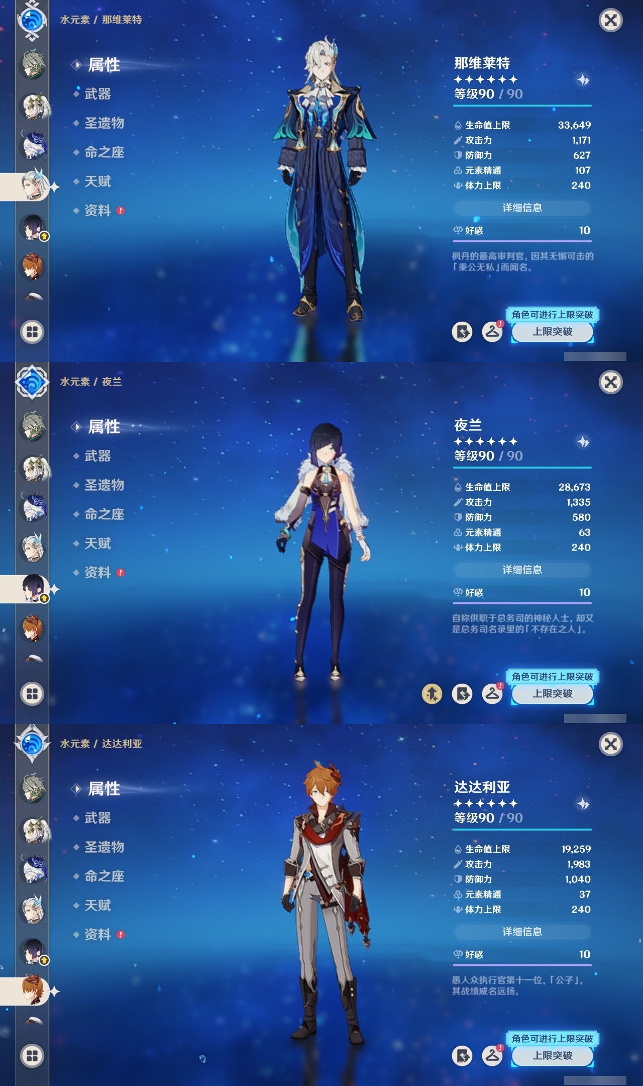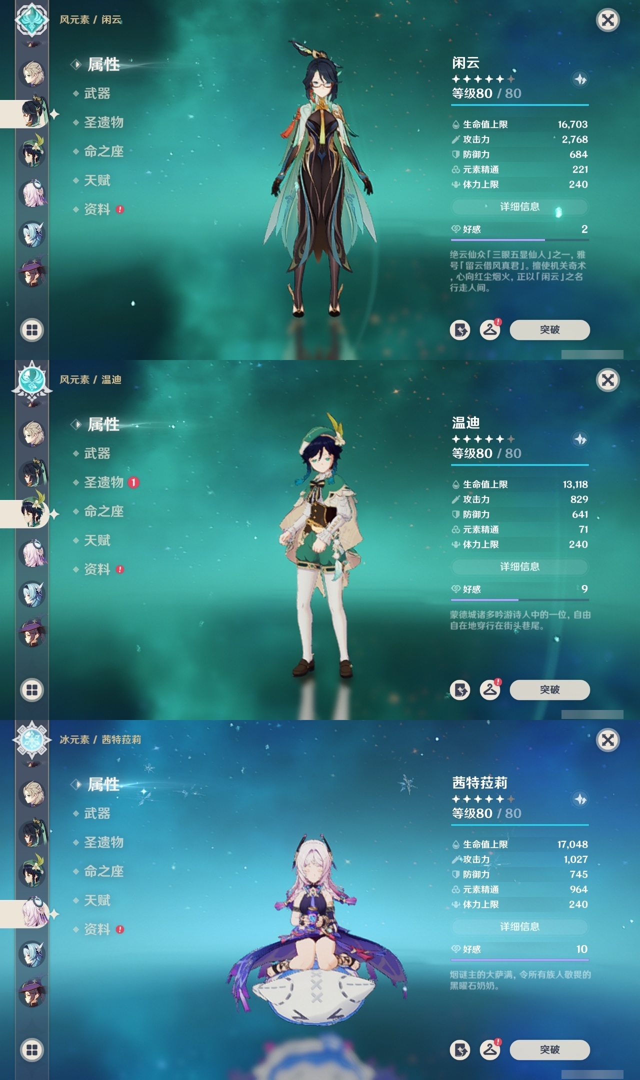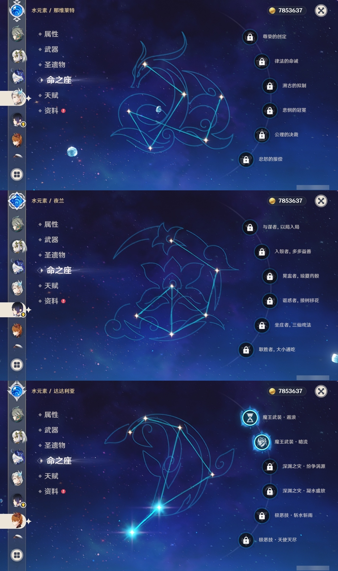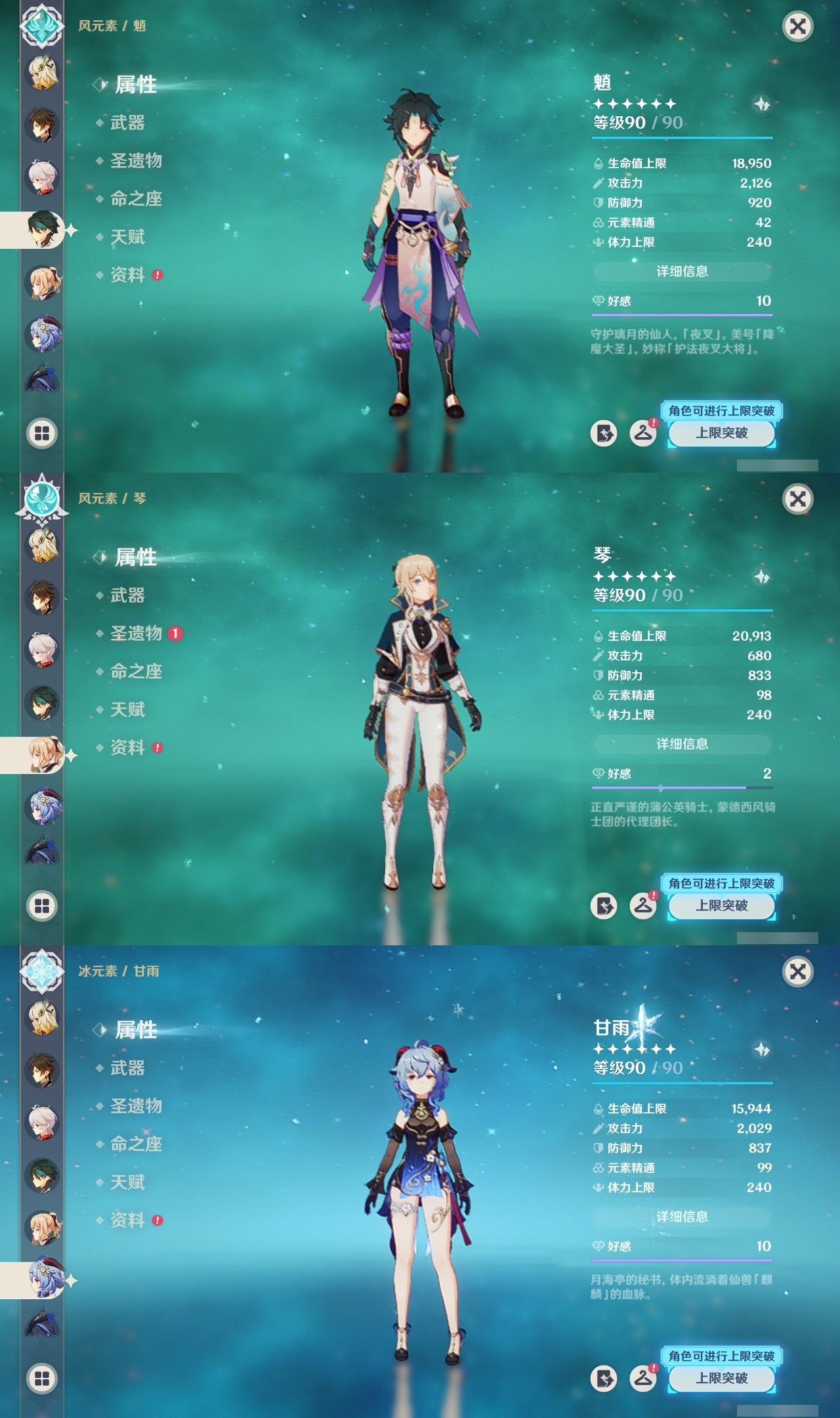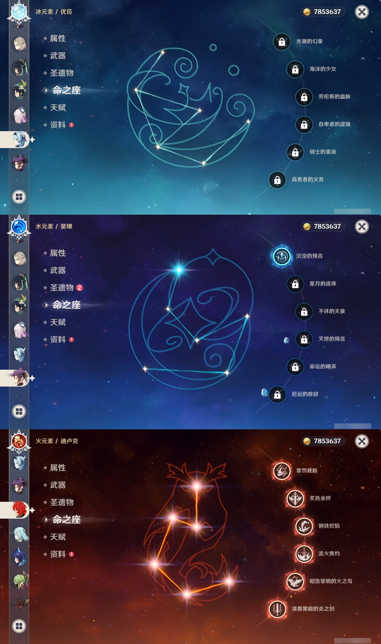 【原神】满命,冒险等级:60,五星数量:48,五星角色:迪卢克 6命甘雨 6命魈 6命刻晴 6命琴 6命恰斯卡 5命雷电将军 3命达达利亚 2命七七 2命希诺宁 1命胡桃 1命莫娜 1命温迪茜特菈莉优菈迪希雅钟离荒泷一斗申鹤阿贝多那维莱特夜兰芙宁娜提纳里闲云丝柯克纳西妲艾尔海森枫原万叶克洛琳德可莉__五星武器:最初的大魔术 2精息灾 2精星鹫赤羽苍耀和璞鸢护摩之杖狼的末路四风原典天空之傲天空之脊天空之卷天空之刃天空之翼薙草之稻光赤角石溃杵赦罪__四星角色:班尼特 6命行秋 6命九条裟罗 6命香菱 6命凝光 6命迪奥娜 6命砂糖 6命瑶瑶 6命坎蒂丝 6命多莉 6命芭芭拉 6命欧洛伦 6命云堇 6命早柚 6命托马 6命五郎 6命烟绯 6命重云 6命辛焱 6命诺艾尔 6命罗莎莉亚 6命雷泽 6命菲谢尔 6命北斗 6命夏沃蕾 6命嘉明 6命琳妮特 5命卡齐娜 4命珐露珊 4命柯莱 4命菲米尼 3命赛索斯 3命莱依拉 2命伊法 2命鹿野院平藏 1命绮良良 1命米卡 1命卡维 1命蓝砚 1命夏洛蒂 1命伊安珊 1命埃洛伊久岐忍塔利雅