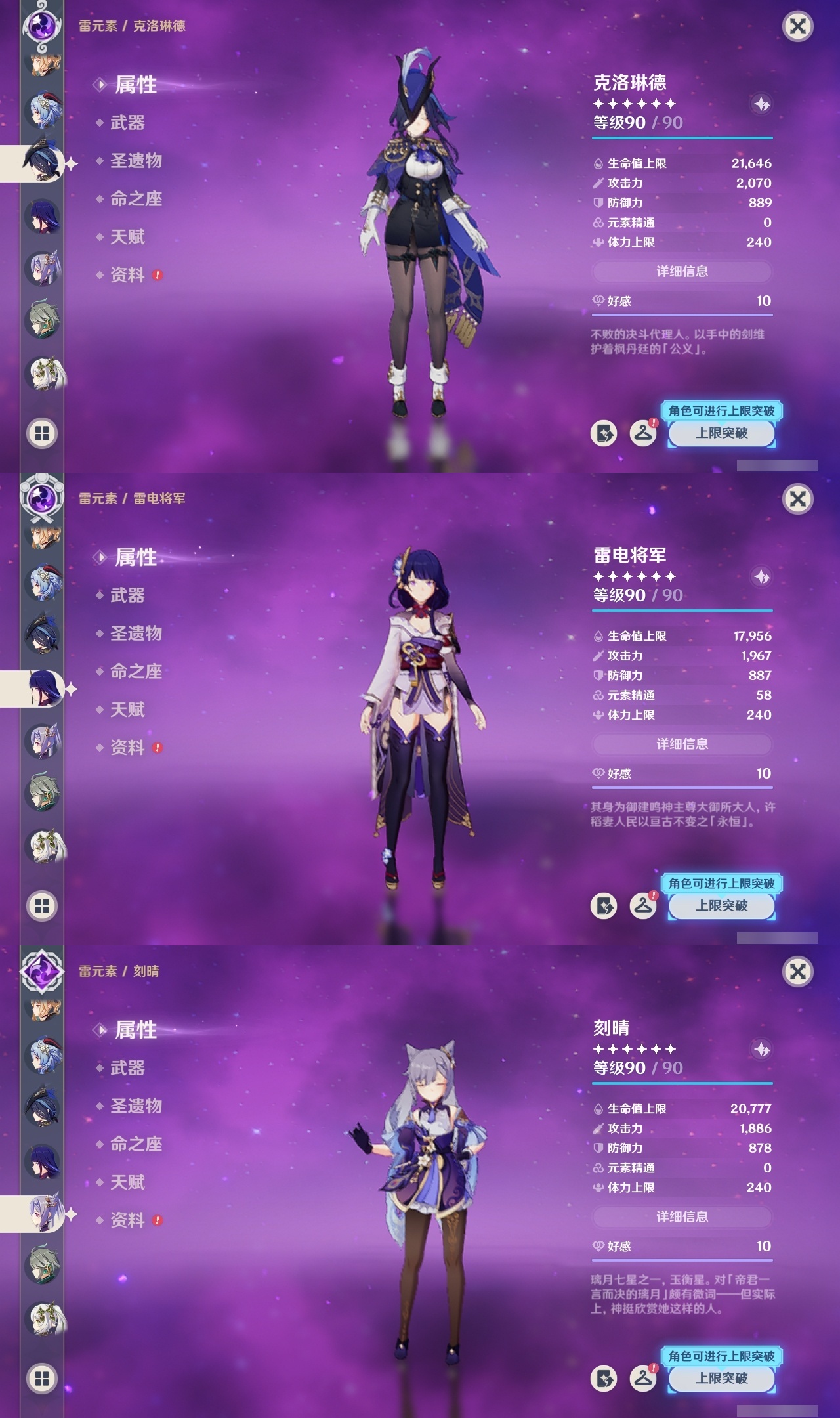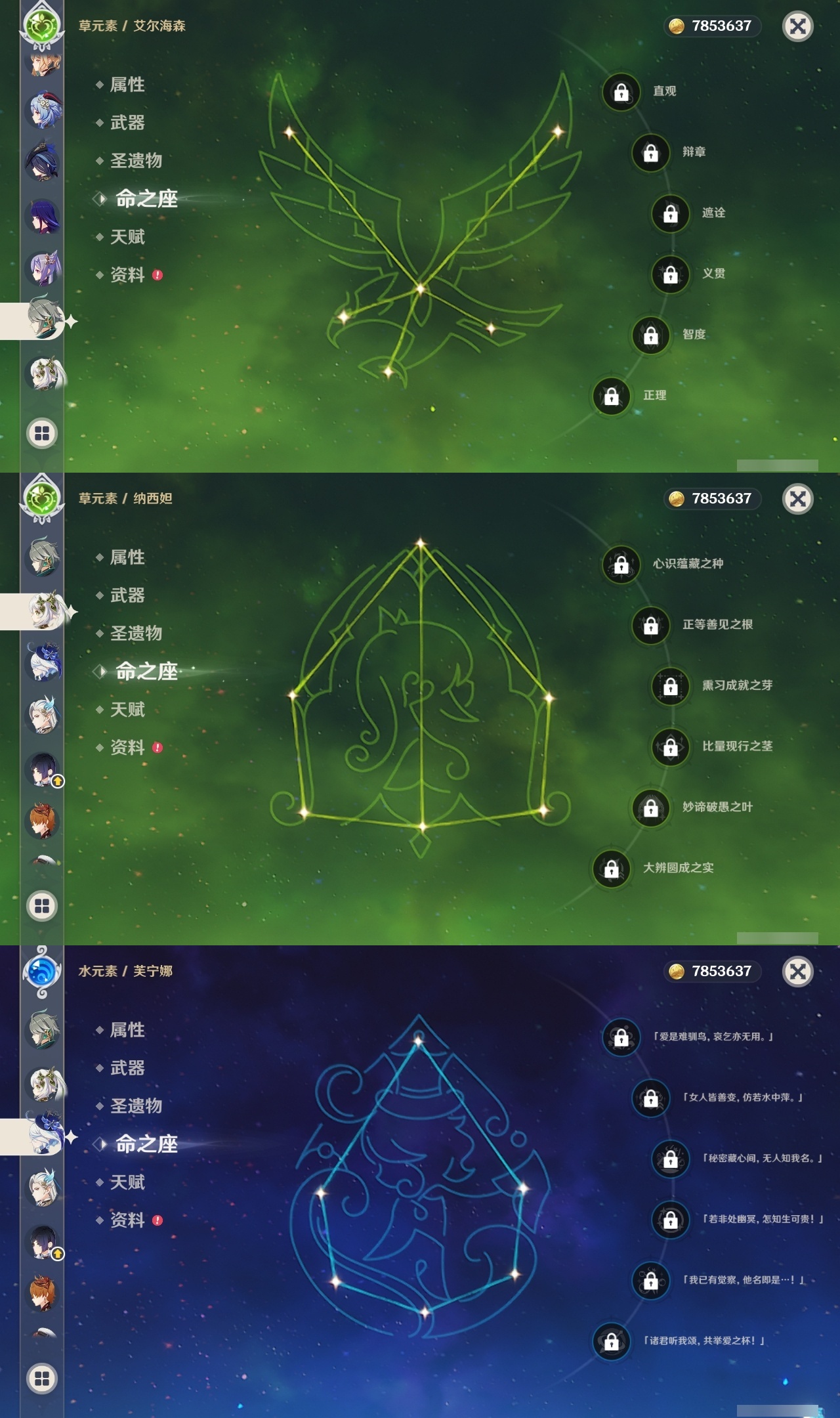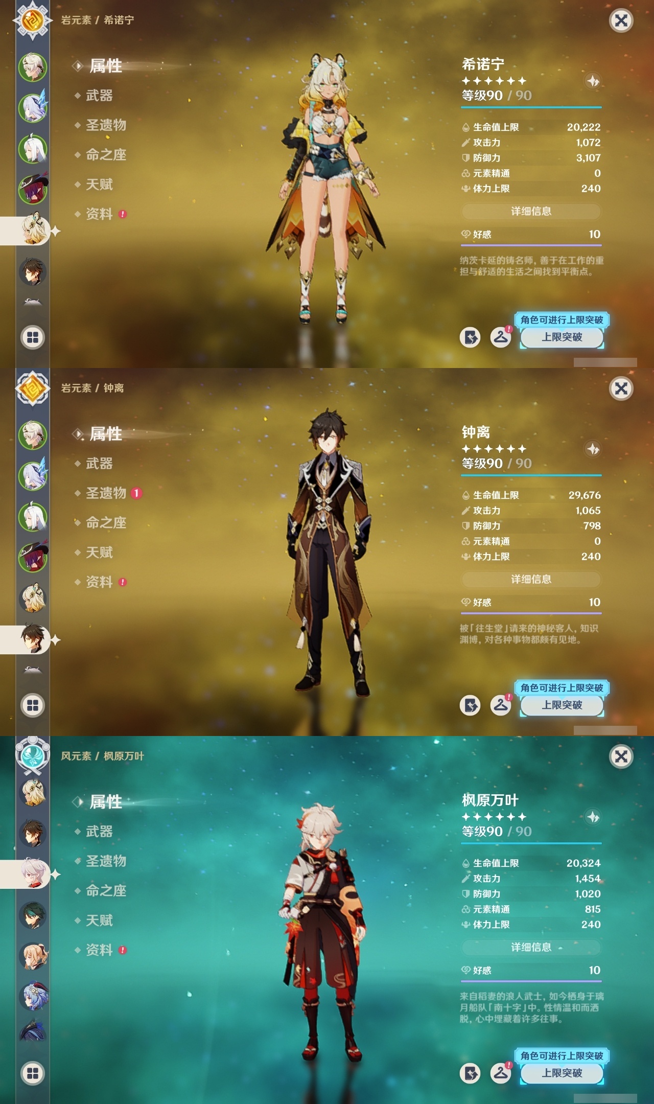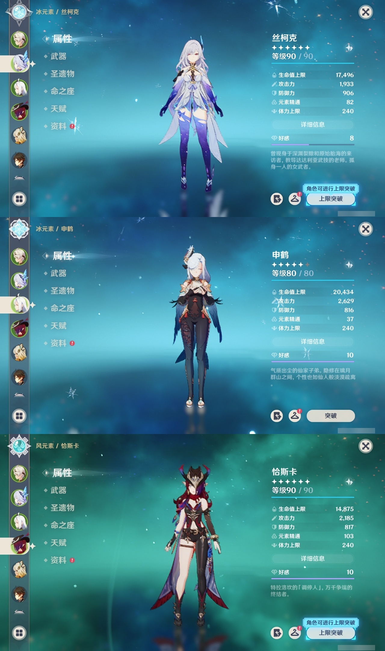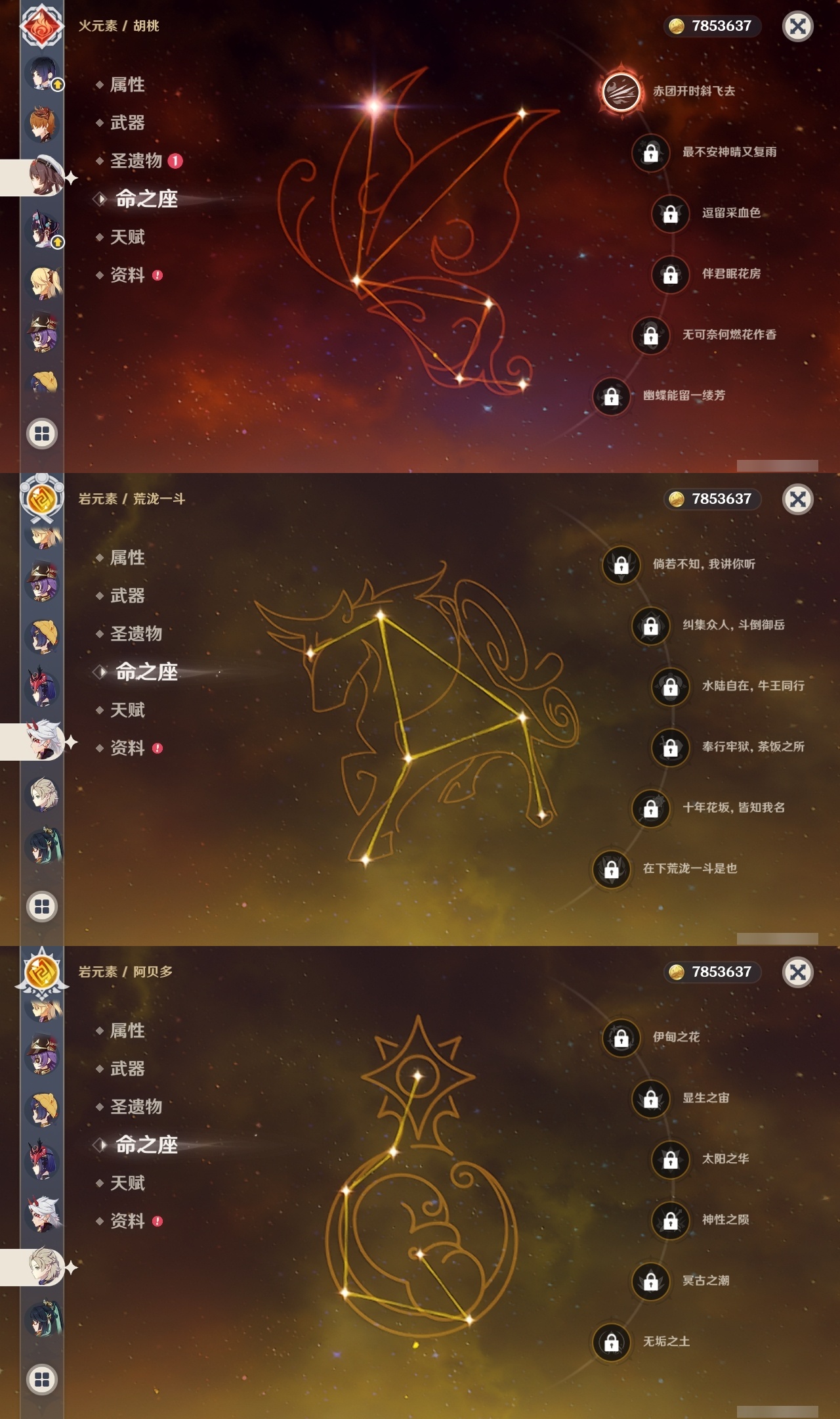 【原神】满命,冒险等级:60,五星数量:48,五星角色:迪卢克 6命甘雨 6命魈 6命刻晴 6命琴 6命恰斯卡 5命雷电将军 3命达达利亚 2命七七 2命希诺宁 1命胡桃 1命莫娜 1命温迪茜特菈莉优菈迪希雅钟离荒泷一斗申鹤阿贝多那维莱特夜兰芙宁娜提纳里闲云丝柯克纳西妲艾尔海森枫原万叶克洛琳德可莉__五星武器:最初的大魔术 2精息灾 2精星鹫赤羽苍耀和璞鸢护摩之杖狼的末路四风原典天空之傲天空之脊天空之卷天空之刃天空之翼薙草之稻光赤角石溃杵赦罪__四星角色:班尼特 6命行秋 6命九条裟罗 6命香菱 6命凝光 6命迪奥娜 6命砂糖 6命瑶瑶 6命坎蒂丝 6命多莉 6命芭芭拉 6命欧洛伦 6命云堇 6命早柚 6命托马 6命五郎 6命烟绯 6命重云 6命辛焱 6命诺艾尔 6命罗莎莉亚 6命雷泽 6命菲谢尔 6命北斗 6命夏沃蕾 6命嘉明 6命琳妮特 5命卡齐娜 4命珐露珊 4命柯莱 4命菲米尼 3命赛索斯 3命莱依拉 2命伊法 2命鹿野院平藏 1命绮良良 1命米卡 1命卡维 1命蓝砚 1命夏洛蒂 1命伊安珊 1命埃洛伊久岐忍塔利雅
